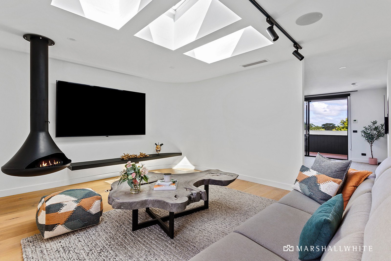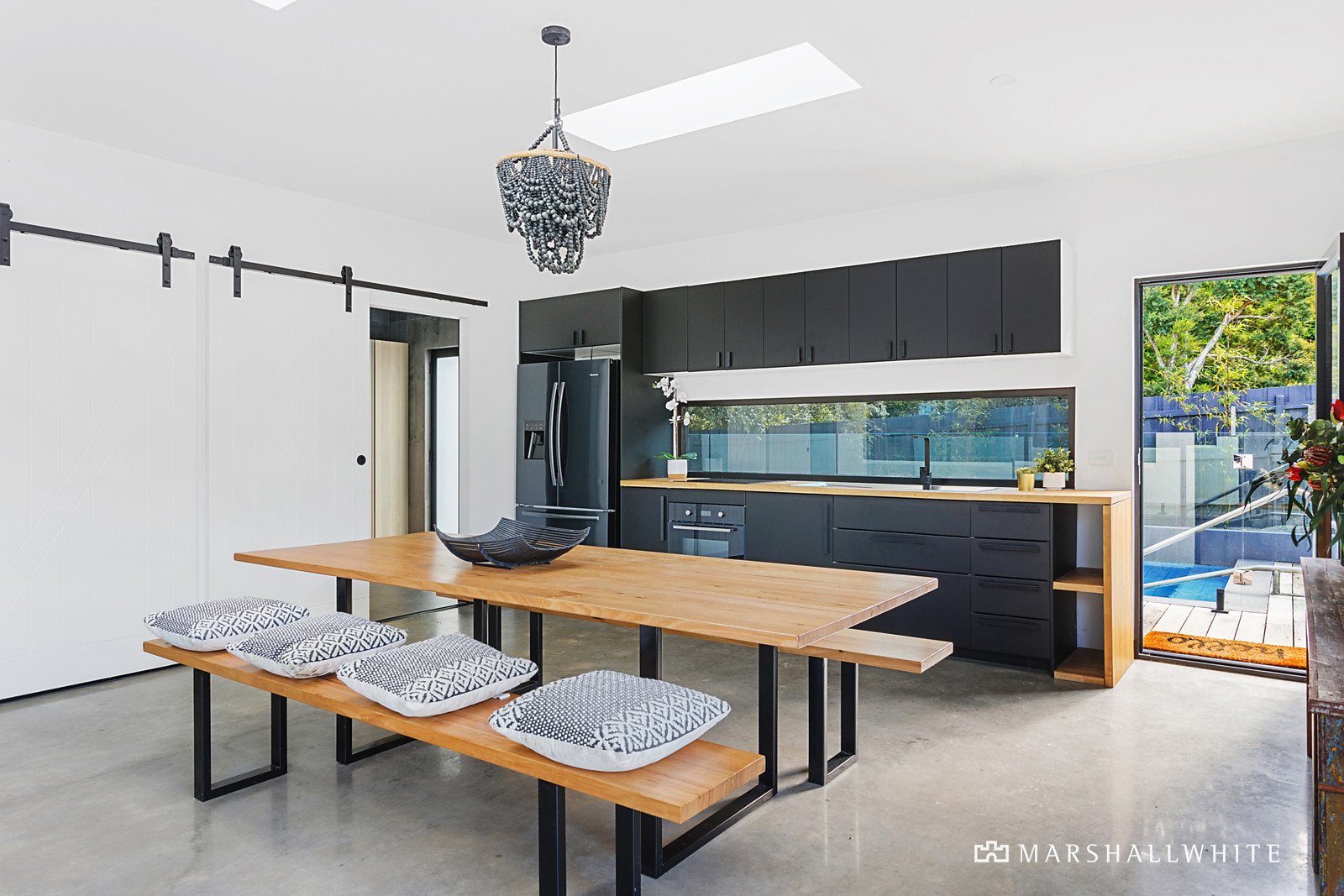 The curved walls of the raised deck seductively contrast the square edges of the contemporary interior, overseeing an appealing alfresco. A spiral staircase introduces a glass-tiled pool as the headliner amongst a bespoke outdoor shower and dedicated firepit area, complemented by a triple garage/studio for unlimited entertainment or work-from-home potential.