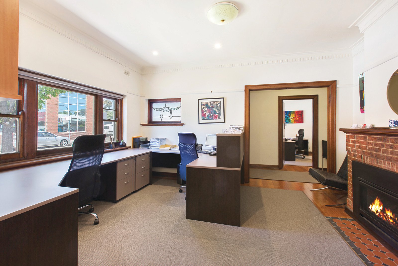 Evocative features including leadlight windows, high ceilings and timber floors add to the rich character of the property, which includes a wide entrance hall, living room or reception with gas fire, and a generous dining or meeting room. Two spacious rooms, suitable for use as bedrooms or offices, are accompanied by a bathroom and separate laundry. The light filled kitchen with casual dining area opens to the private north and west facing paved outdoor area offering off street parking for 3 cars via a rear lane. There is also a lock-up garage under the existing roof line which could be altered to become a third bedroom or office with access from inside the building, or from Emo Road. (STCA). The property also includes two reverse cycle air conditioners.