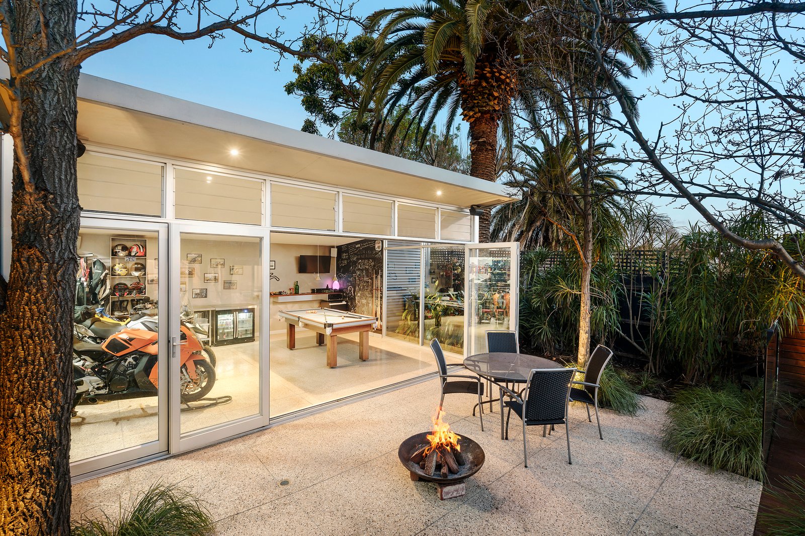 - Freestanding recreation room with terrazzo-polished concrete floors and bi-fold doors