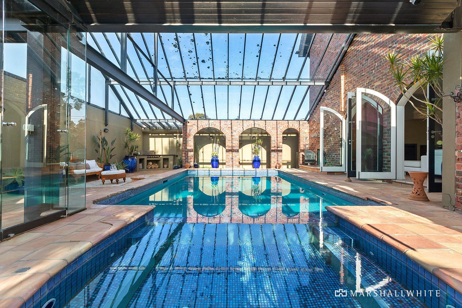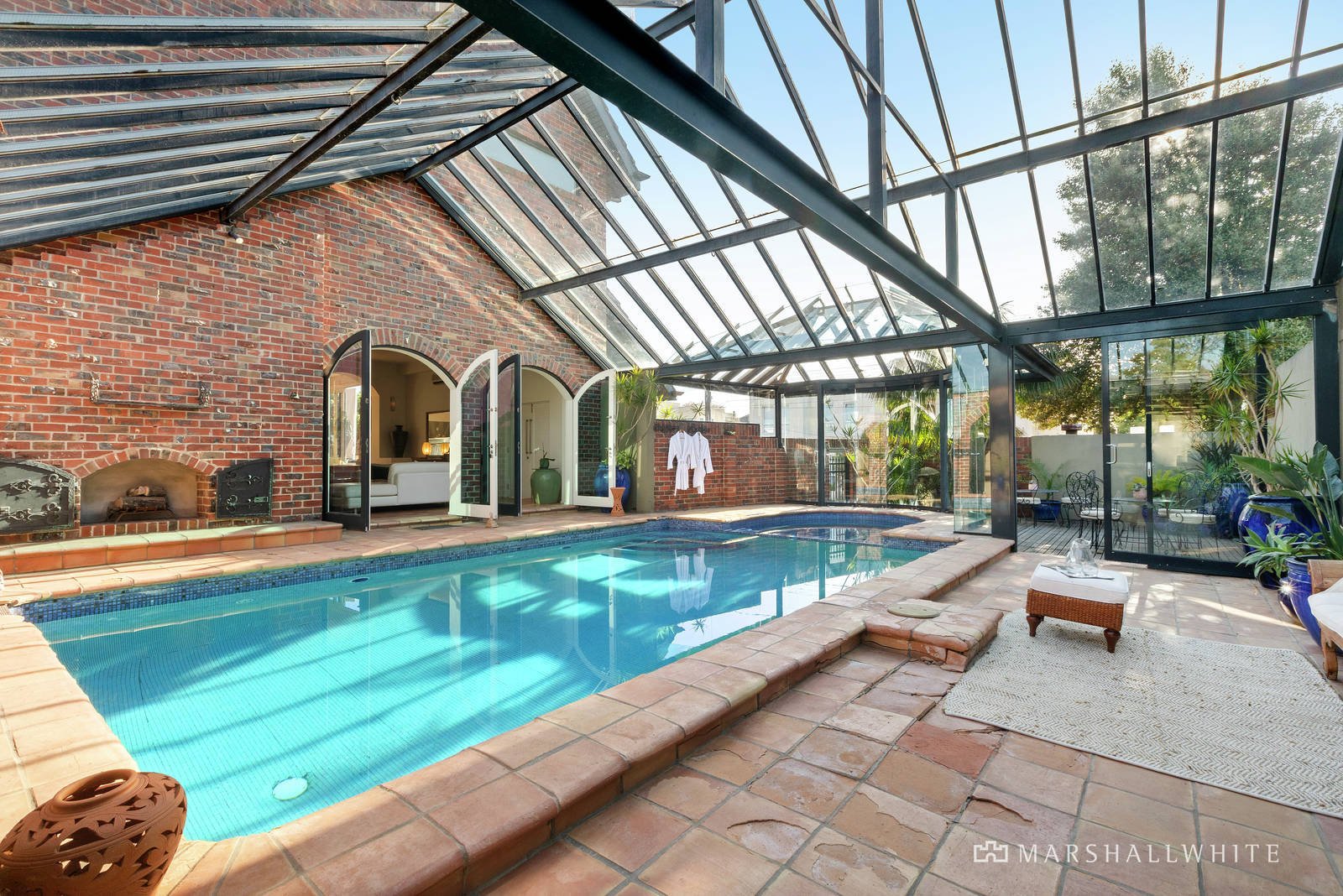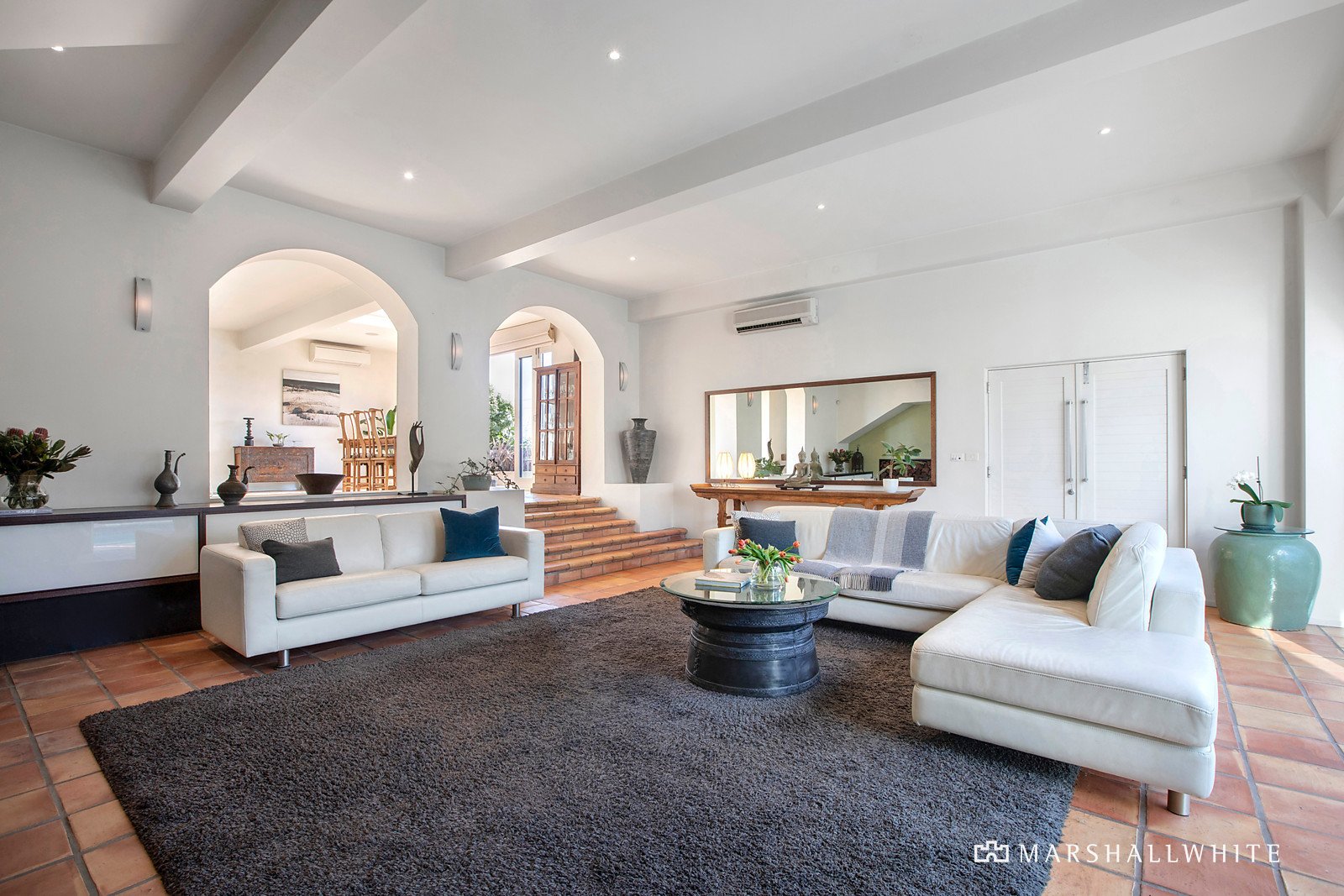 The entry level of the impressive, solid-brick, 4-5 bedroom, 4 bathroom home by Damoney Architects is characterised by rich swathes of indoor/outdoor French terracotta tiling that flows from the glass-walled entry, through the split-level living area, dining zone, kitchen, alfresco dining terrace, plus the adjoining pool atrium area. Perfect for grand scale entertaining, and reminiscent of a luxurious Mediterranean villa, this glass-enclosed space features a fully tiled swimming pool and spa that is automated, salt chlorinated, and gas/solar heated, plus integrated sound system, built-in gas-plumbed BBQ, gas log fire place, poolside bathroom and sauna, and leads to another alfresco terrace.