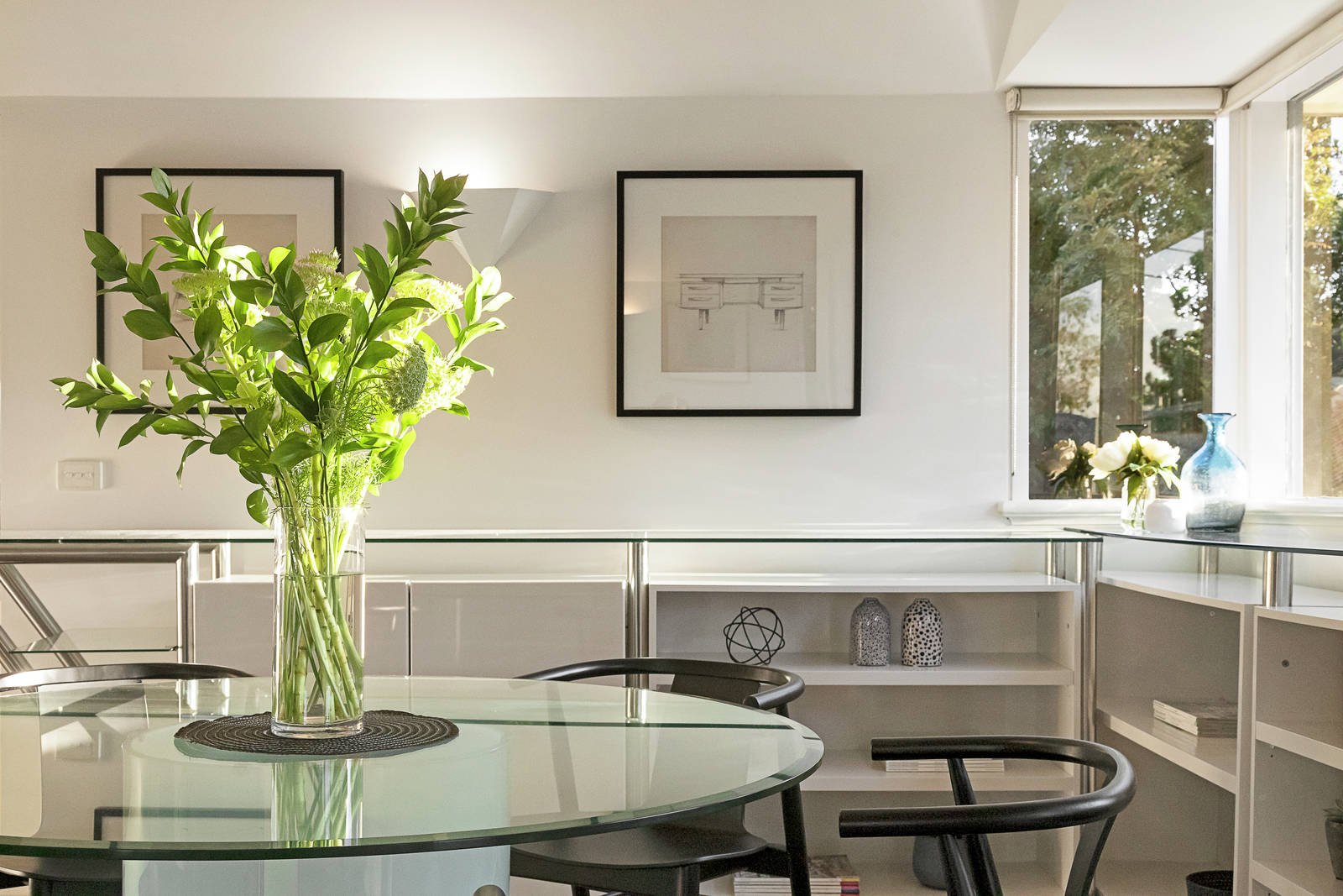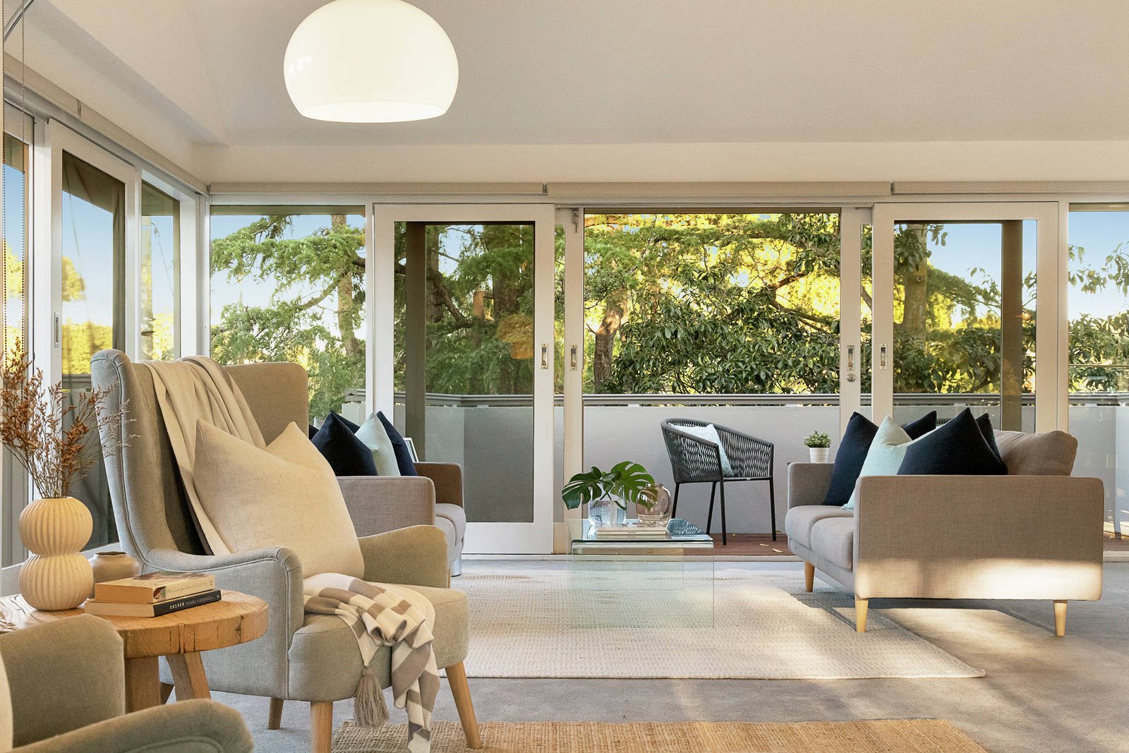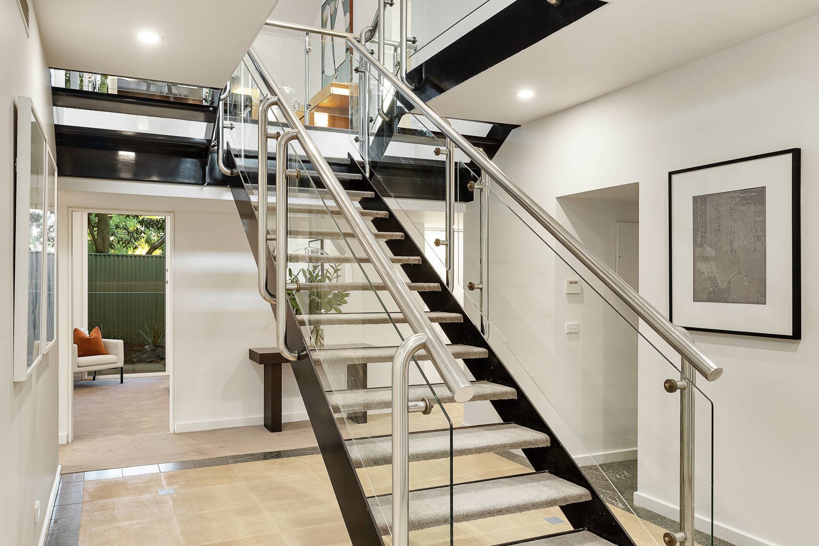 The generous entrance hall features a wide central staircase leading up to the expansive open plan living and dining areas separated into intimate spaces for entertaining, relaxing, watching TV and dining, all beneath soaring vaulted ceilings. Opening to three separate north, west and east facing balconies offering tranquil views through the treetops, the living area is served by a superbly appointed gourmet kitchen boasting stone benches, European appliances and a convenient goods lift to the garage below. On the ground level, the spacious main bedroom with en suite and walk in robe opens to the private northeast garden. There are two additional bedrooms and two bathrooms.