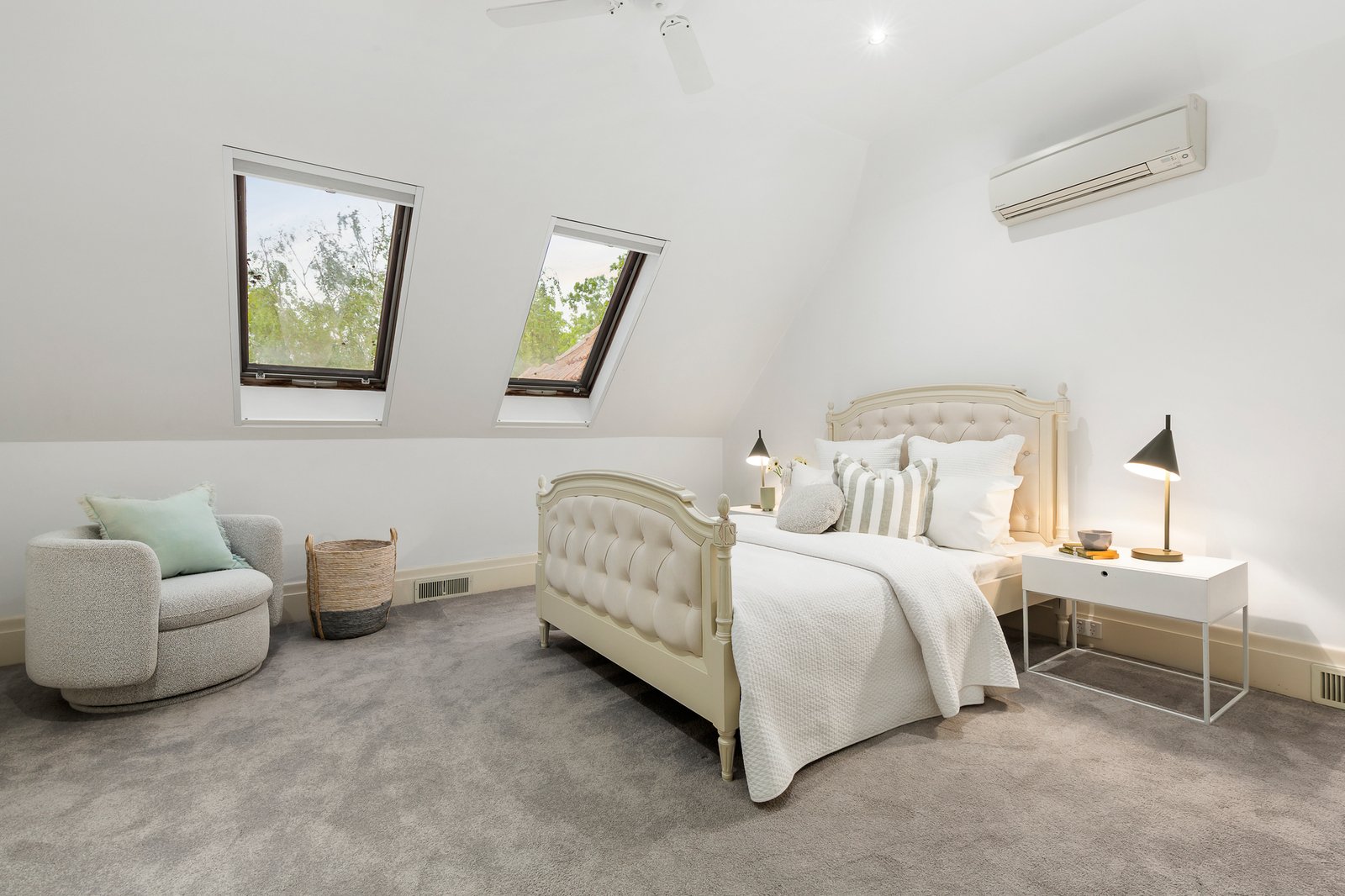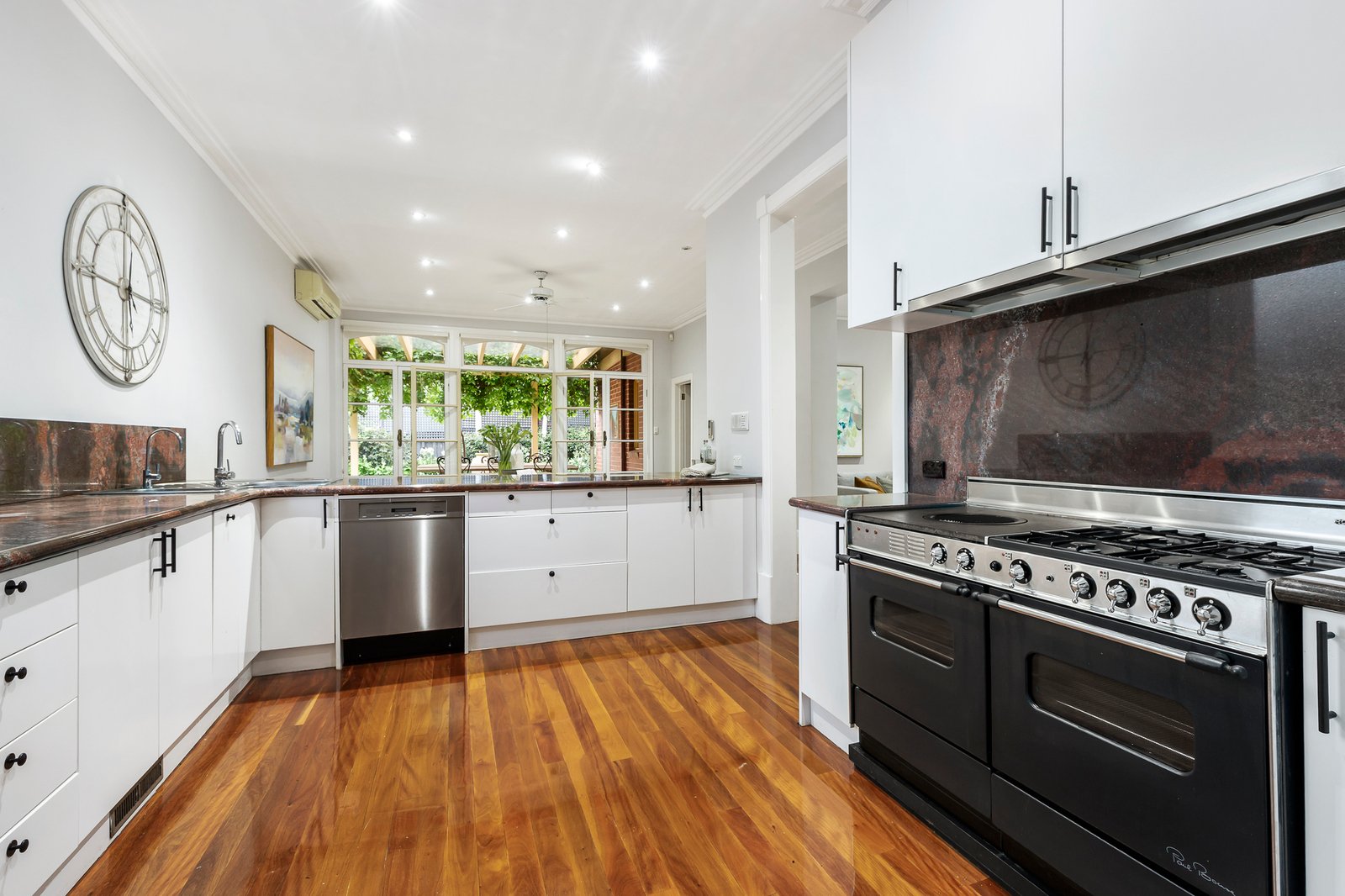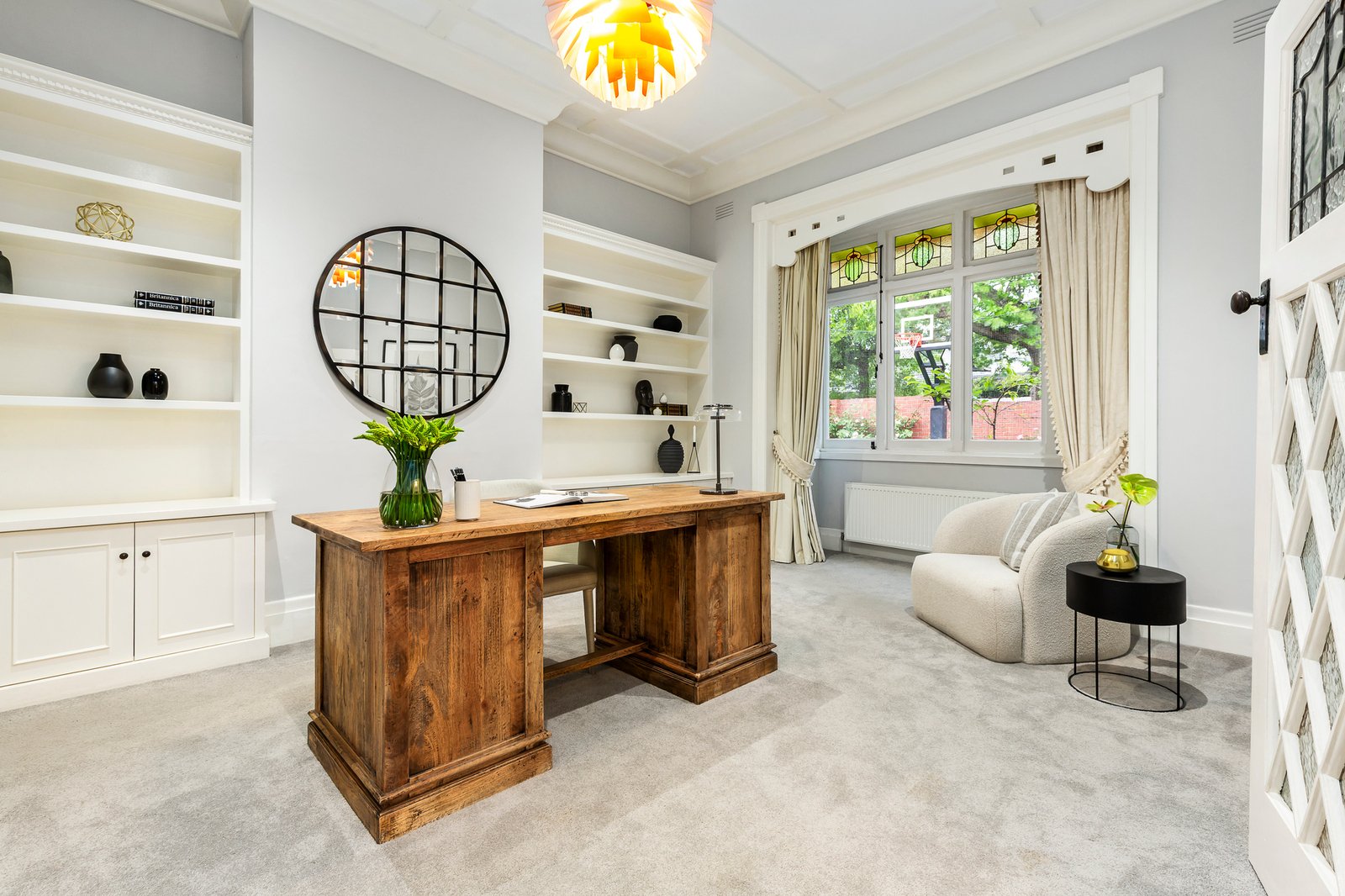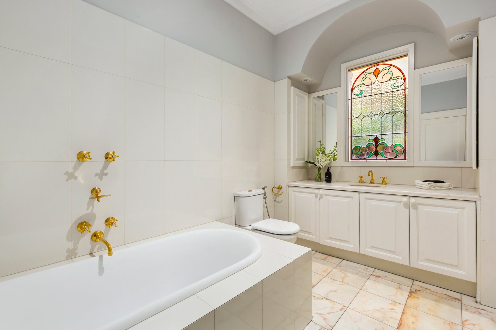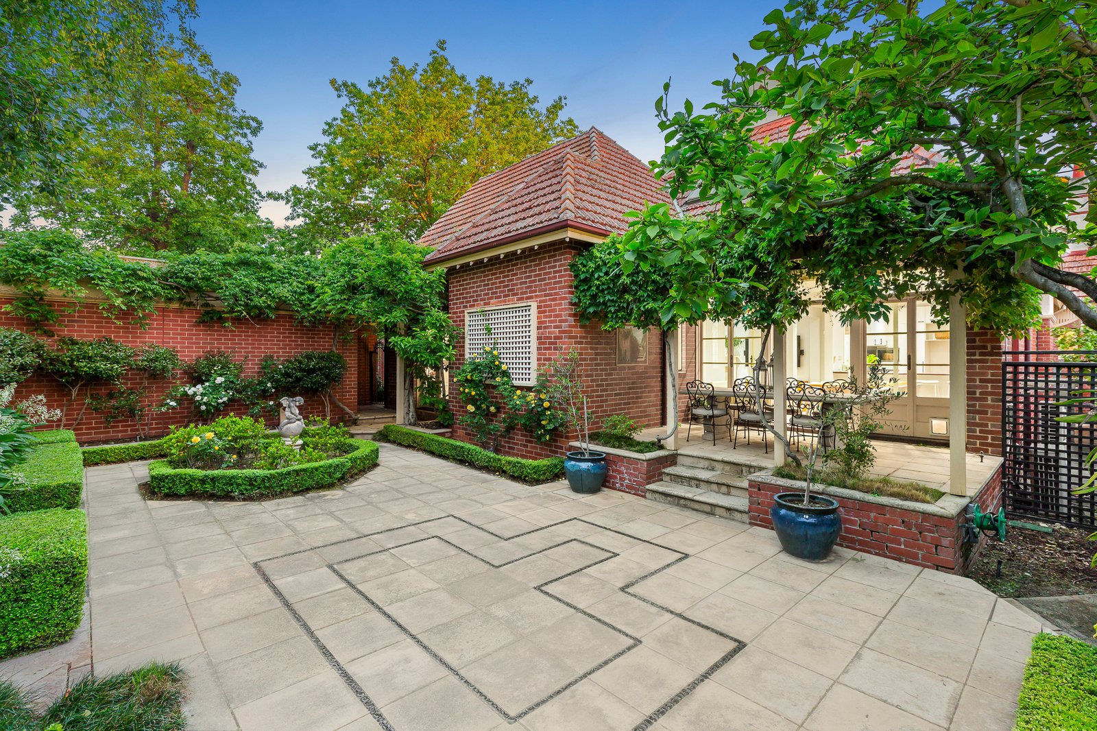 Behind a high walled garden with tessellated verandah, the imposing central reception hall introduces an elegant sitting room and grand formal dining room both with marble gas fires and leadlight bay windows, and a gracious executive study. Timber floors flow through the entertainer’s kitchen appointed with a 120cm Paul Bocuse oven and the expansive living and dining room with a gas log fire. Two sets of French doors open the living spaces to a sport court with basketball hoop and the private leafy north-facing garden with a wisteria fringed undercover al fresco dining terrace. Also opening to the garden, the generous main bedroom with en suite, dressing room and walk in robe is matched by a fabulous children’s zone upstairs comprising three robed bedrooms, a bathroom and spacious retreat with a study alcove offering city views.