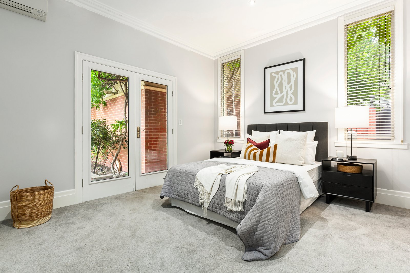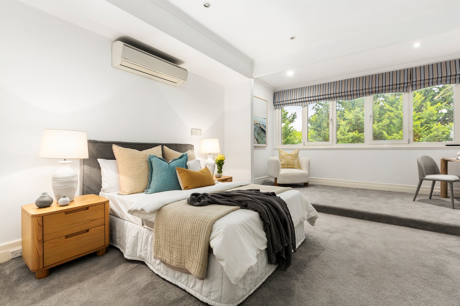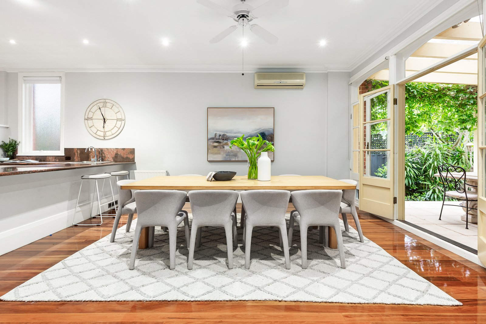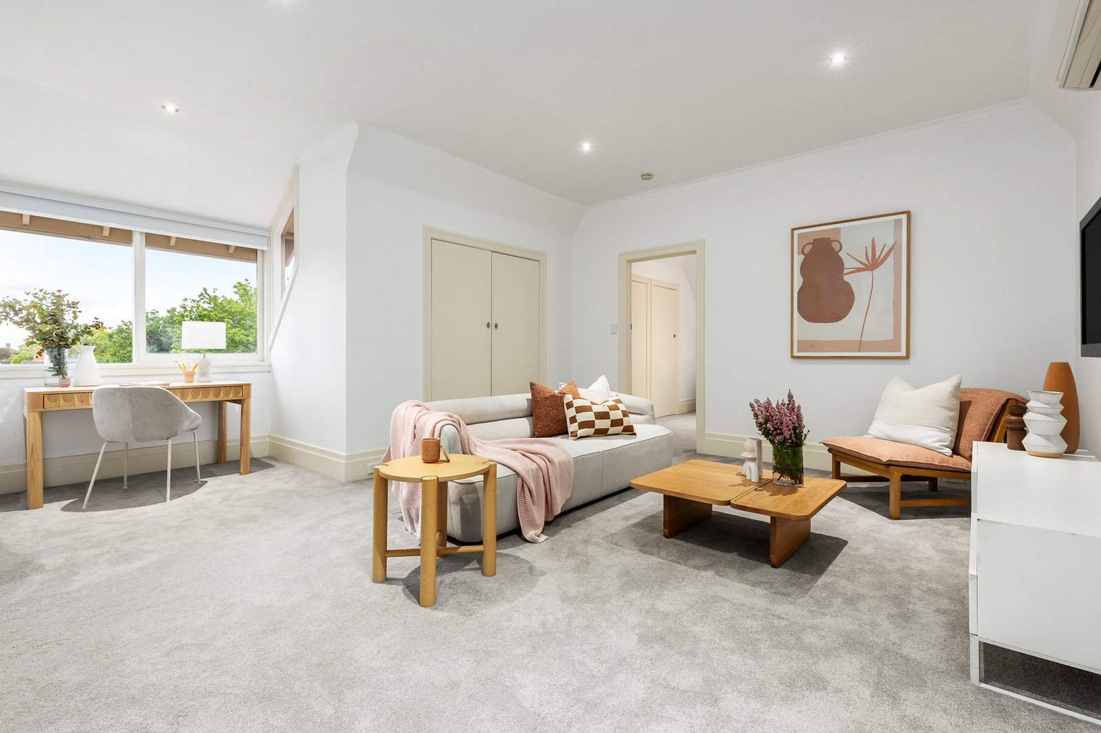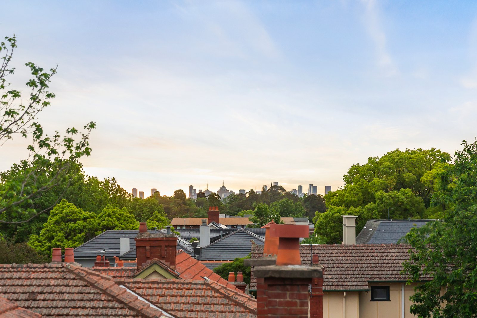Behind a high walled garden with tessellated verandah, the imposing central reception hall introduces an elegant sitting room and grand formal dining room both with marble gas fires and leadlight bay windows, and a gracious executive study. Timber floors flow through the entertainer’s kitchen appointed with a 120cm Paul Bocuse oven and the expansive living and dining room with a gas log fire. Two sets of French doors open the living spaces to a sport court with basketball hoop and the private leafy north-facing garden with a wisteria fringed undercover al fresco dining terrace. Also opening to the garden, the generous main bedroom with en suite, dressing room and walk in robe is matched by a fabulous children’s zone upstairs comprising three robed bedrooms, a bathroom and spacious retreat with a study alcove offering city views.