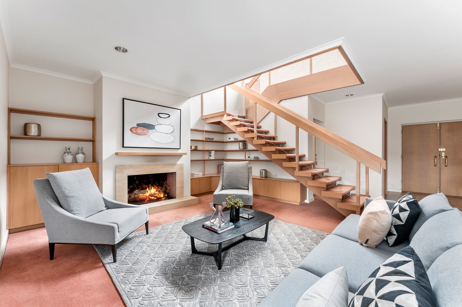 The double door entry reveals an expansive open plan living and dining room with a travertine open fire and bookshelves served by a well-appointed sun-lit kitchen with a Neff oven. The living area opens out to a peaceful leafy north-facing garden. Broad stairs beneath a soaring void lead up to the main bedroom with en-suite and BIR, an additional bedroom plus a third bedroom/study, both with BIRs and a second pristine bathroom.