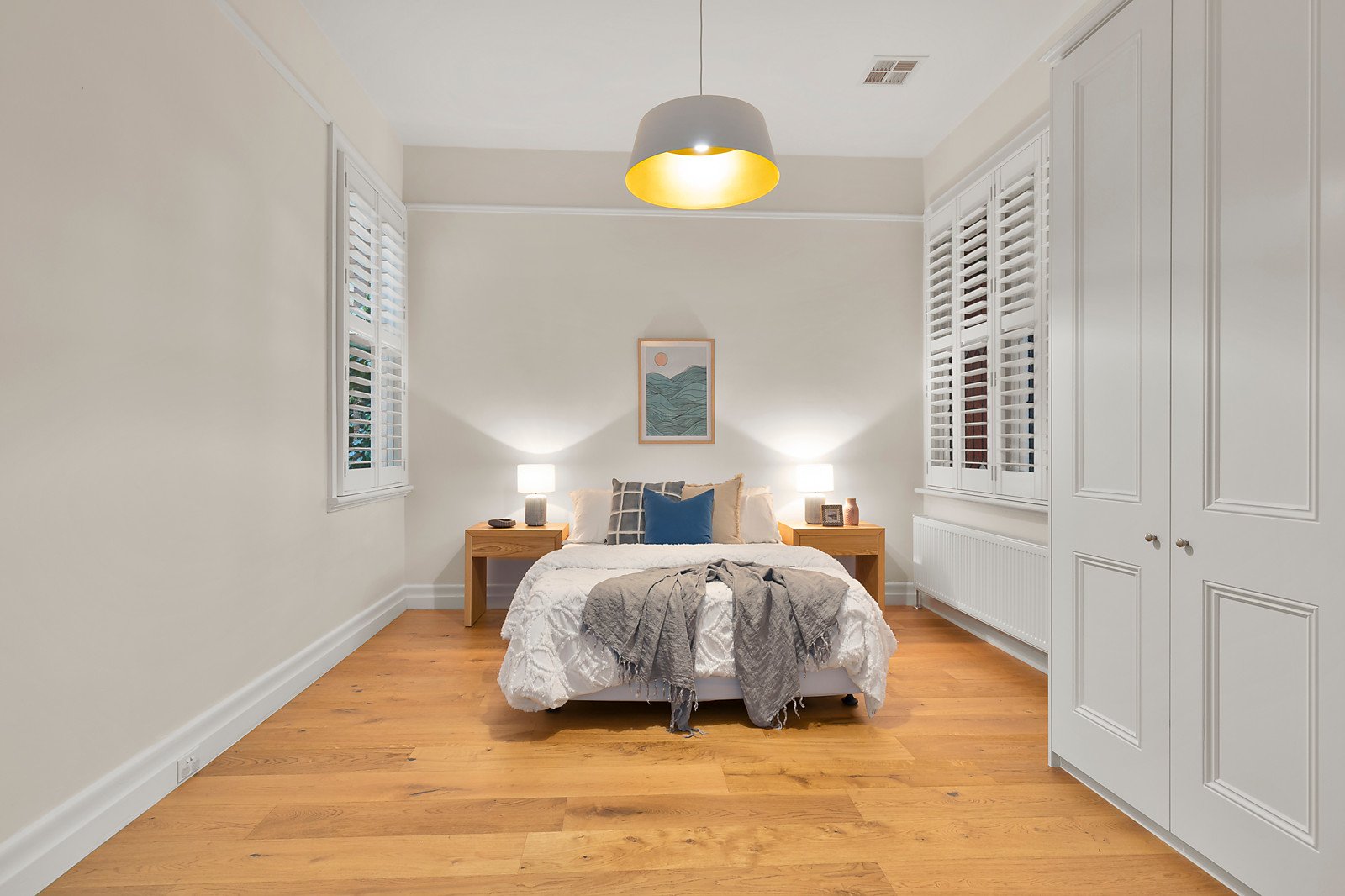 Combining original elegance and contemporary style, a beautiful wide hallway with oak timber floors and high ceilings introduces two generous bedrooms (BIRs) and a stylish central bathroom.