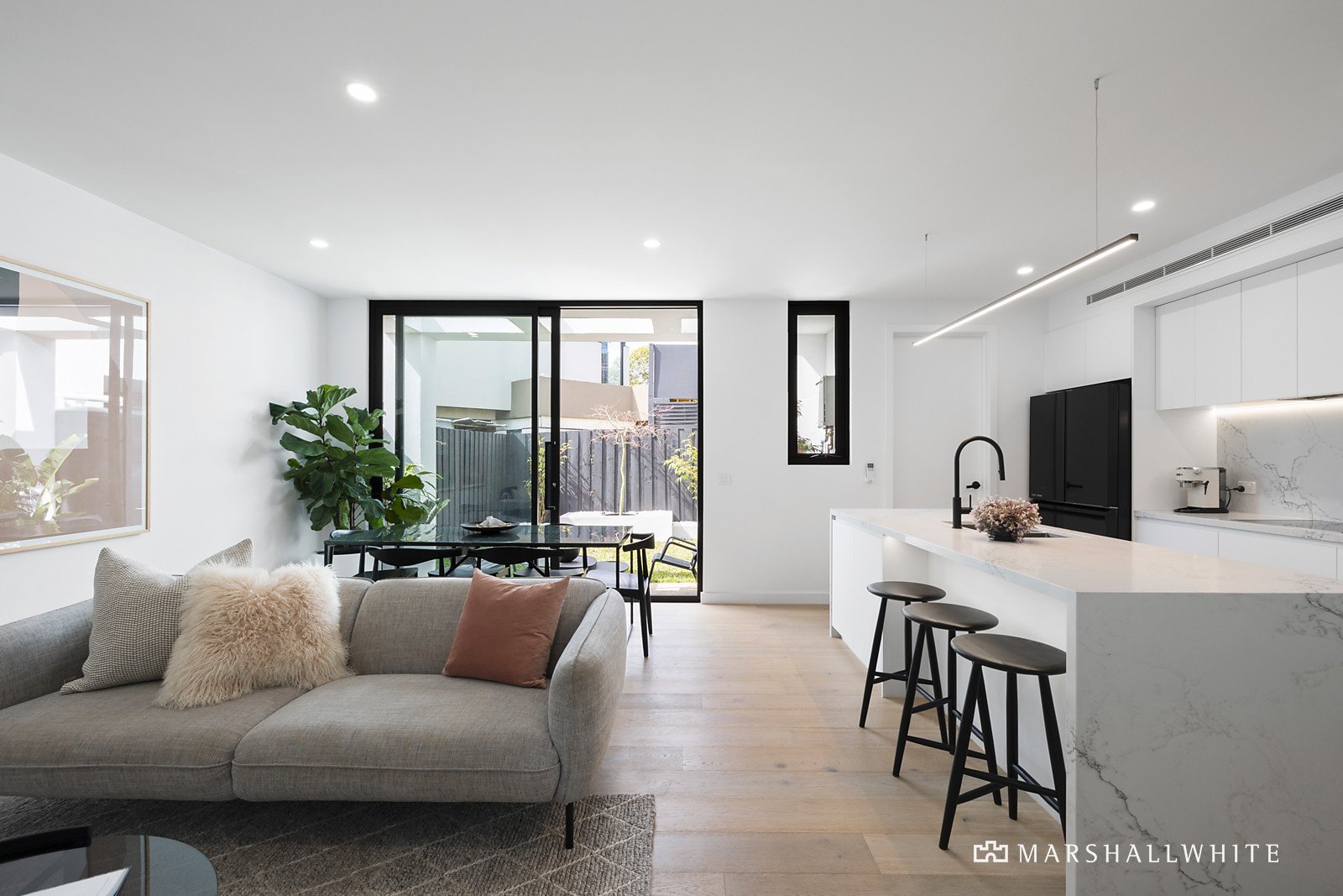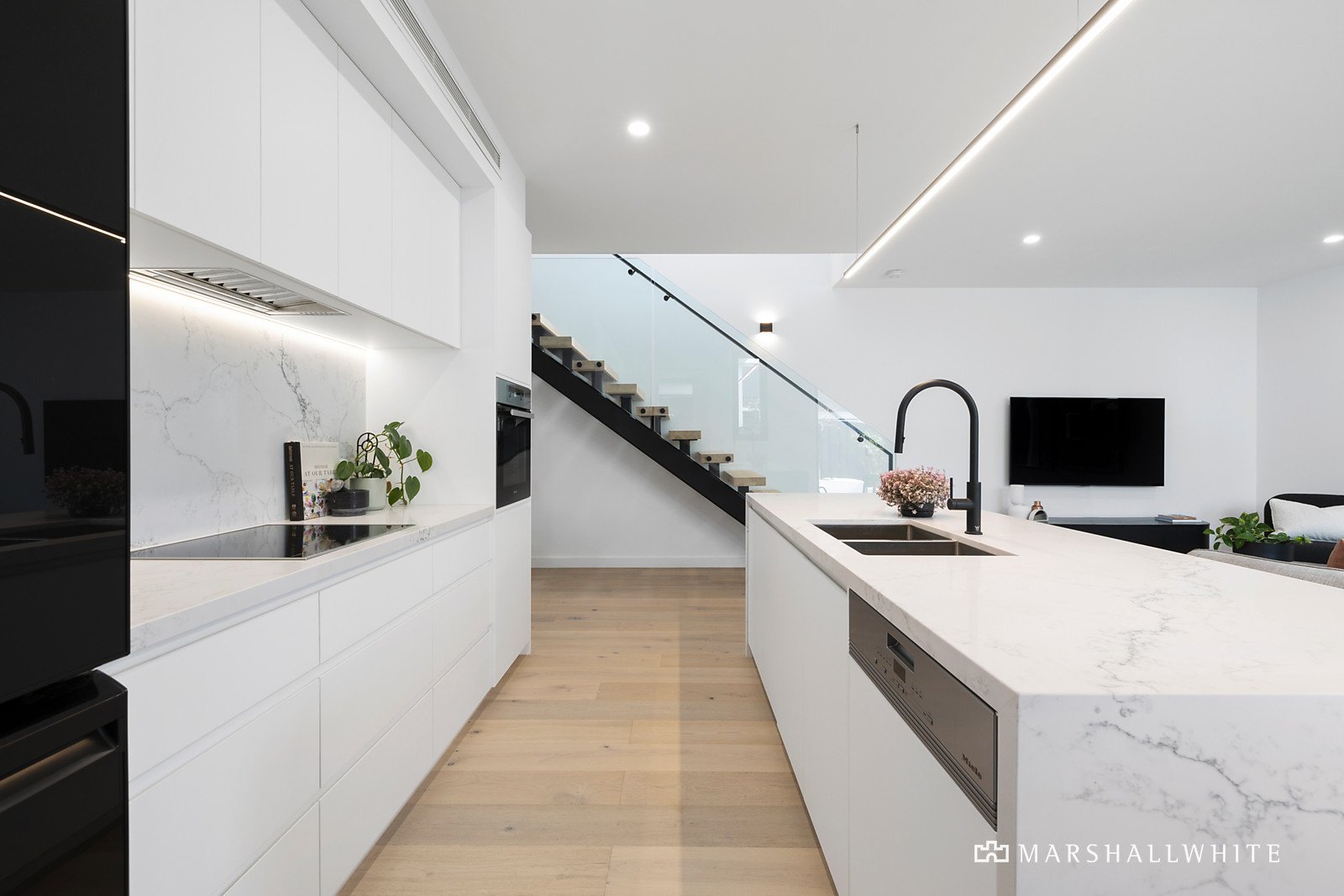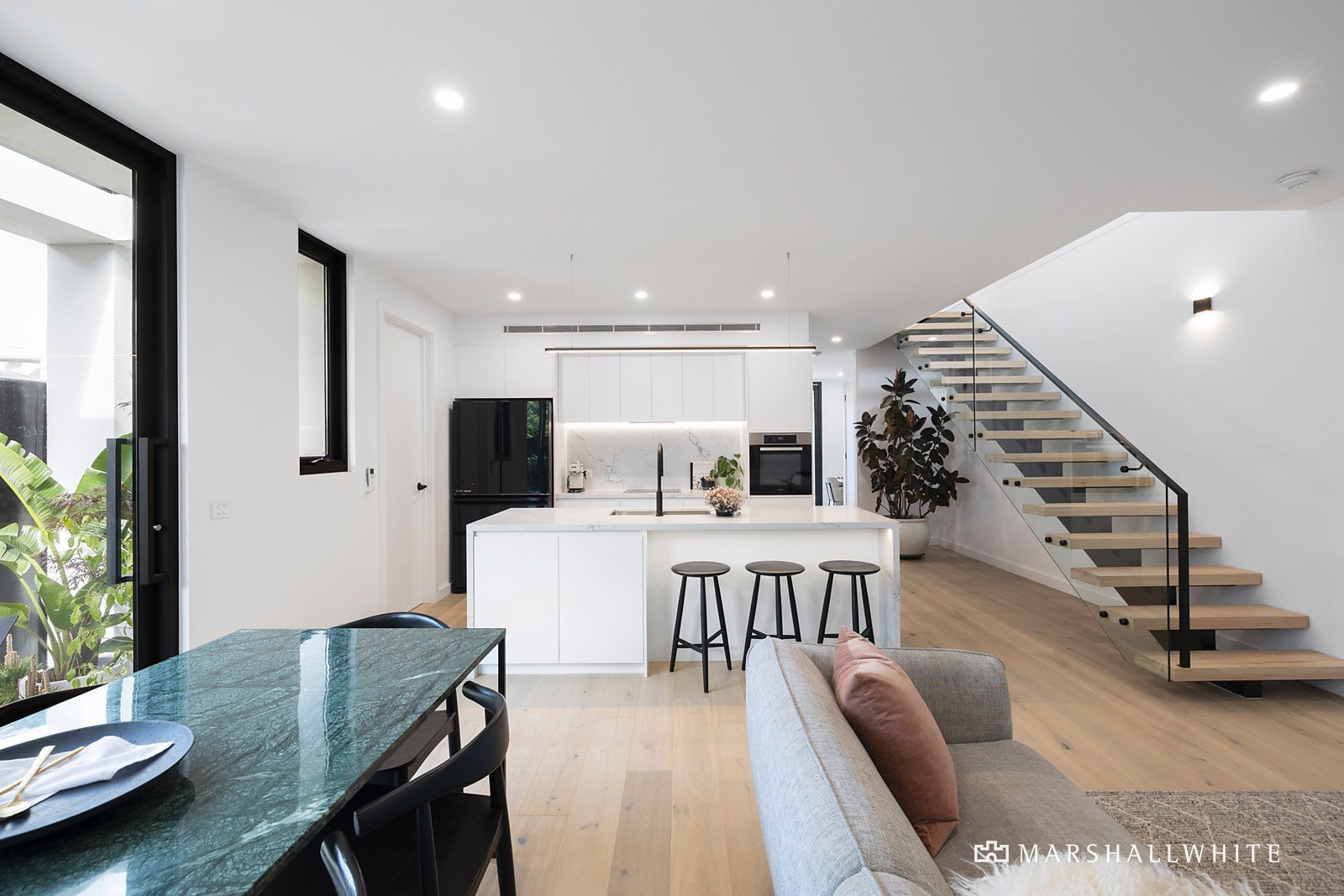 An oversized front door pivots to reveal the generously proportioned interiors floored with engineered oak. Complementing the bold lines of its striking exterior, the home's luxury style statements include three fully tiled bathrooms with terrazzo floors, designer lighting throughout, and floor-to-ceiling corner windows draped with sheer linen in the downstairs bedroom and upper-level master. The hallway features a stone-topped study nook and sleek joinery concealing a stone European laundry and flows to the expansive open-plan living zone. Here the gleaming kitchen is defined by a large island bench illuminated with a lineal pendant and equipped with Miele appliances including an induction cooktop, oven, and dishwasher, while glass sliding doors open to a sunny rear yard with a lawn area and paved alfresco zone. An open timber stairway with glass balustrade and sconce lighting leads to the upper-level bedrooms, all fitted with wool loop pile carpets and individually controlled central heating/cooling. The master bedroom has a fitted walk-in robe and luxe ensuite, and the other bedrooms have built-in robes with mirrored sliding doors. Includes double remote-operated garage with internal access and rear access doors, and a large water tank for garden irrigation.