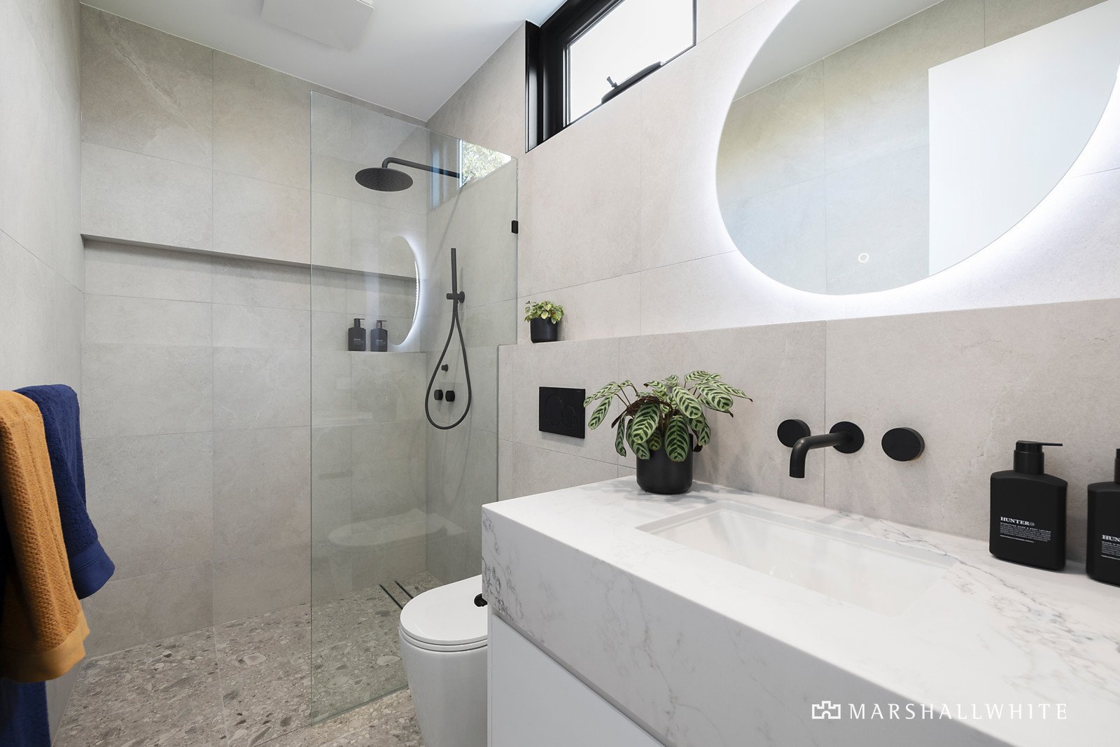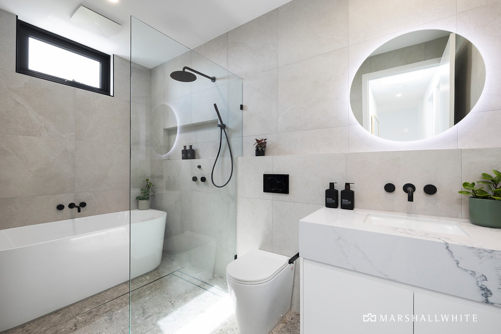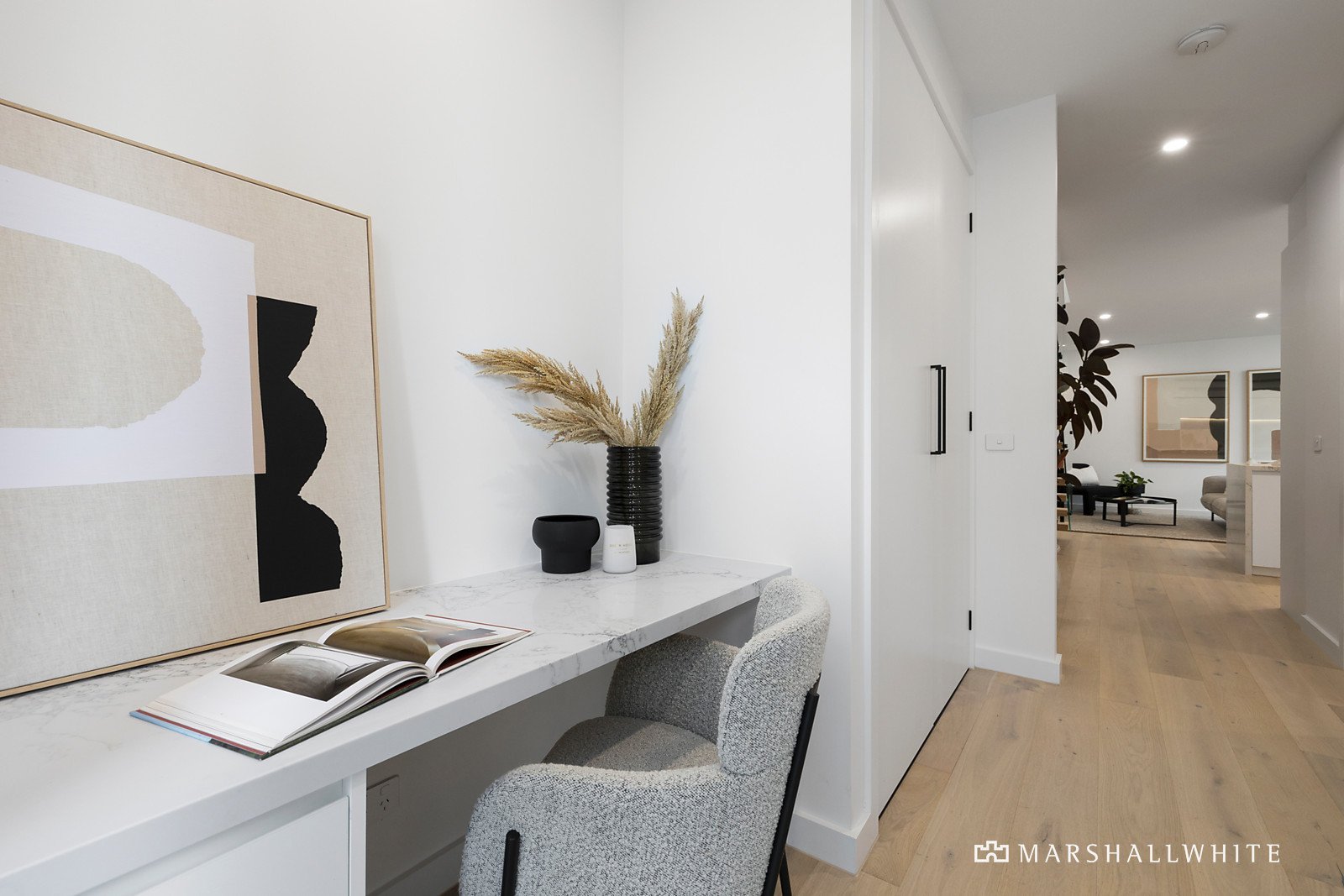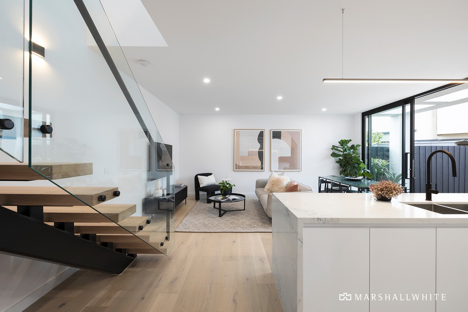 An oversized front door pivots to reveal the generously proportioned interiors floored with engineered oak. Complementing the bold lines of its striking exterior, the home's luxury style statements include three fully tiled bathrooms with terrazzo floors, designer lighting throughout, and floor-to-ceiling corner windows draped with sheer linen in the downstairs bedroom and upper-level master. The hallway features a stone-topped study nook and sleek joinery concealing a stone European laundry and flows to the expansive open-plan living zone. Here the gleaming kitchen is defined by a large island bench illuminated with a lineal pendant and equipped with Miele appliances including an induction cooktop, oven, and dishwasher, while glass sliding doors open to a sunny rear yard with a lawn area and paved alfresco zone. An open timber stairway with glass balustrade and sconce lighting leads to the upper-level bedrooms, all fitted with wool loop pile carpets and individually controlled central heating/cooling. The master bedroom has a fitted walk-in robe and luxe ensuite, and the other bedrooms have built-in robes with mirrored sliding doors. Includes double remote-operated garage with internal access and rear access doors, and a large water tank for garden irrigation.