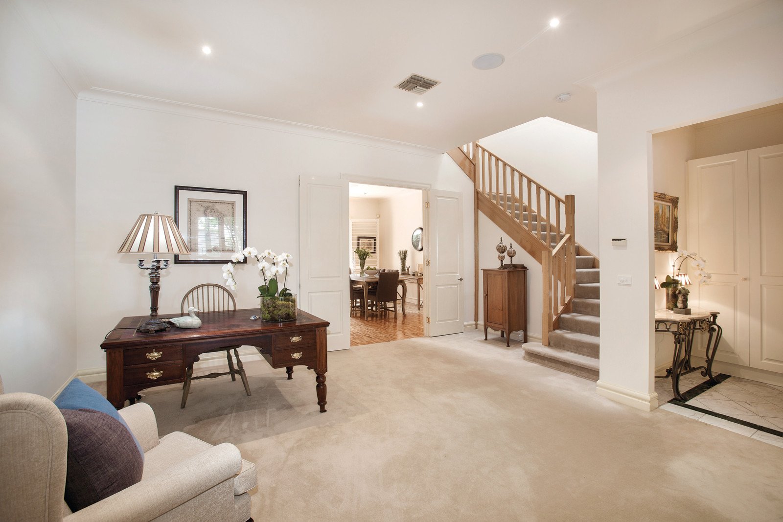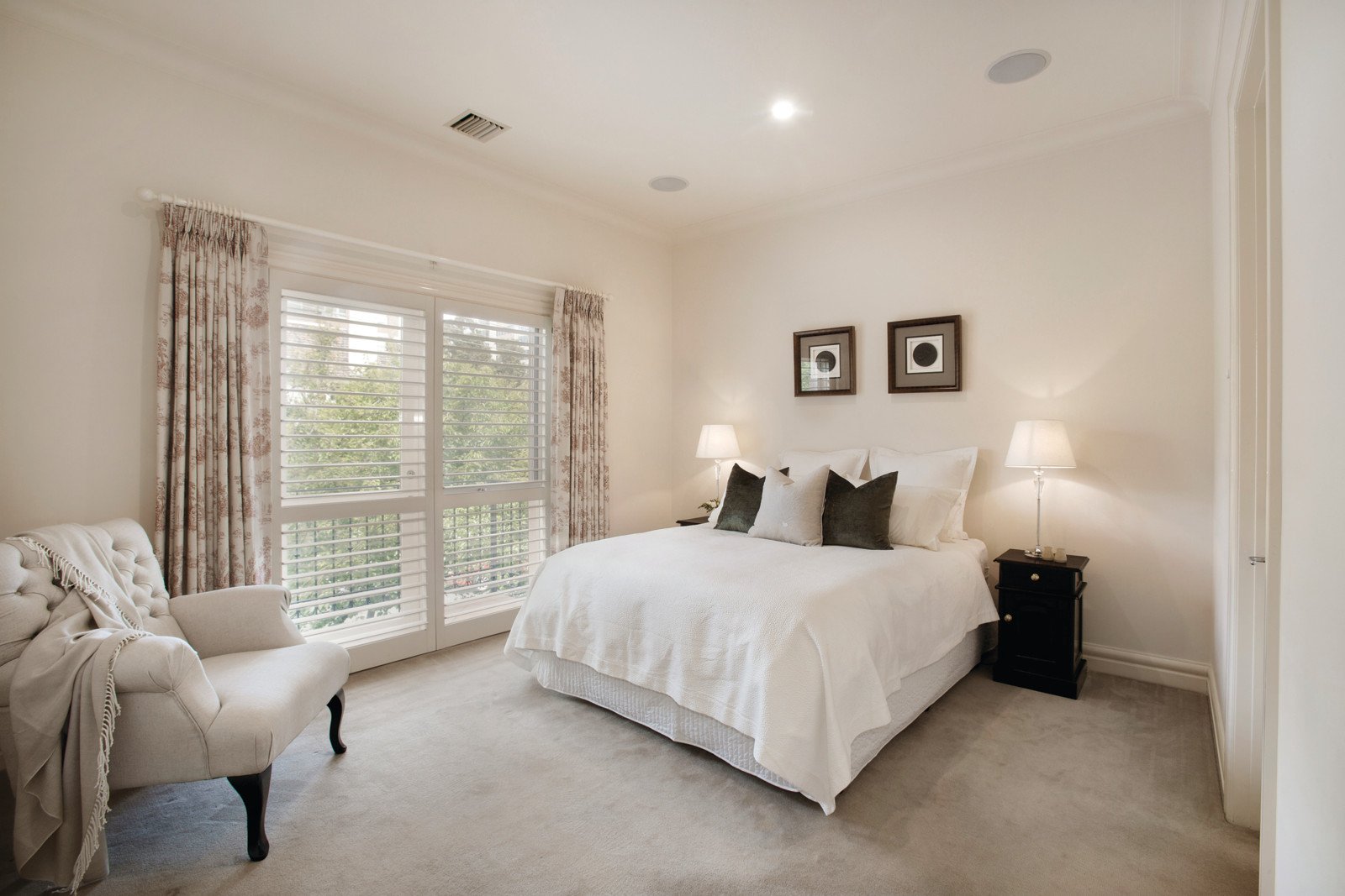High ceilings and plantation shutters accentuate the wonderful sense of space and style through the marble entrance, elegant sitting and dining room, gourmet kitchen featuring stone benches and European appliances and light-filled dining area opening to a leafy northwest facing entertaining terrace. Light-filled accommodation upstairs includes a beautiful main bedroom with ensuite, balcony and walk in robe, two further double bedrooms with built in robes and a bathroom with spa-bath.