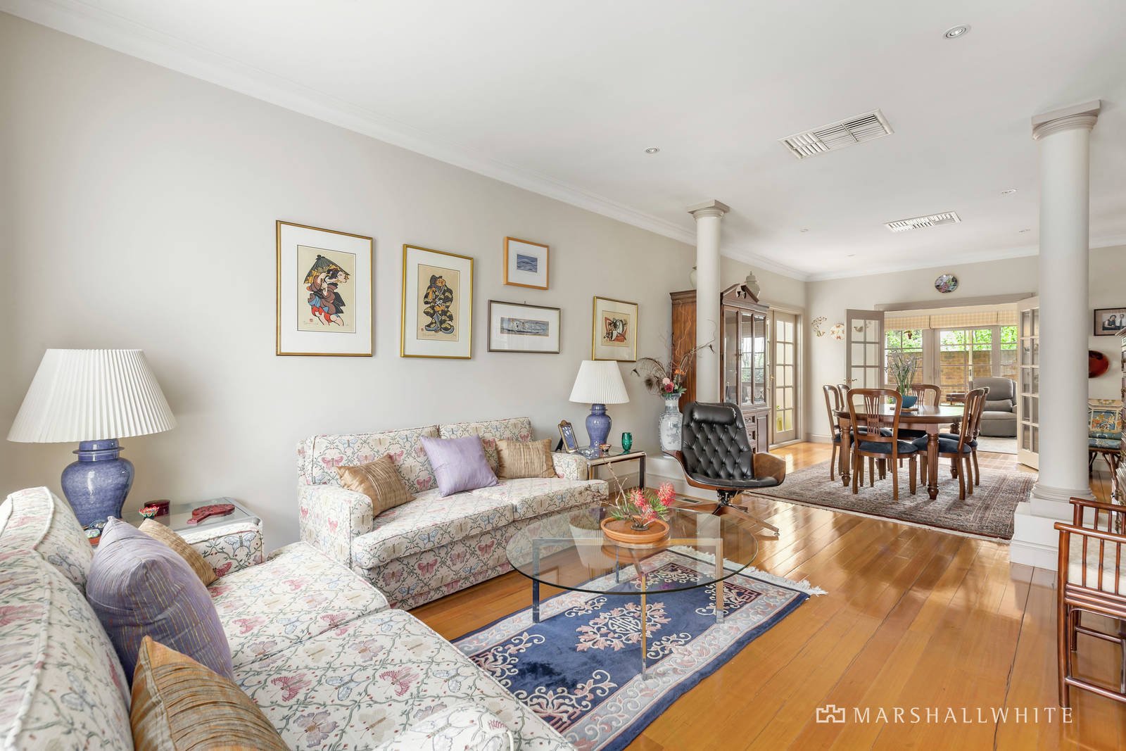 A wide arched entrance hall featuring timber floors introduces a palatial formal sitting and dining room opening through French doors to a central atrium. Streaming with natural light, the relaxed living and dining room with a gourmet kitchen boasting stone benches opens to a private north-facing garden and a covered entertaining terrace. The spacious main bedroom with walk in robe and en suite enjoys its own space while a separate wing closed off by a sliding door comprises two additional bedrooms with robes and a full bathroom.