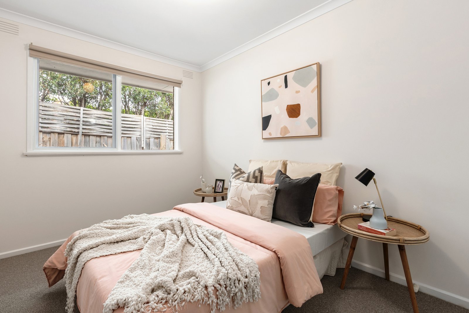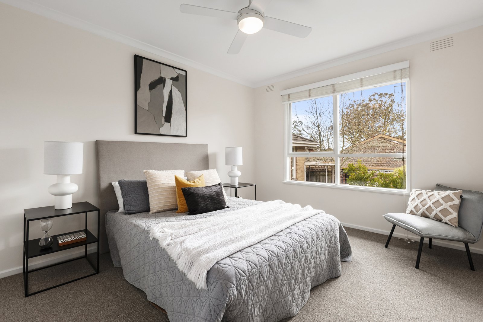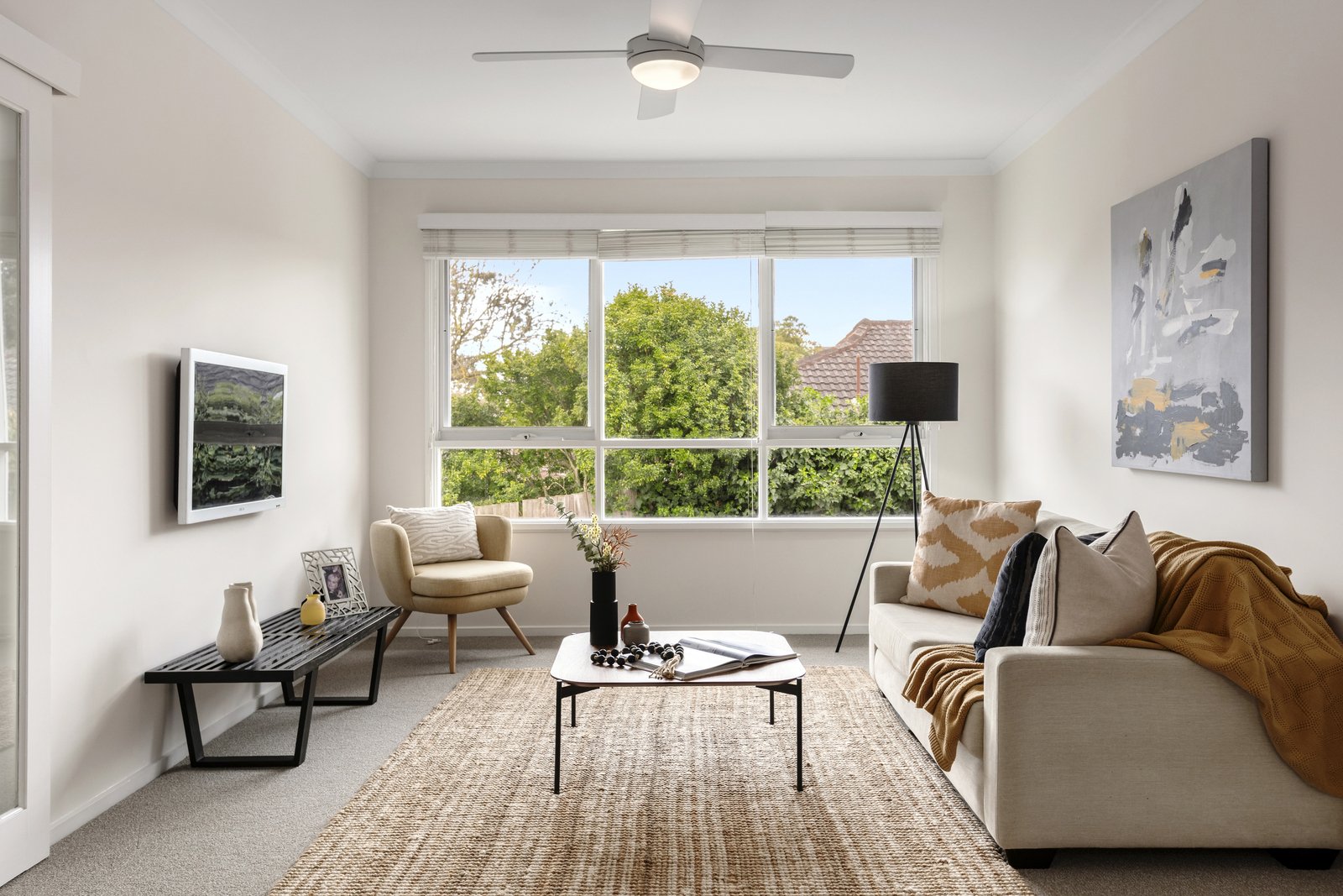 Freshly painted and newly carpeted, the interior opens with a generous living room where expansive windows capture tranquil garden outlooks, while a split system ensures year-round climate comfort.