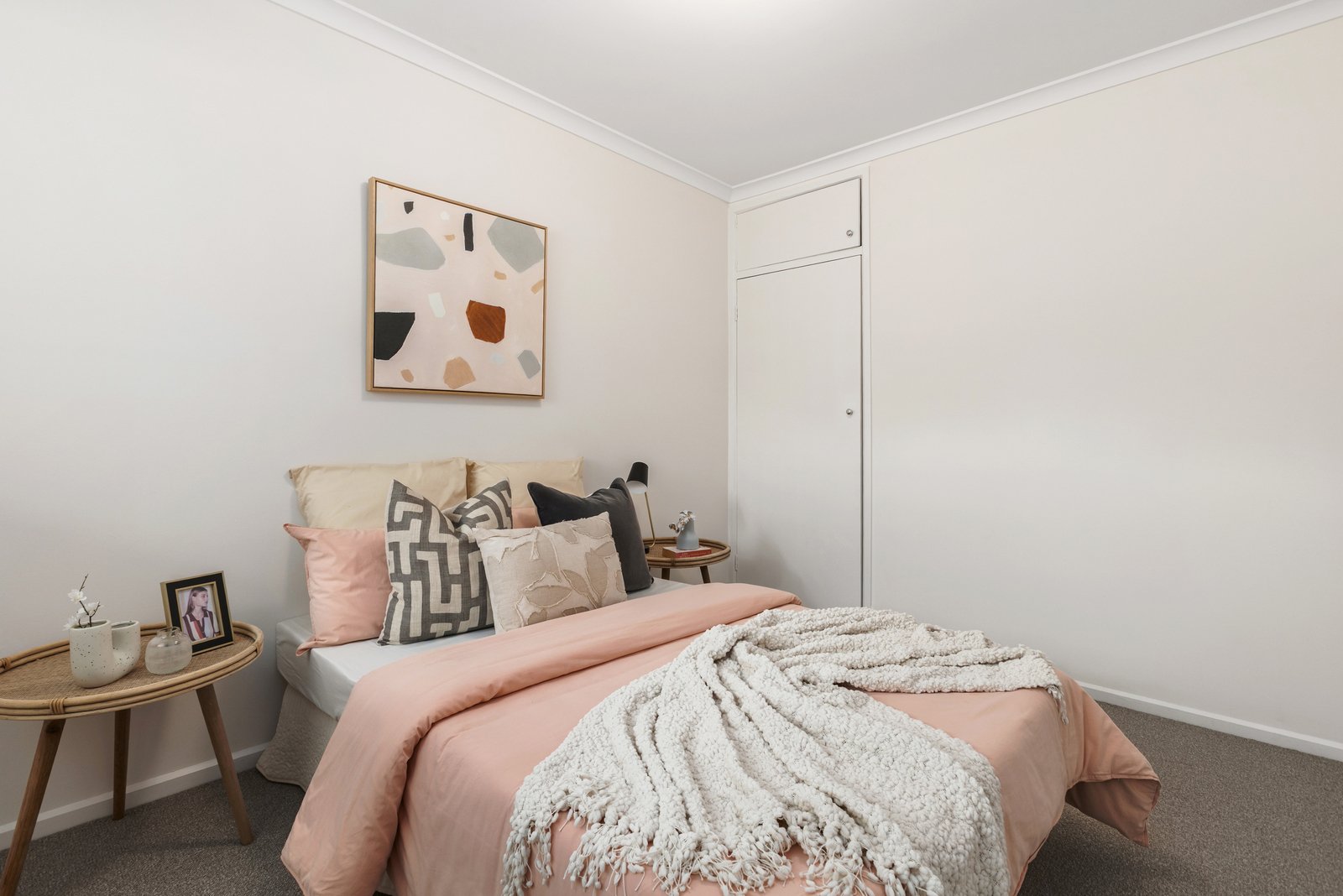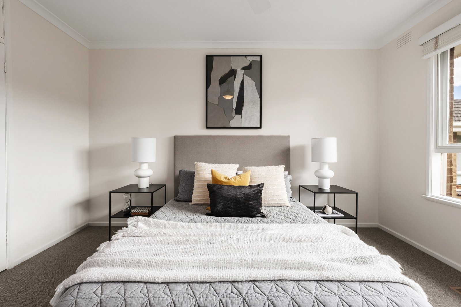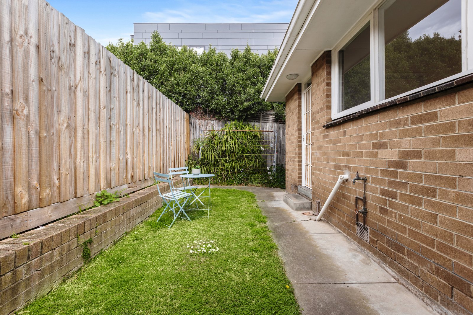 Freshly painted and newly carpeted, the interior opens with a generous living room where expansive windows capture tranquil garden outlooks, while a split system ensures year-round climate comfort.