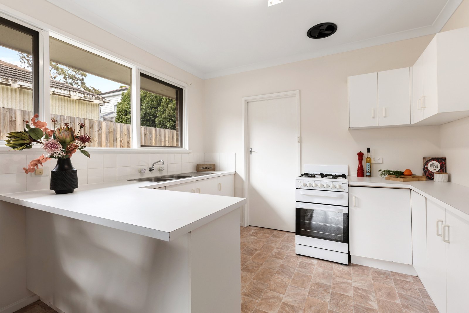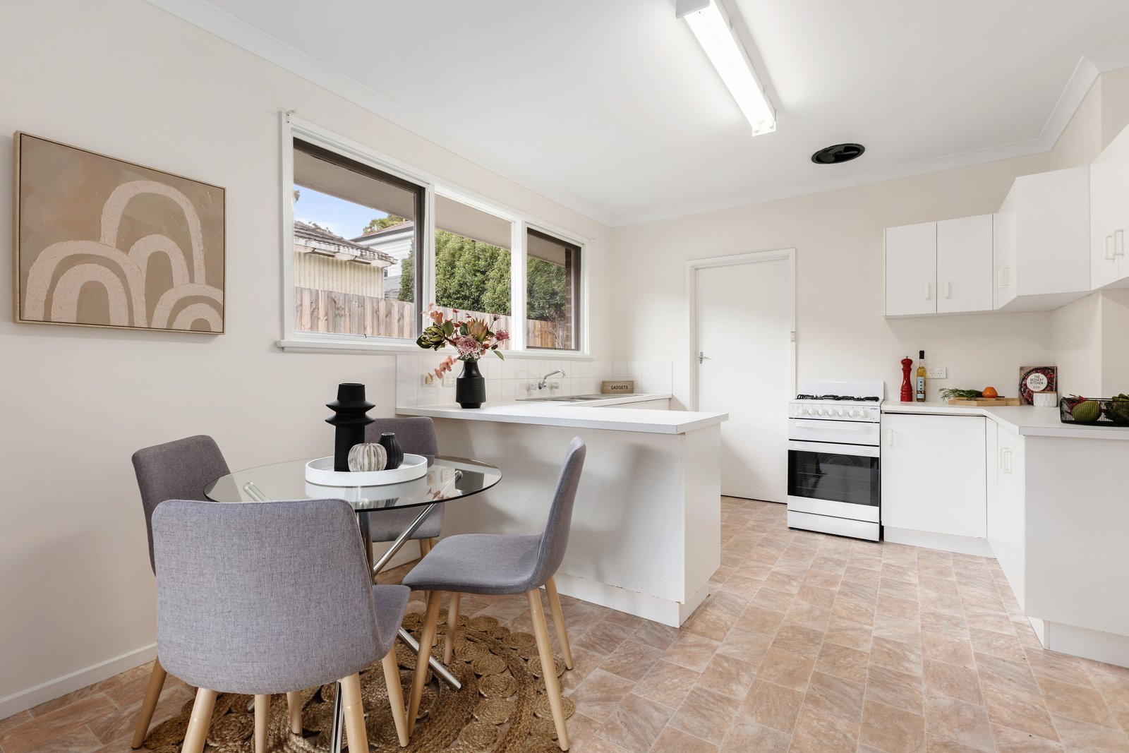 Adjoining dining and kitchen zones create seamless everyday functionality. The kitchen presents ample storage, a breakfast bar, stainless-steel sink, and a dependable Chef cooktop and oven, making meal preparation both practical and efficient. A separate laundry further enhances ease for daily routines.