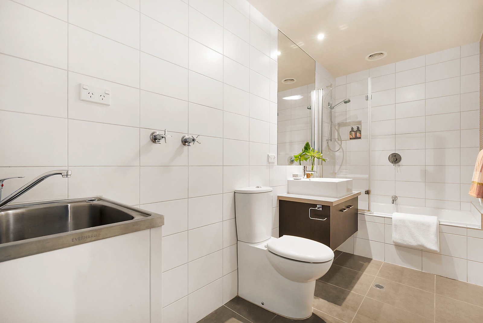 The bathroom is cleverly appointed, including laundry space, single vanity and modern bath/shower combination.