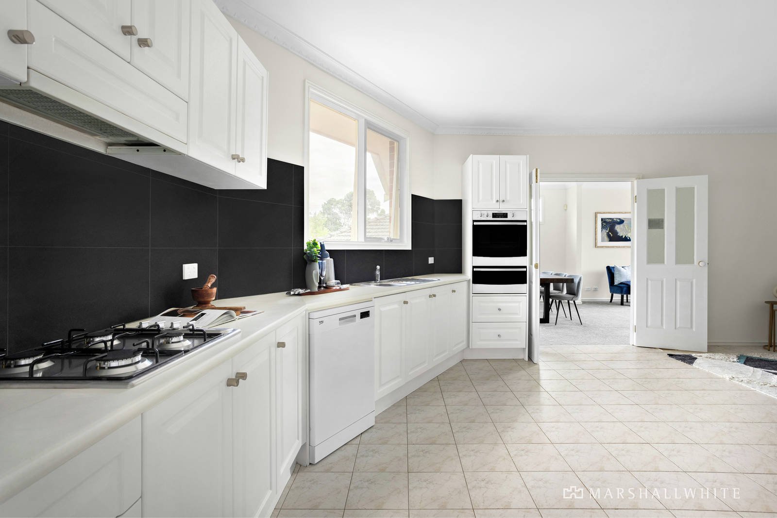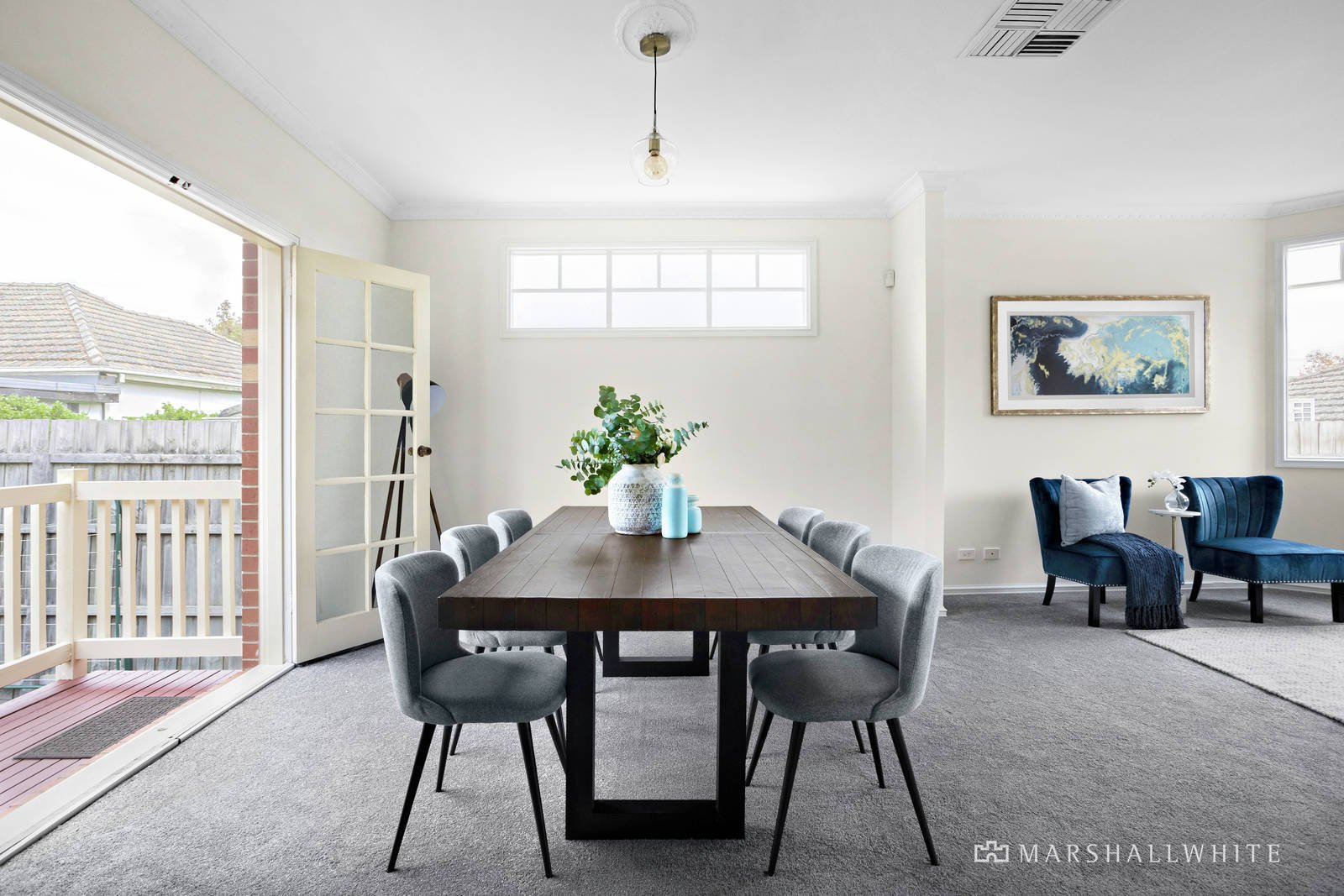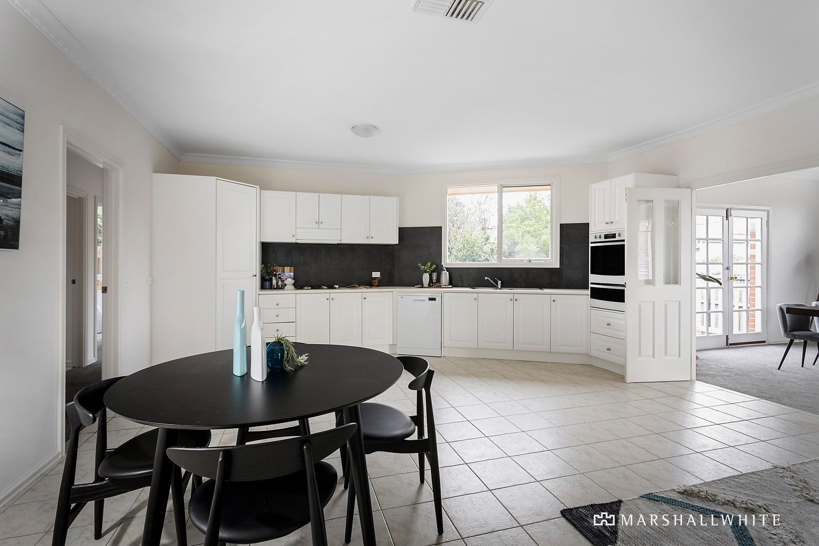 The immediately inviting entrance hall introduces an expansive living and dining room with Double hung doors opening to a private leafy garden. The equally spacious open plan family room includes a sleek well-appointed modern kitchen. The oversize main bedroom with walk in robe and en suite is matched by two additional robed bedrooms and a central bathroom with separate toilet.