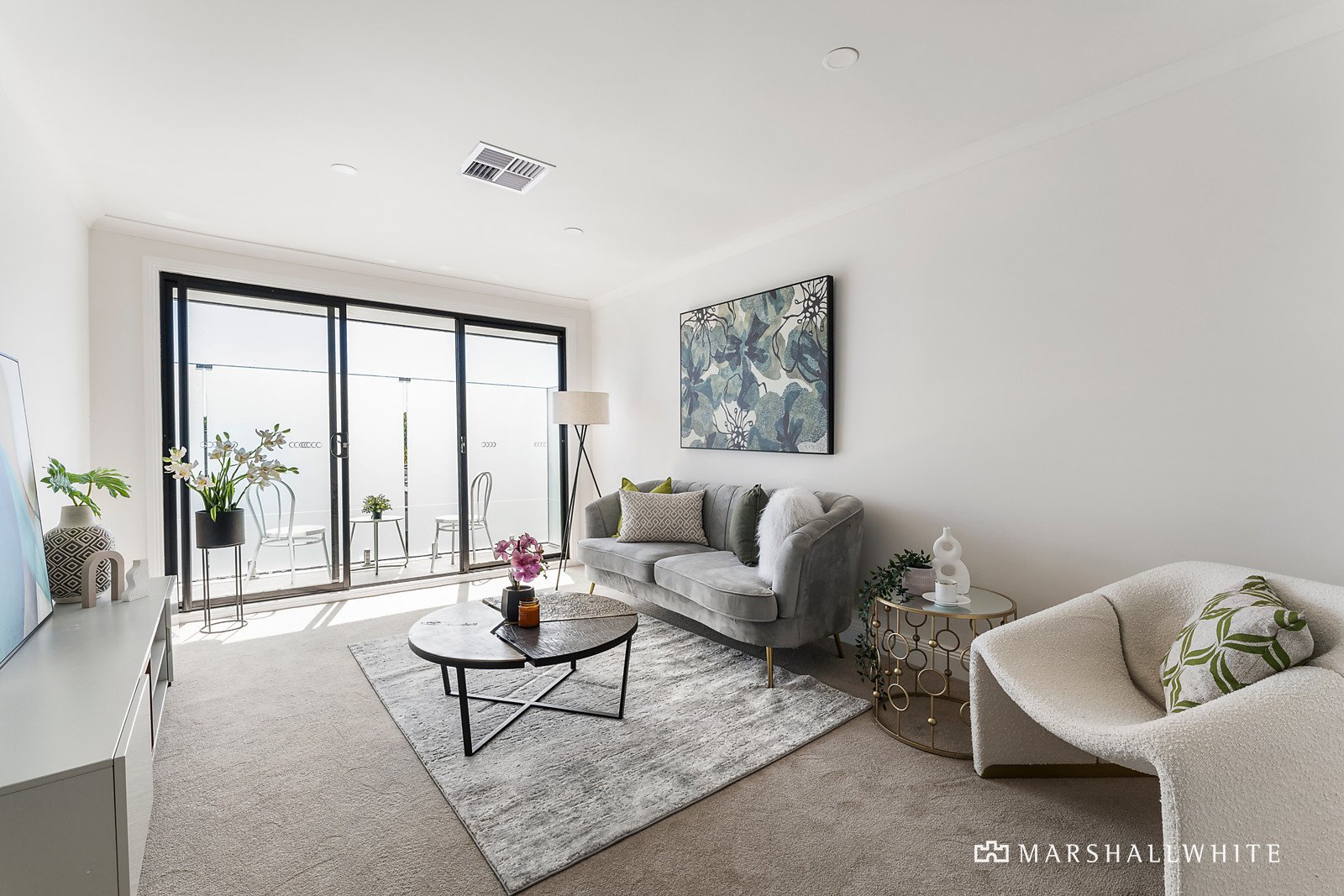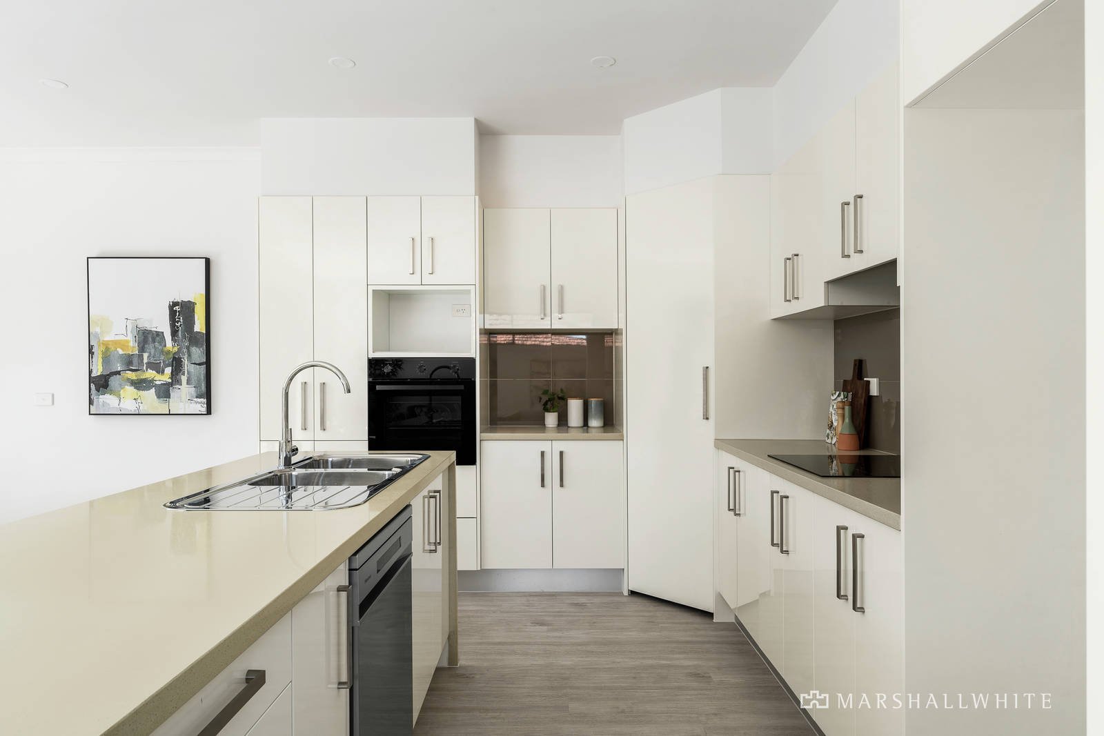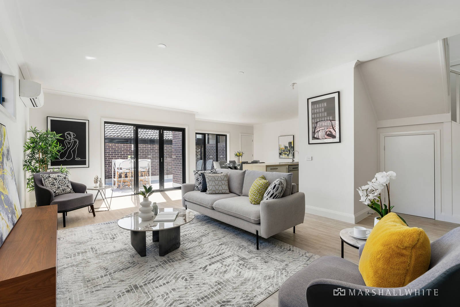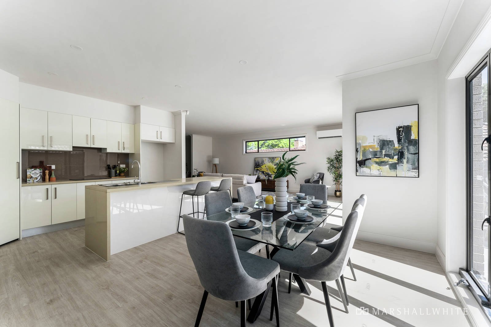 A vast open-plan living area highlights a clever study nook and is underpinned by a gourmet kitchen in which a stone-topped island bench with waterfall edges is complemented by stainless steel appliances, induction cooking and volumes of soft close cabinetry. Meanwhile, concertina doors fold back to introduce a paved courtyard that draws plenty of afternoon sun and is perfect for peaceful relaxation or a drink with friends.