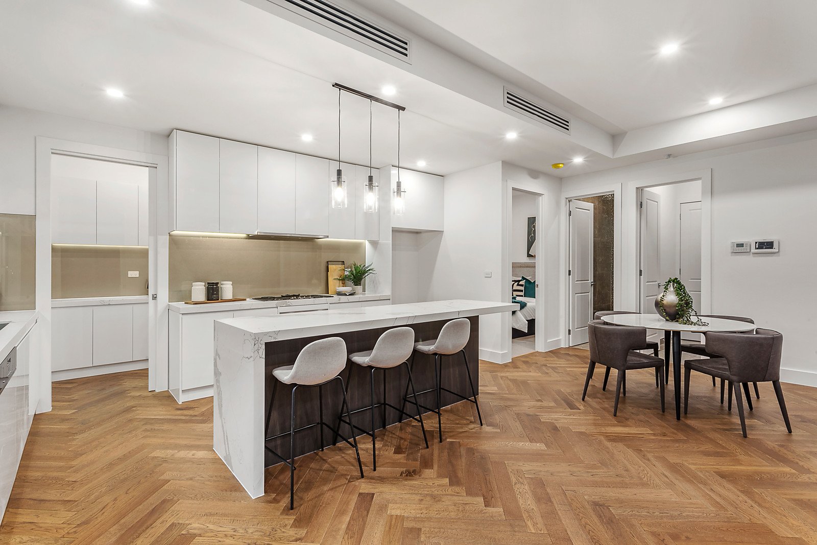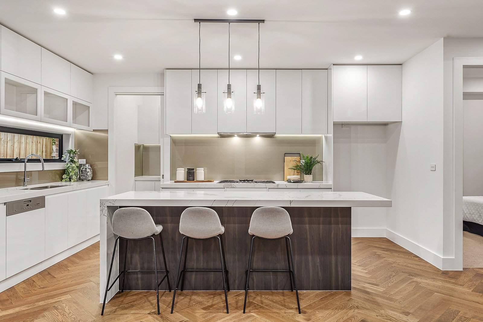 High ceilings accentuate the sense of space while oak parquetry floors add a wonderful level of refinement through the expansive living and dining room, which is bathed in northern light and opens to a private north-facing courtyard and deck. The sublime gourmet kitchen is appointed with stone benches, Miele appliances and a butler's pantry. A convenient downstairs main bedroom with designer en suite and walk in robe is matched upstairs by a alternative main bedroom with stylish en suite and walk in robe, two additional bedrooms with robes and shared en suite, a retreat or home office and powder-room.