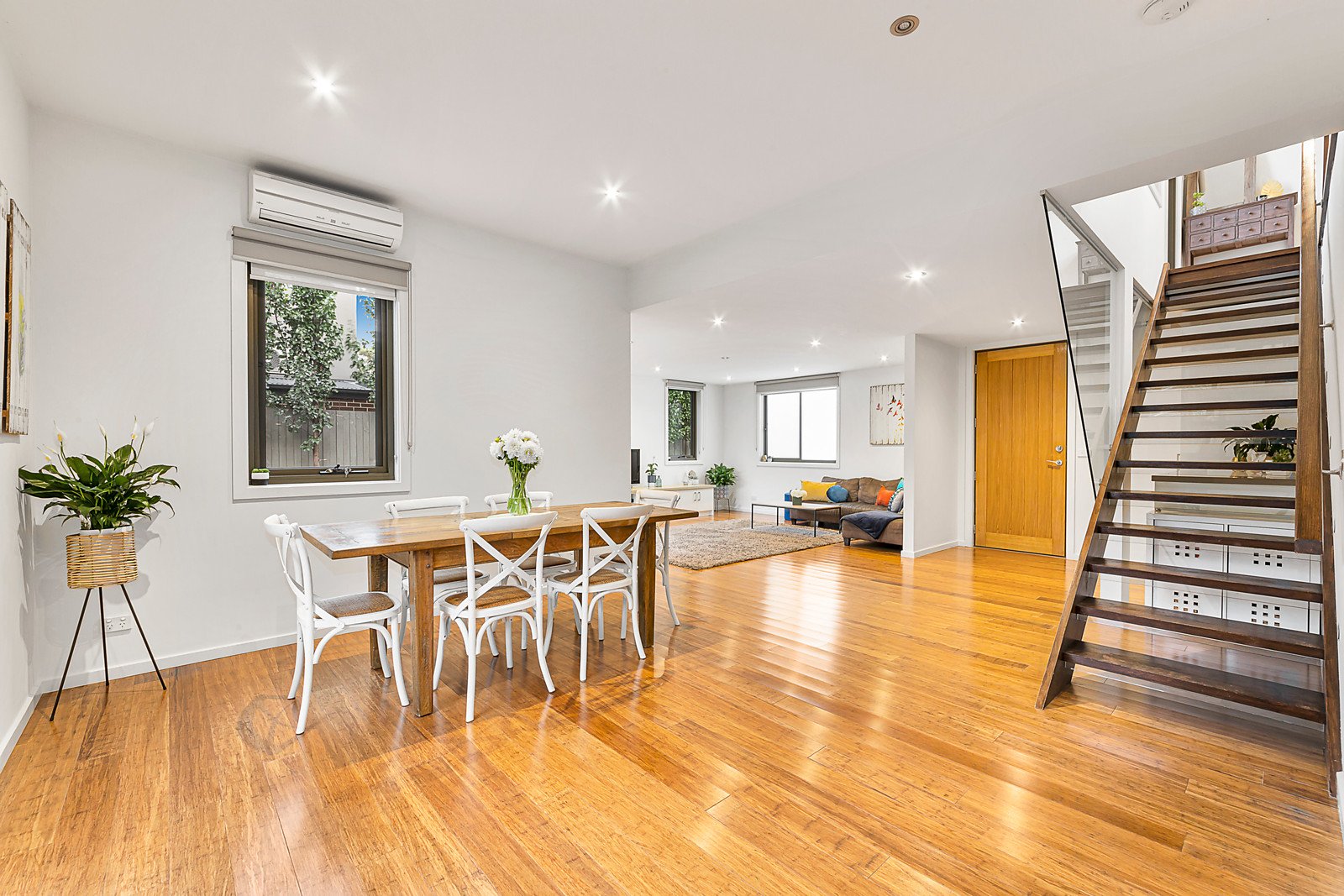 Durable bamboo floors flow through the exceptionally generous open plan living and dining areas served by a gourmet European kitchen with stone benches. The living spaces extend out to a private north and east facing landscaped garden and large sunny entertaining deck. Upstairs there are three very spacious bedrooms with built in robes, a chic bathroom and generous terrace enjoying views across the treetops. On the ground level, a second stylish bathroom includes a Euro-laundry.