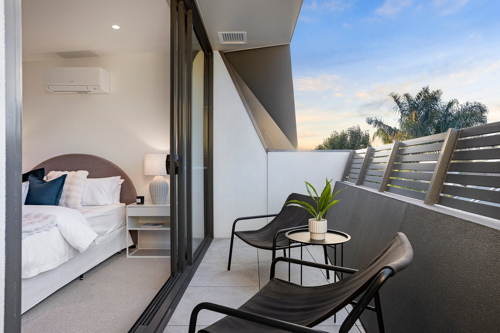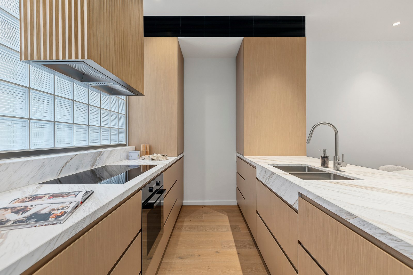 Surrounded by John Patrick greenery, Residence 2 is one of seven elegant townhouses in this newly completed prestige enclave designed with security and community in mind. An over-sized entry door opens to reveal wide-format timber flooring that flows through the ground level open plan living and entertaining zone, edged with custom stone and timber joinery and headed with a stone-topped gourmet kitchen equipped with Miele appliances including an induction cooktop, a multi-function oven and dishwasher. Floor-to-ceiling double glazing draws in an abundance of natural light and invites connectivity to the paved northerly facing alfresco courtyard, complete with built-in planters and day-bed seating.