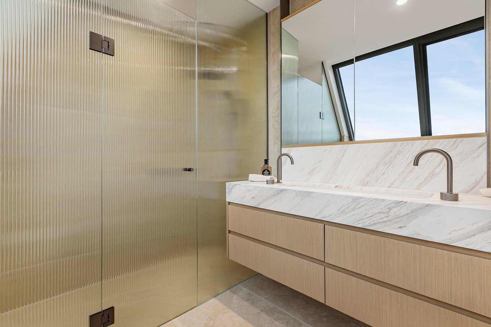 The upper levels showcase the home’s bespoke architectural design with large-format sloping angle windows creating an elevated sense of spaciousness. On the first floor are two generous-sized bedrooms, a separate study/work-from-home space, a seperate laundry and the floor-to-ceiling tiled luxuriously appointed main bathroom which has a large walk-in shower.