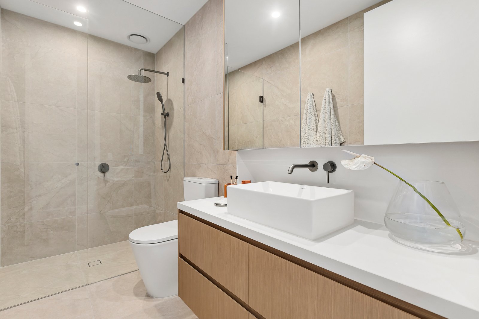 The indulgence is amplified in the parental domain with floor-to-ceiling sliding glass access to a private north balcony with far-reaching treetop views. A large walk-through robe leads to a light-filled ensuite with walk-in dual-head shower and designer twin-tapped stone vanity. Additional features include ducted and reverse cycle split system heating/cooling, wool loop pile carpets, and secure video intercom entry.