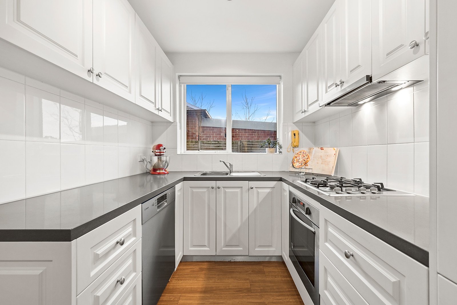 Appointed with attractive stone benches and premium stainless steel appliances, the kitchen overlooks generous dining / living all with durable timber-tone flooring and leafy outlooks through north-facing windows. Accessed securely via intercom entry, the home also offers an undercover parking space, vogue renovated bathroom / laundry, new built-in robes in each bedroom and split system heating with air conditioning.