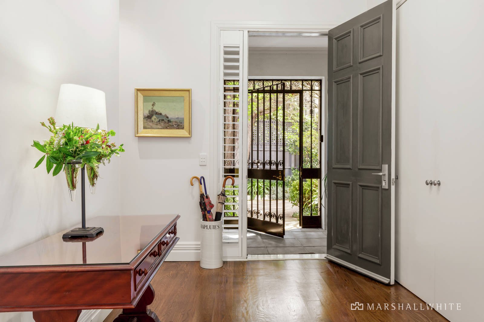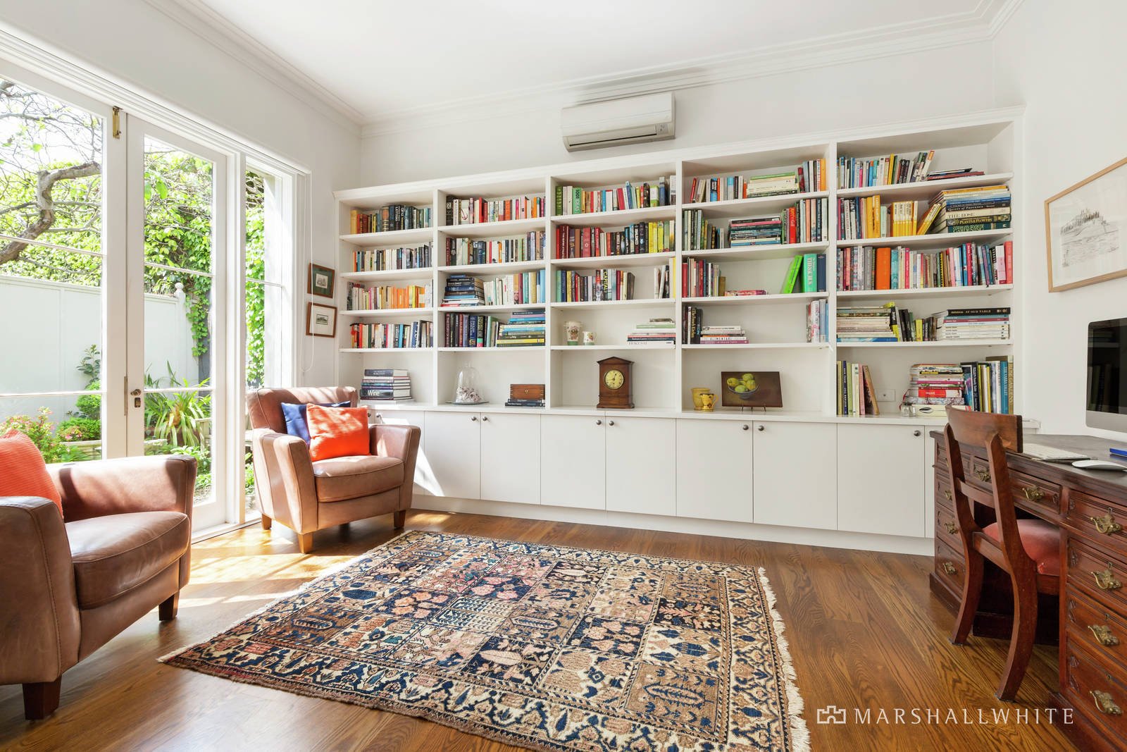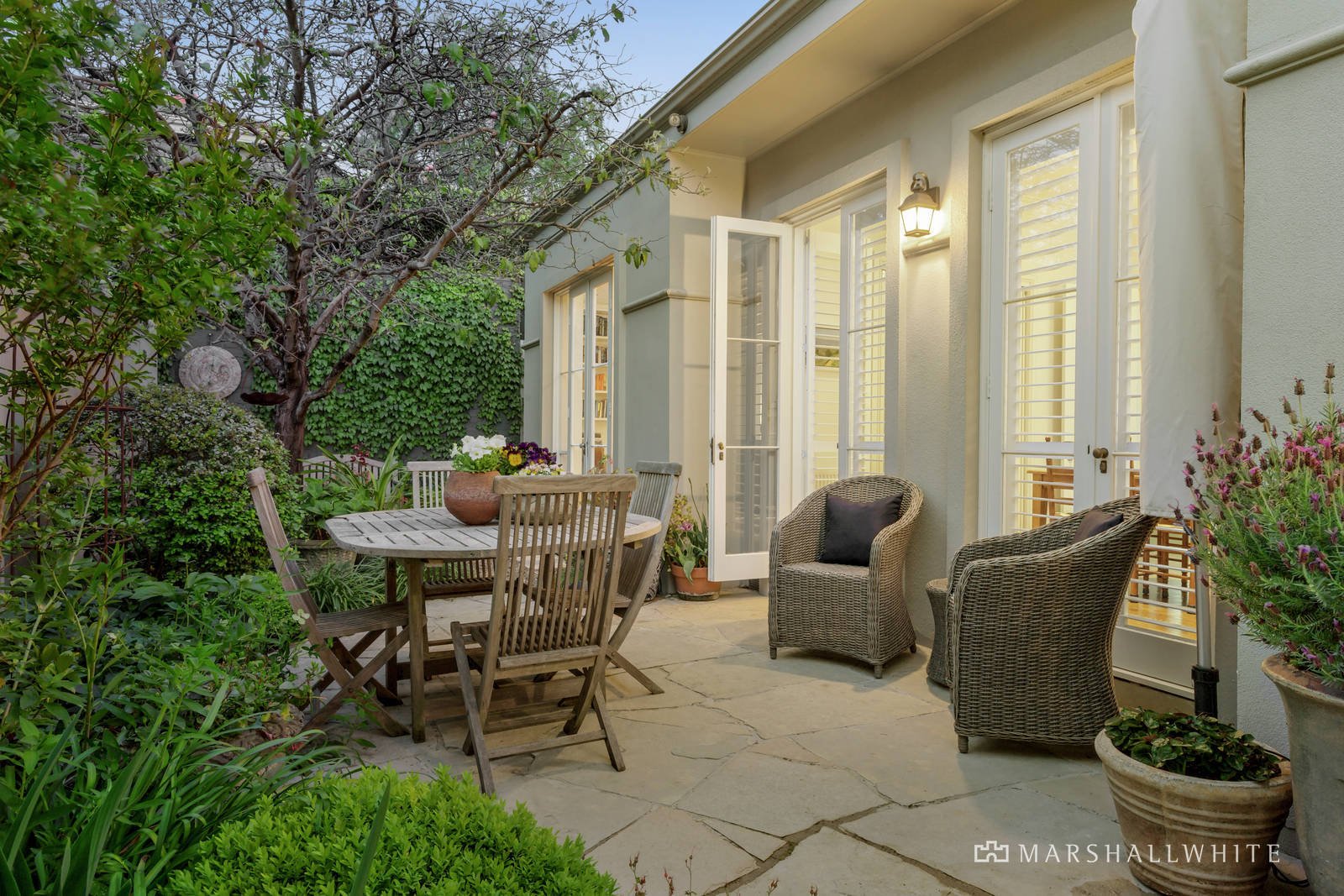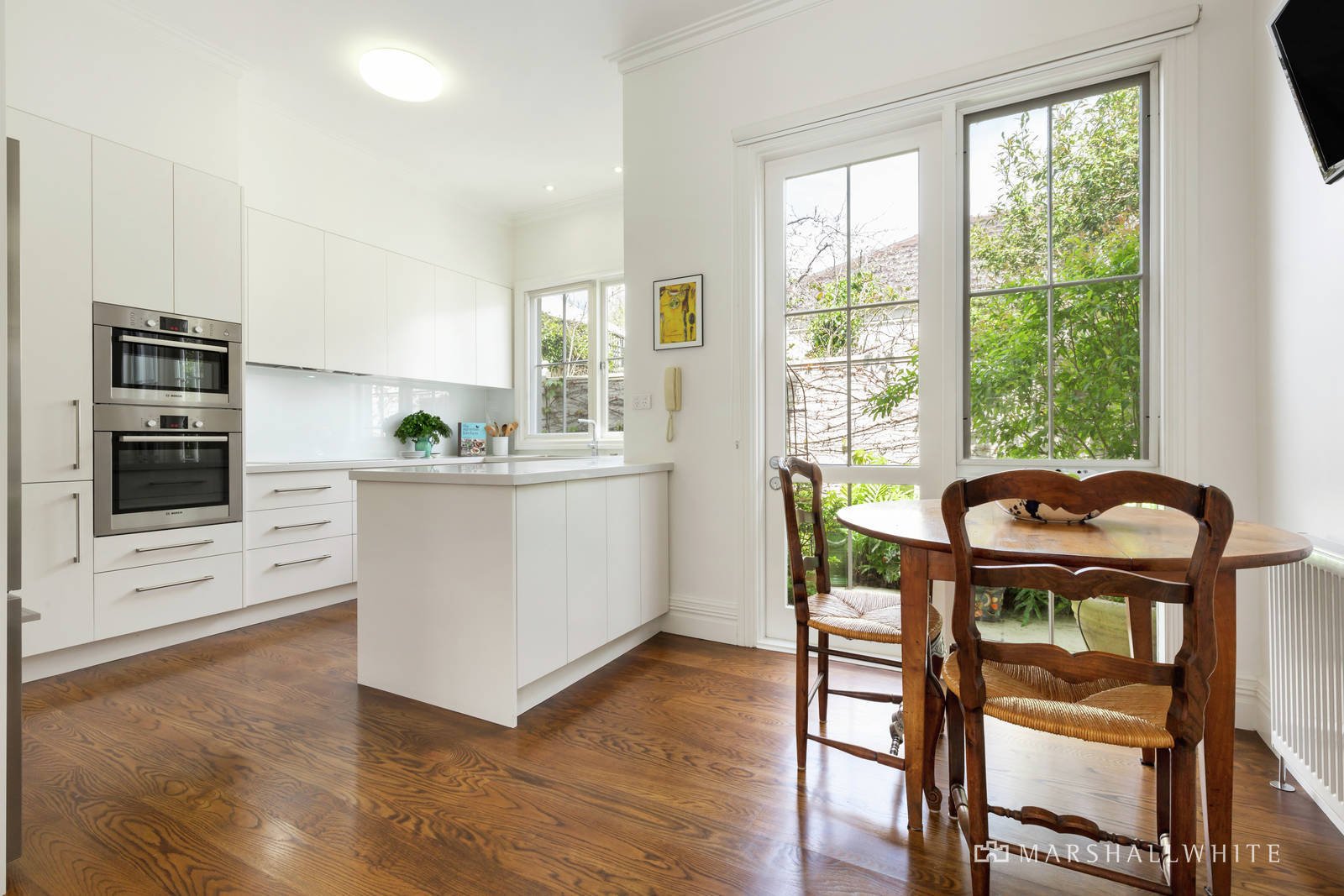 Rich oak floors and high ceilings define the wide entrance foyer, gracious sitting and dining room with gas fire, and a separate library or home office. All the living spaces open through a series of French doors to the picturesque, landscaped garden with a stone terrace in the midst providing the perfect setting for al fresco dining. The sublime gourmet kitchen featuring stone benches, Bosch appliances and a casual dining area opens to a second leafy courtyard. The expansive main bedroom with chic ensuite and walk-in robe is matched by a second double bedroom with built-in robe and stylish bathroom.