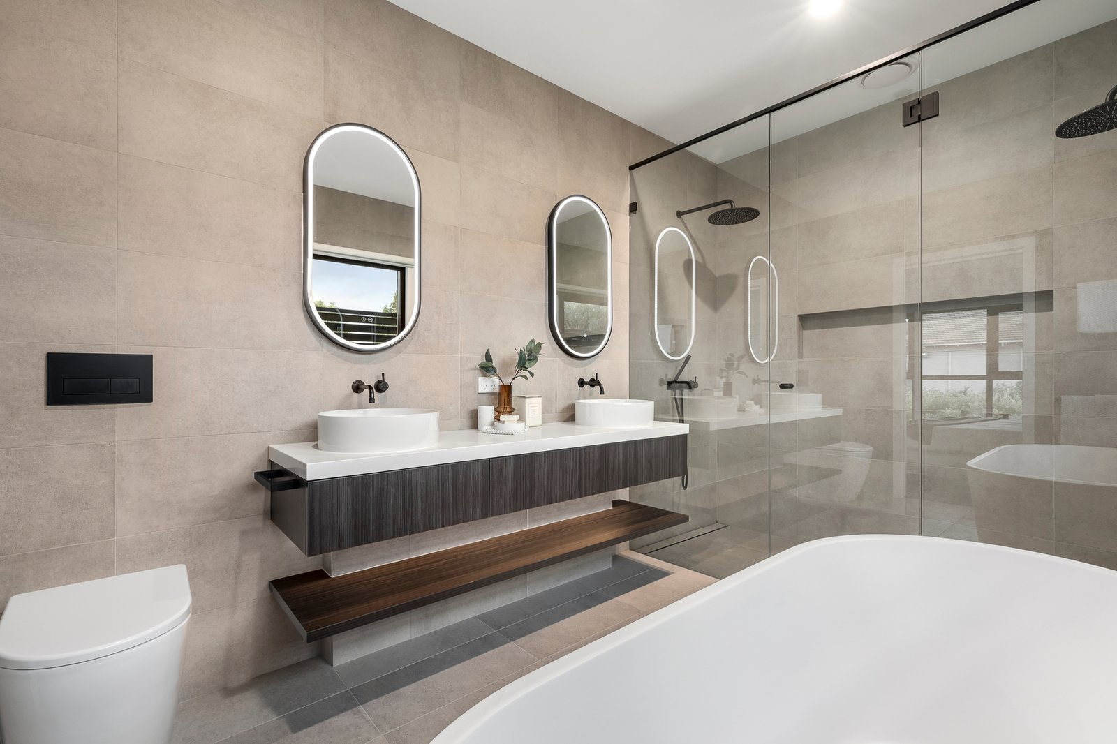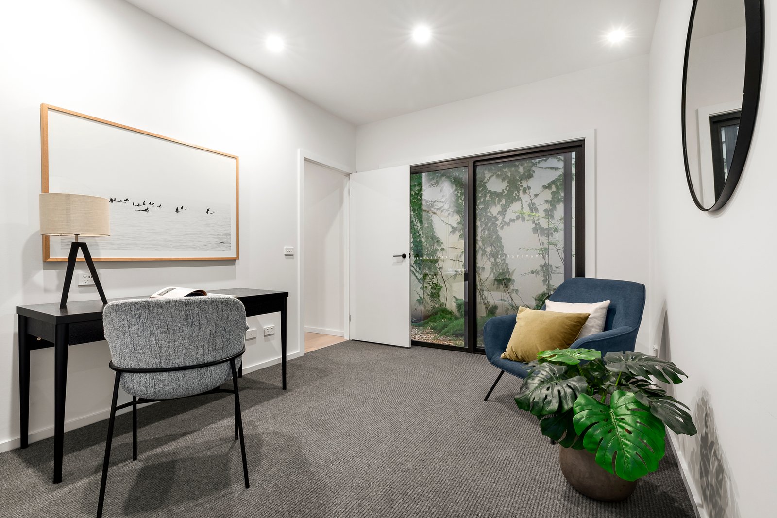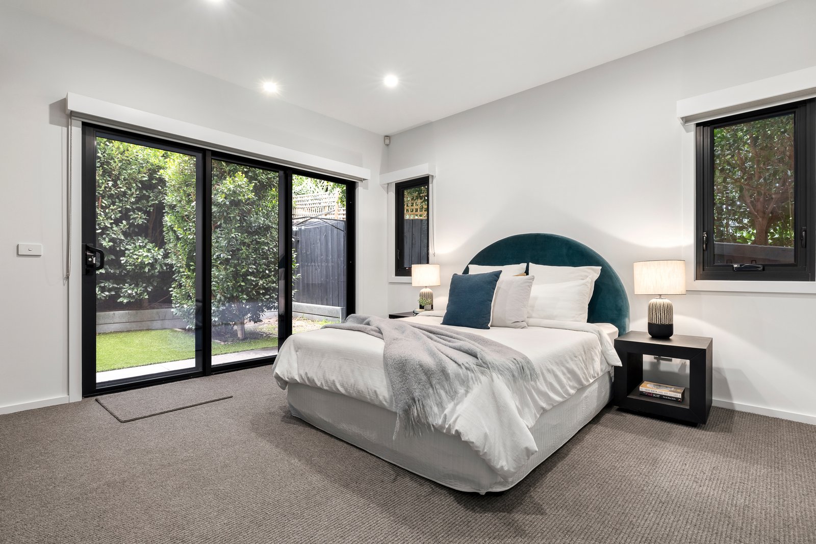 Set in landscaped terraced gardens and introduced by solid timber double width pivot entrance door, the stunning interior where high ceilings and floor-to-ceiling windows enhance the light and vistas. A crisp white décor matched to black and charcoal grey appointments, CaesarStone surfaces, wide oak floorboards and Signorina Italian tiles define the interior. On the lower level, a large light filled retreat/studio with a separate study, powder room and internal access to the garage which enables a teenager’s retreat, formal sitting room, or large home offices.