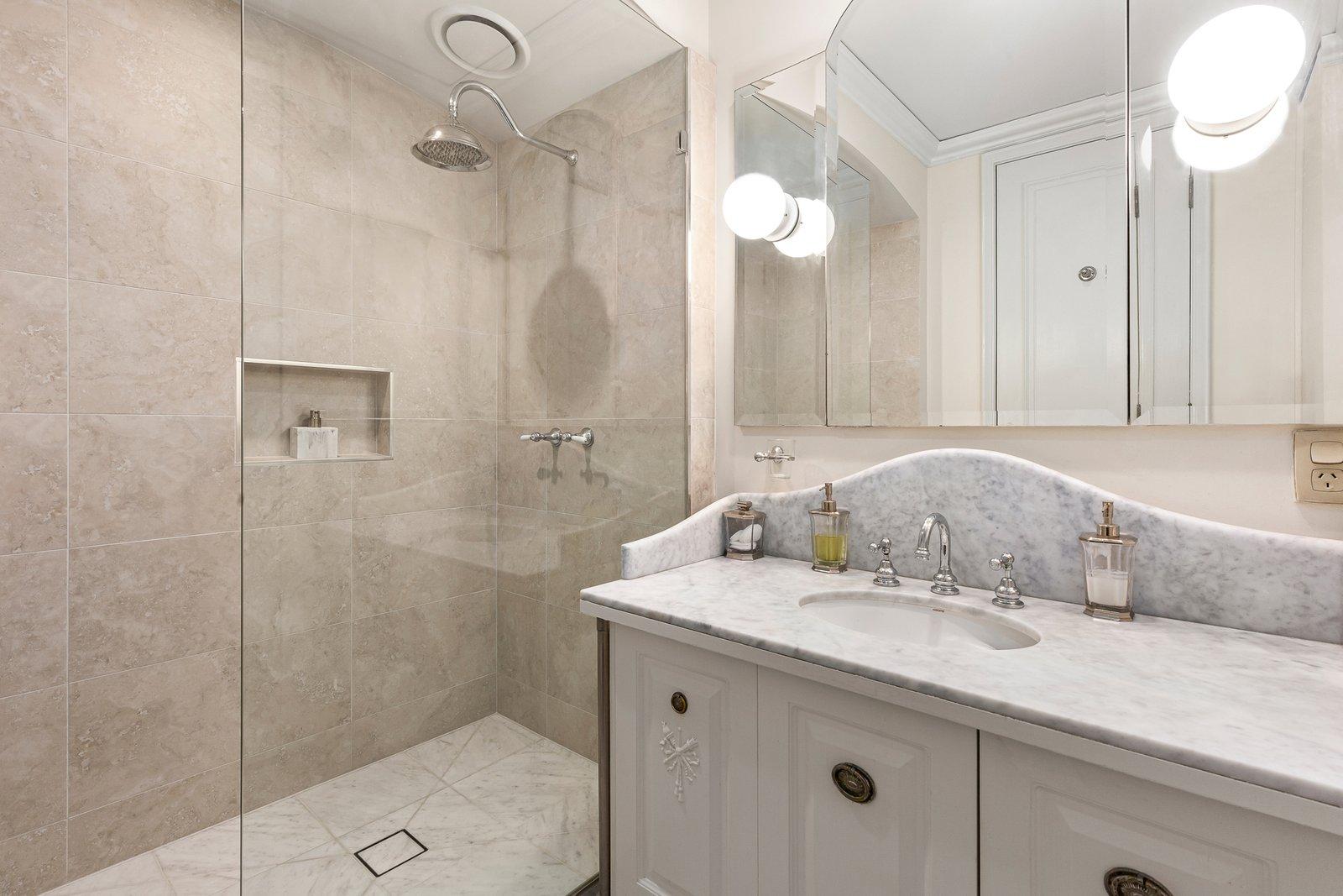 A marble bathroom features a European laundry with ample storage and an exquisite vanity, complemented by a separate powder room. Enviably situated within steps of Toorak Road trams and close to prestigious schools, Como Park and M1 access, it includes custom-made plantation shutters, bronze fittings and fixtures, reverse-cycle heating and cooling, abundant storage, video intercom and two secure car spaces on title.