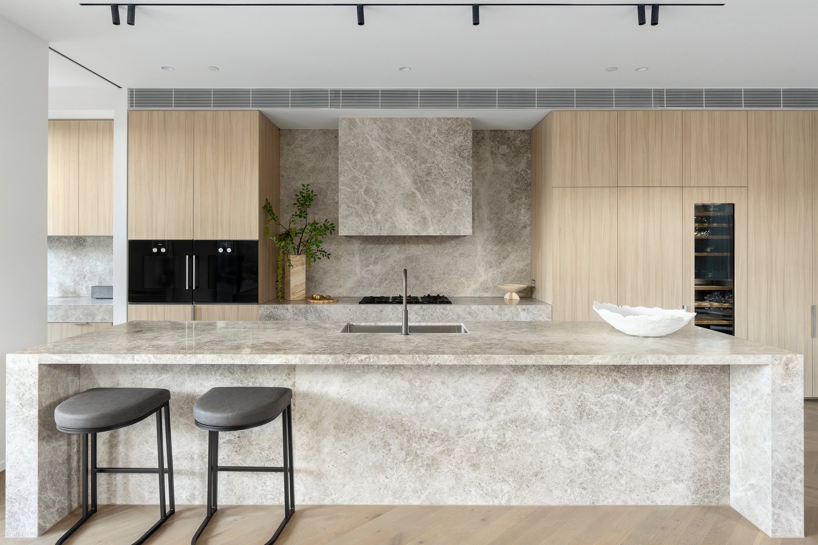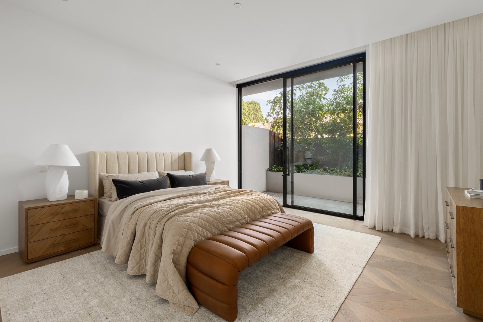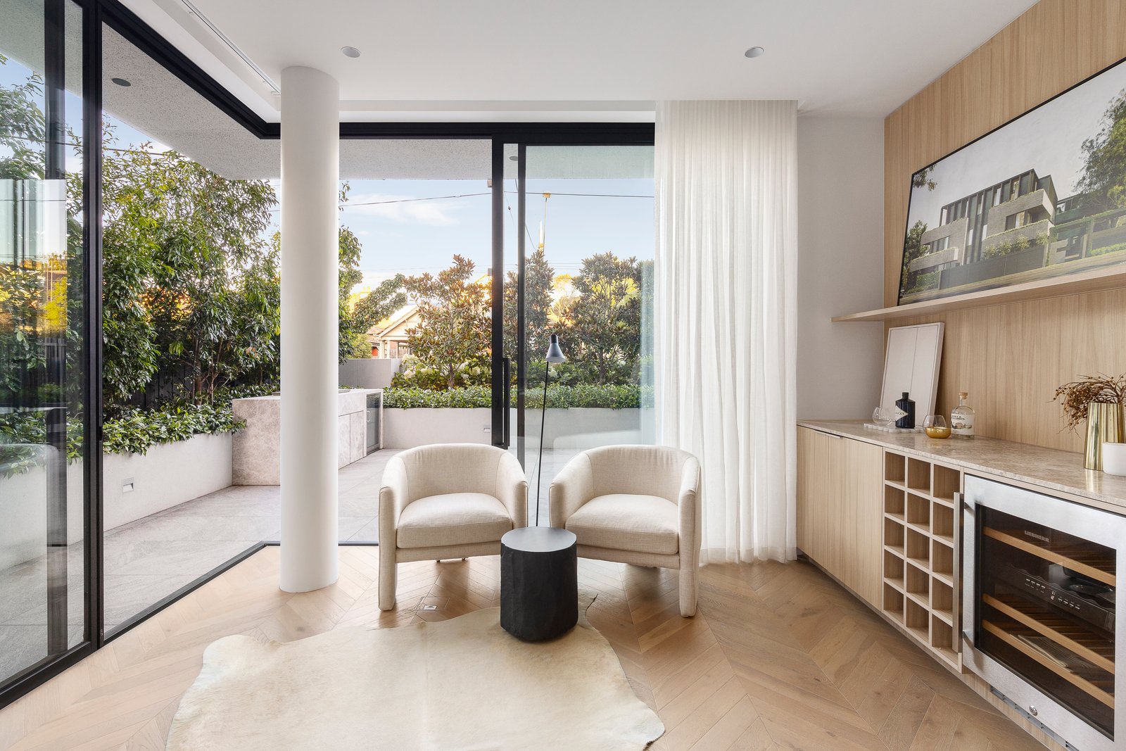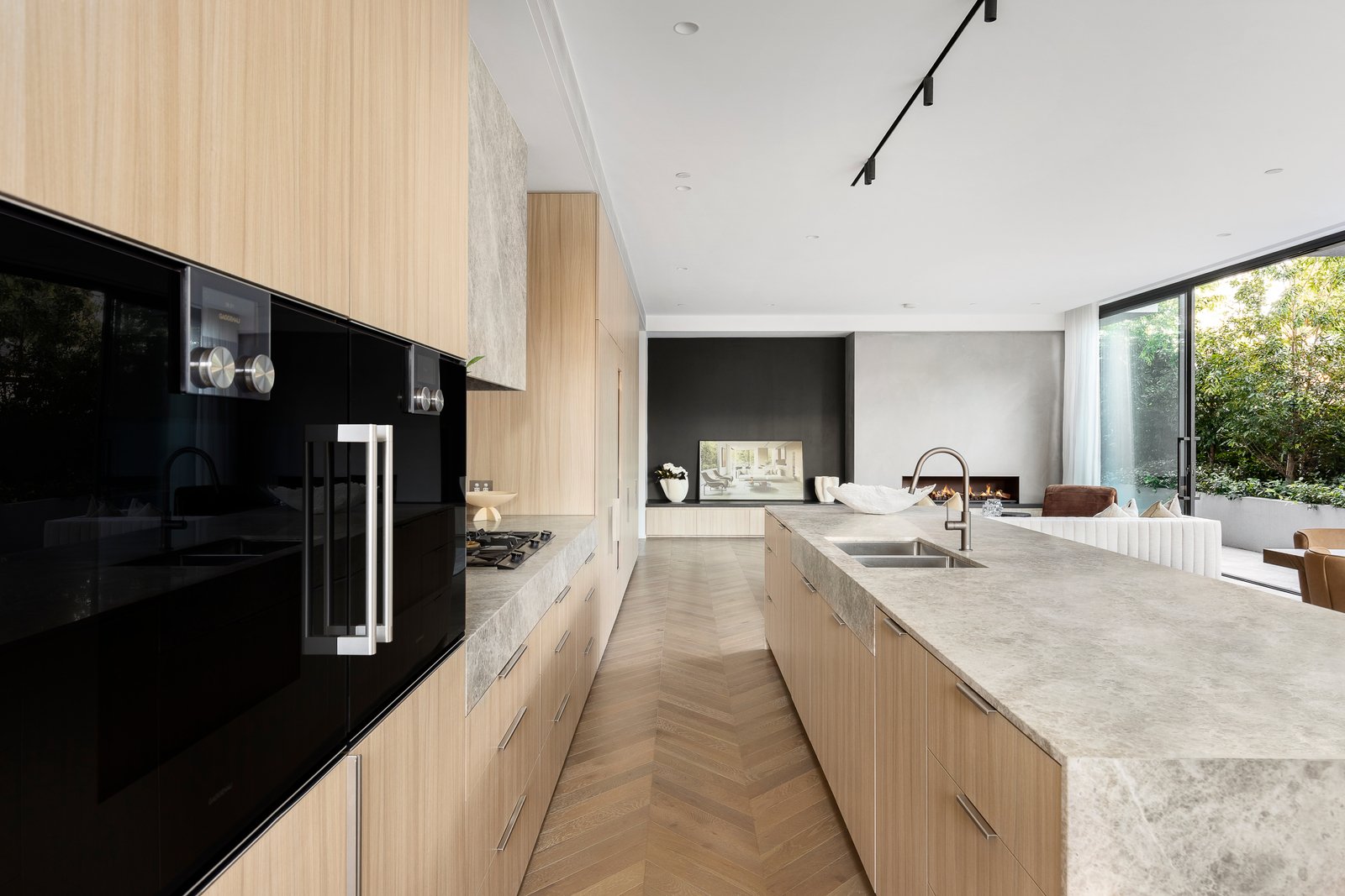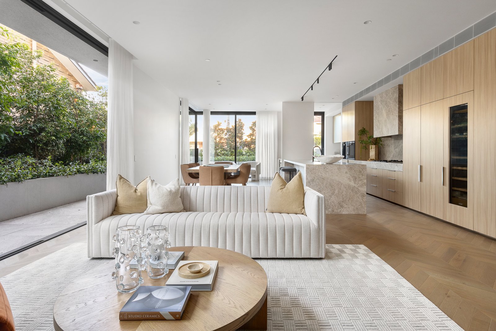 Spanning over 400m2 (237m2 internally), soaring 2.9m ceilings and rich Chevron oak parquetry floors create an impactful first impression in the wide entrance hall and palatial open plan living and dining spaces all surrounded with floor to ceiling glass providing glorious garden outlooks from every corner. Featuring a gas log fire and built in cocktail bar with Liebherr bar fridge, inviting both relaxed living and lavish entertaining catered by the state of the art gourmet kitchen appointed with Tundra stone, Gaggenau appliances, integrated fridge/freezer and a butler’s pantry. Stacking sliders open the living seamlessly to the stone paved north and east facing oversized terraces with a premium BBQ and bar fridge, serenely set against a backdrop of lush greenery. The opulent main bedroom with bespoke walk in robe and designer en suite and two additional king-sized bedrooms with robes and stylish en suites all open to the surrounding terraces.