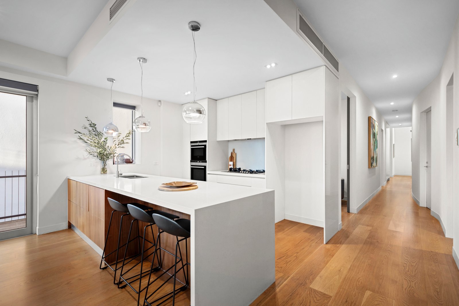 The adjoining kitchen, which features sleek stone benchtops and quality appliances, enriches a relaxed entertainer's layout, leading through sets of French doors to a full-length balcony enriched by a gas fireplace within the living room. Three generous and robed bedrooms within the hall boast plenty of natural light with soaring high ceilings, including the main bedroom with excellent robe storage and a private ensuite. With two additional stylish bathrooms, one with a steam sauna shower and the other with a freestanding bath, plus a large fitted study - ideal as a fourth bedroom with a pocket door slider, this offers an unbeatable blend of luxury and versatility, perfect for modern living.