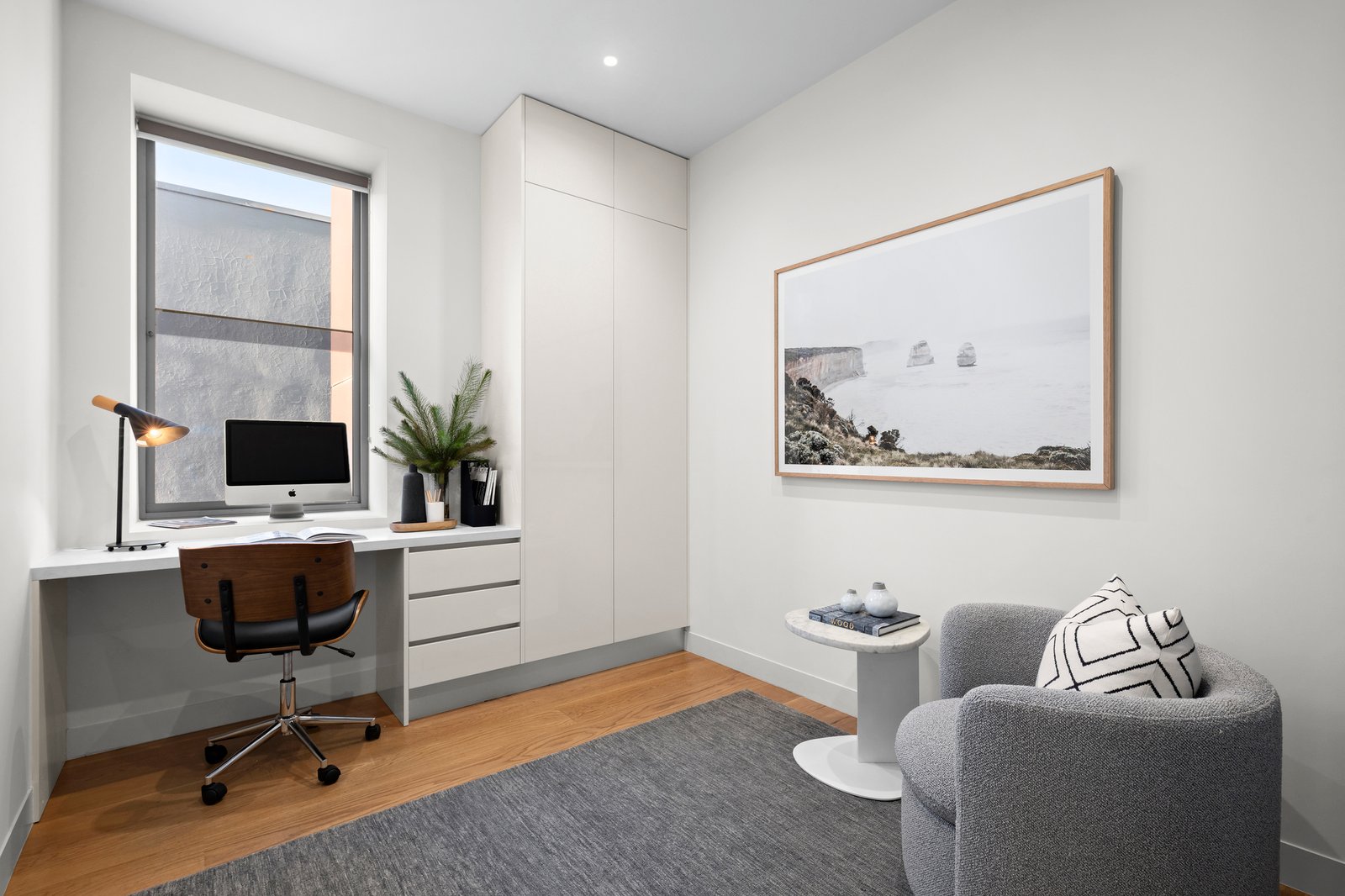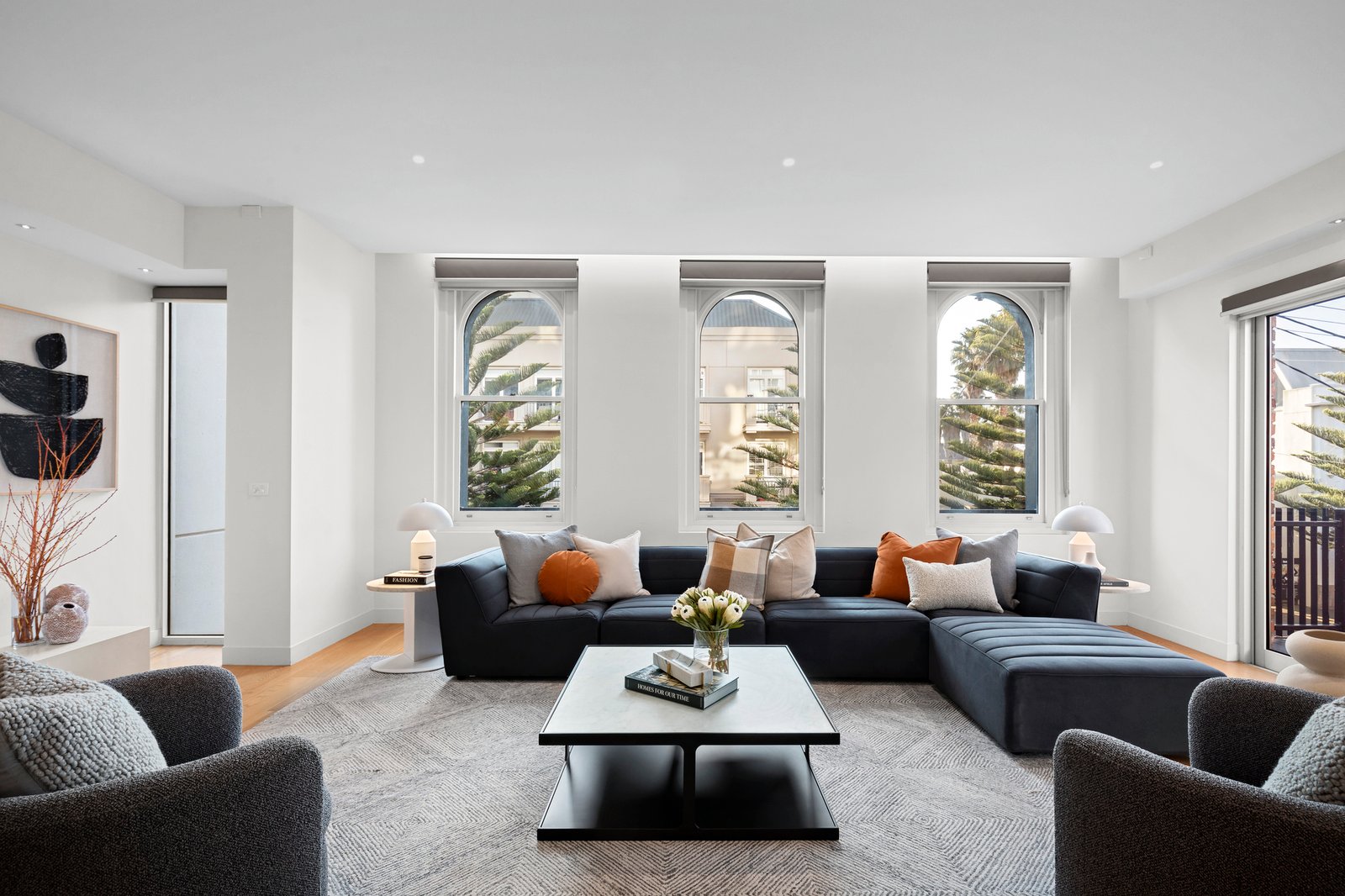 Irresistibly inviting beyond a Victorian façade (c1858), this unique four-bedroom or three-bedroom plus home office full floor apartment conversion, nestled just metres from the bay, embodies effortless urban beachside living across one incredible level. One of only two and illuminated with a north-west facing aspect and easily accessible with direct lift access, the home is a true oasis, providing city views and a free-flowing indoor-outdoor connection from the open living and dining zone.
