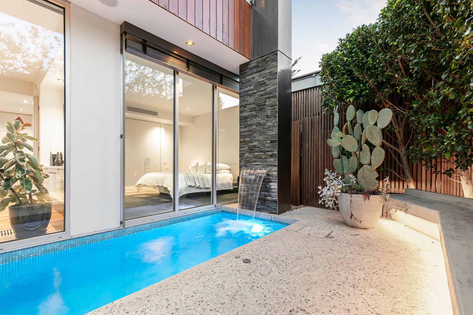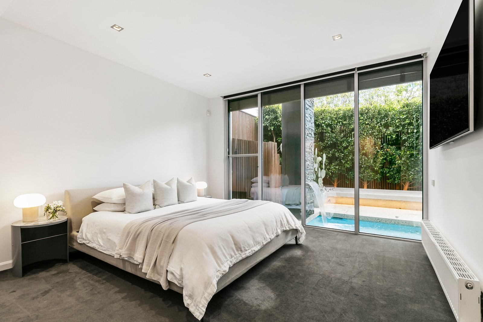 Idyllically set against a stunning north-facing entertaining precinct with spa/plunge pool, this sensational architect designed contemporary residence celebrates relaxed indoor-outdoor living through sun-drenched dimensions radiating with style and sophistication. Oak floors flow through the entrance foyer to the expansive open plan living and dining room with a premium gourmet kitchen appointed with lavish marble benches, Ilve and Siemens appliances and integrated fridge/freezer. A bank of full height bi-fold doors completely opens the living area to the picturesque north-facing outdoor precinct with gas heated self-cleaning plunge pool, form concrete bench seats and an undercover BBQ with concrete sink featuring strip lighting and a remote sun-awning. In its own space downstairs, the generous main bedroom with built/walk in robes and a designer en suite overlooks the pool while the upstairs children’s zone comprises two additional double bedrooms with robes, a spacious retreat, stylish bathroom and a large north-facing sundeck.