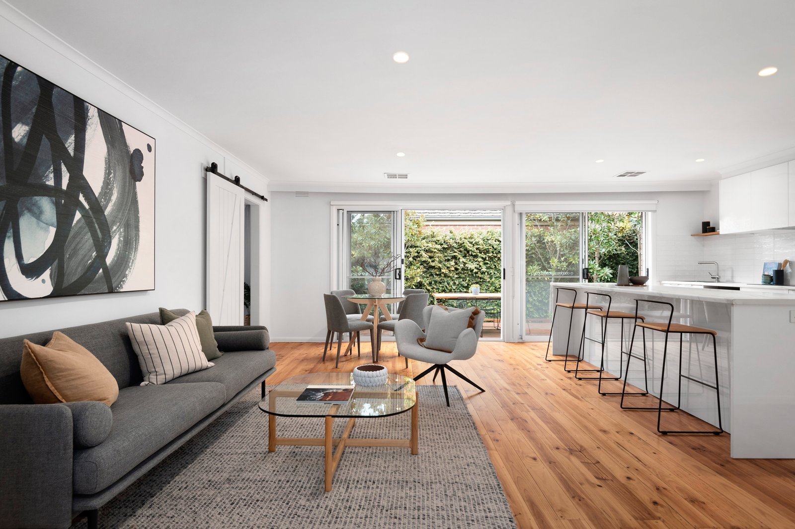 In a tranquil enclave comprising five brick-built homes, manicured gardens create the inviting setting for this incredibly flexible four-bedroom home. The ideal setting for everyday living and easy entertaining is presented by the open-plan living room that opens through sliding doors to a picturesque outdoor deck and garden with magnolia tree borders.