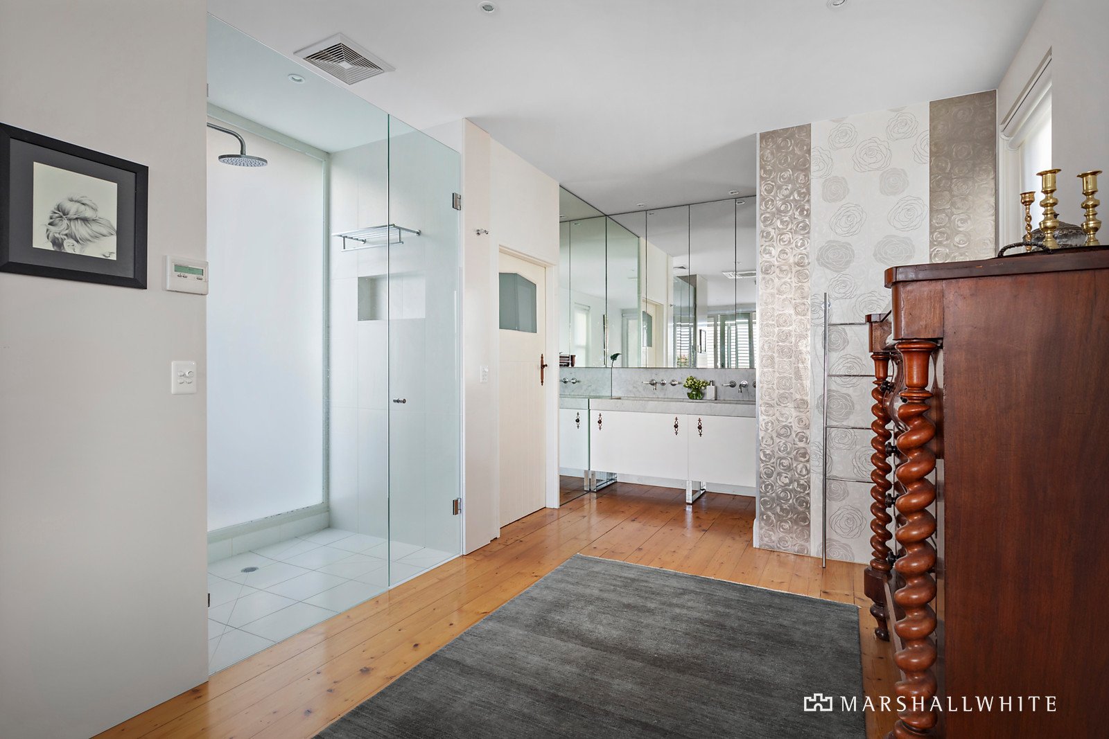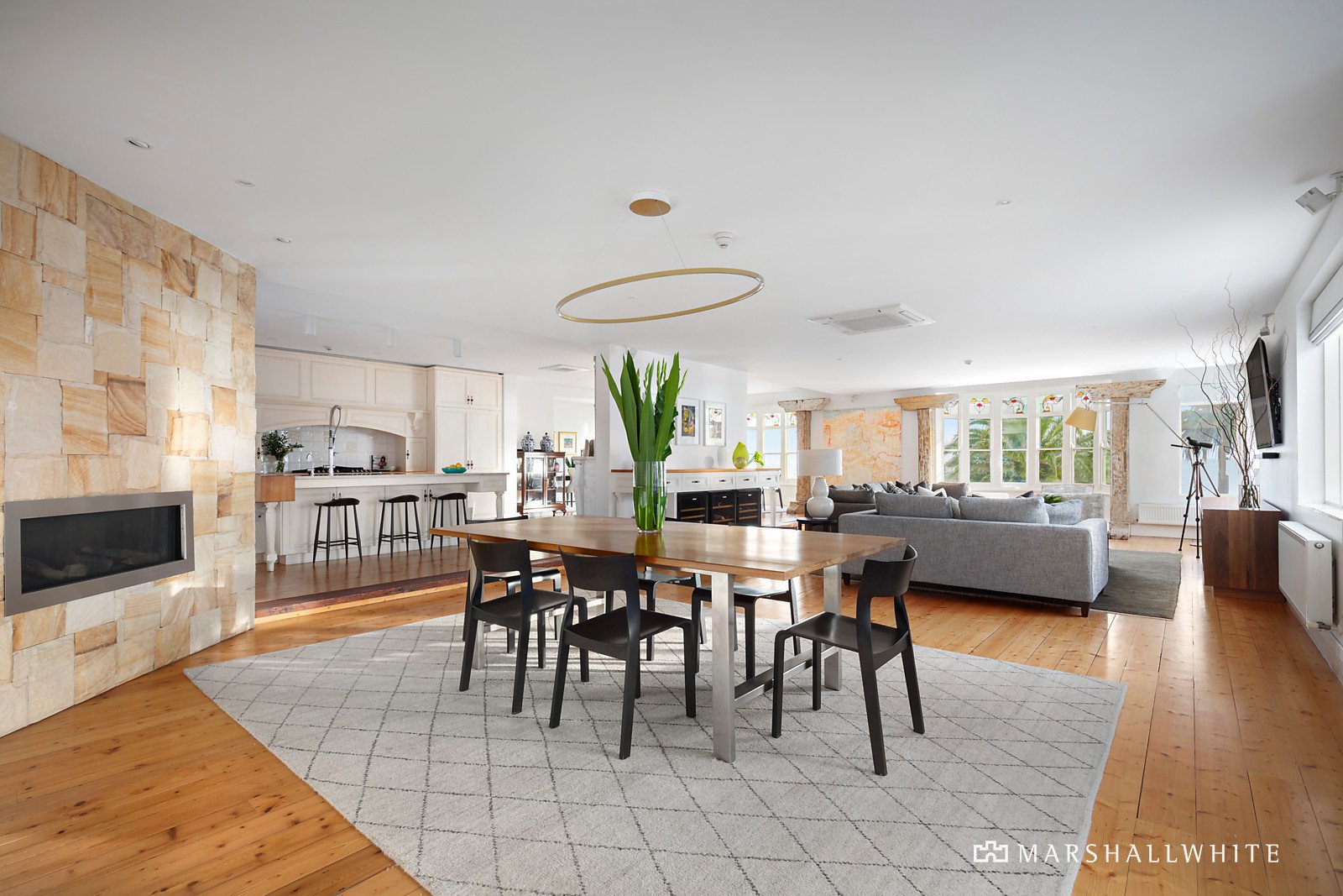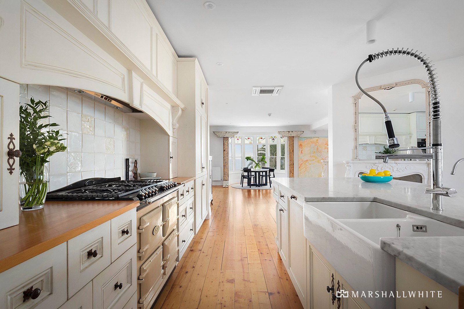 At the heart, a gourmet provincial kitchen has been appointed to the highest standard, with a central marble island with a built-in butcher block, an AGA stove, walk in pantry and a suite of integrated Miele appliances, including a double fridge/freezer and coffee machine. A gas fireplace adds undeniable warmth to the sprawling entertainer's space, flowing through the main wing, with its luxurious open ensuite, double glazing, private north-facing balcony, gas fireplace and glistening city views.