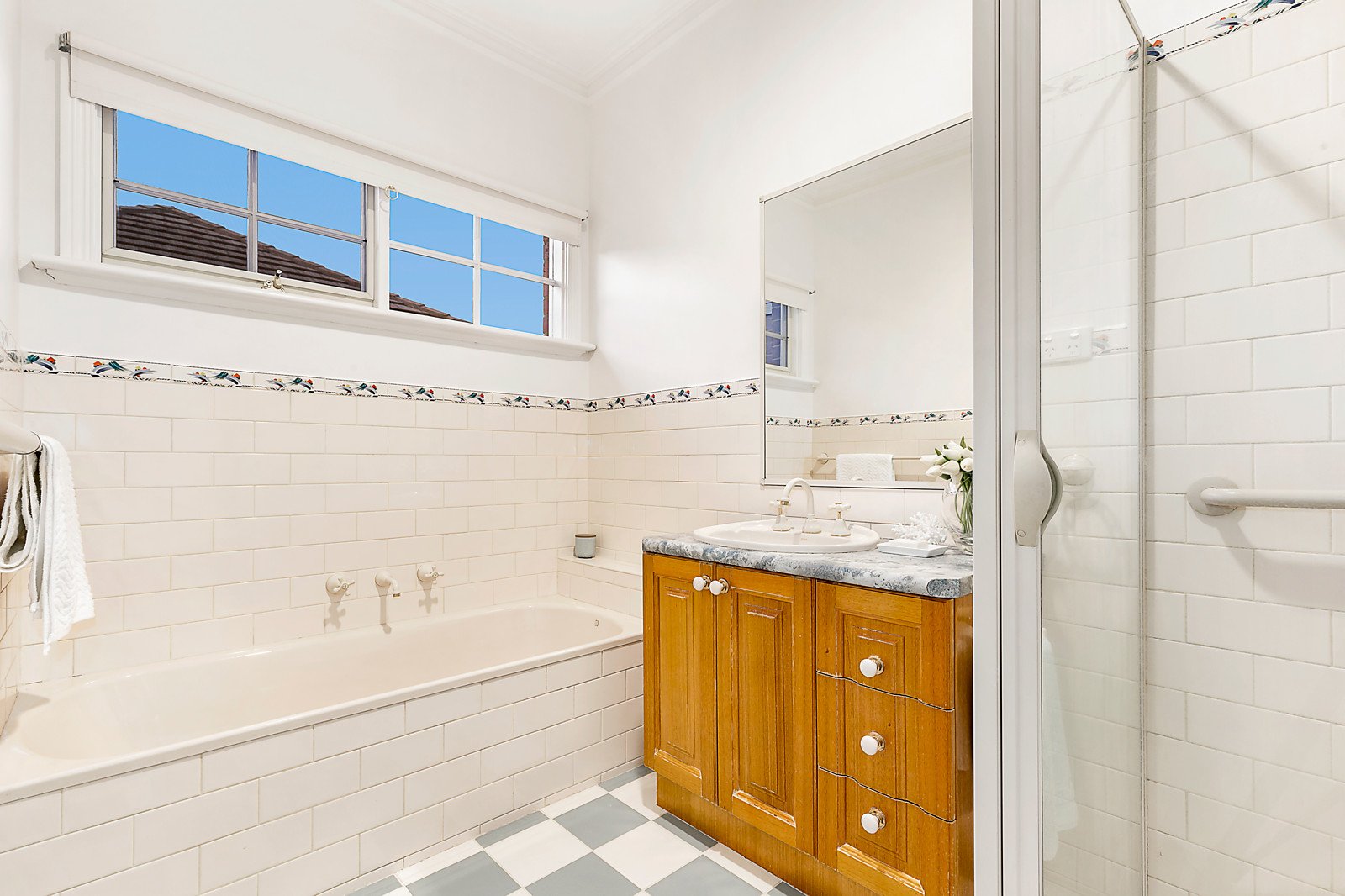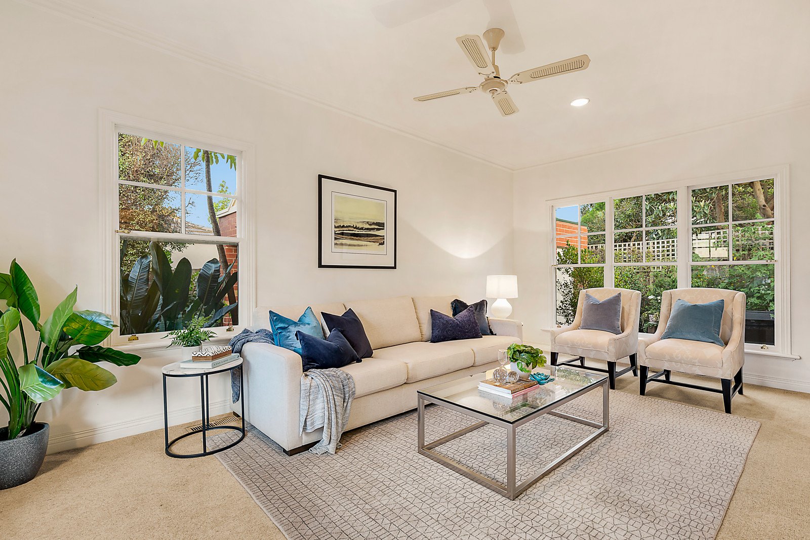 The spacious, light-filled interior benefits from a preferred northern rear aspect and features sitting room with box bay window and adjacent dining room, two bedrooms both with BIRs, a pristine bathroom with a separate WC plus a stylish, well-equipped timber kitchen/meals and adjoining laundry leading to a sun-drenched outdoor dining area in a leafy courtyard. Other features include ducted heating, R/C air conditioner, ceiling fans and remote garage with turning area.