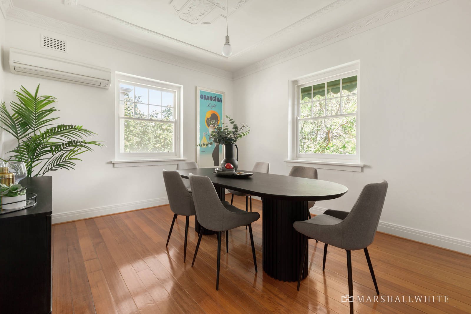 Ornate ceilings and timber floors define the wide entrance hall with bespoke joinery, gracious living room with an open fire and a beautiful dining room served by a separate modern kitchen appointed with Miele/Bosch appliances. The two spacious bedrooms with built in robes are accompanied by a stylish bathroom and laundry.