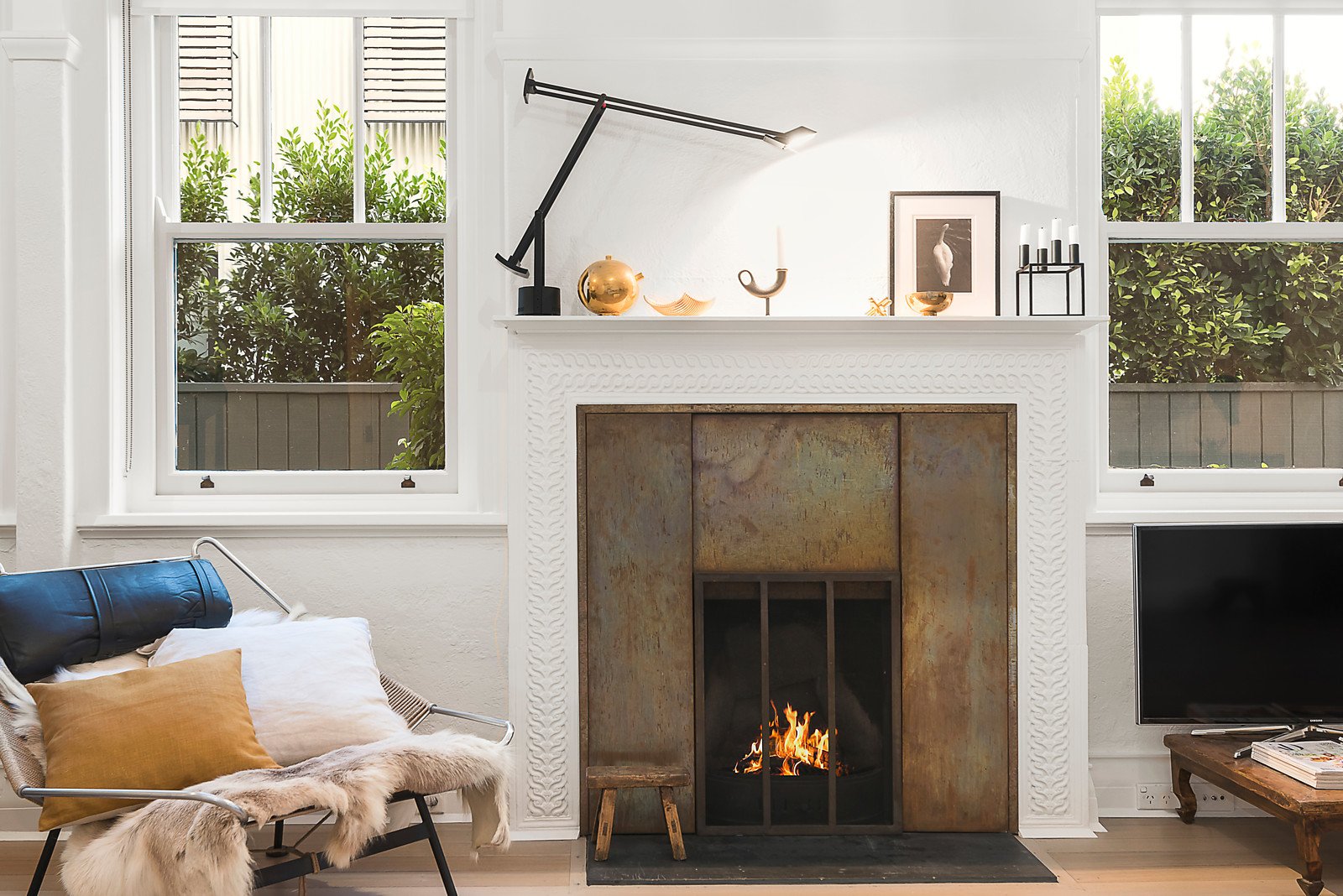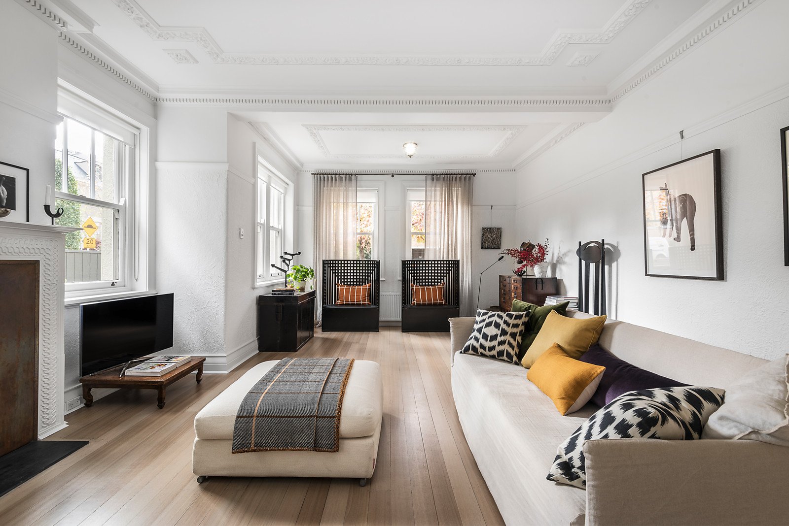 Enjoying both northern light flow and garden outlooks, the exceptionally spacious and flexibly arranged living and dining room features ornate ceilings, limed timber floors and an evocative copper fireplace. A triumph of design and function, the sublime separate kitchen is appointed with marble benches, Miele appliances and an integrated fridge/freezer. Superbly proportioned, the beautiful main bedroom and second spacious bedroom with study area offering city views, are both fitted with custom designed robes. Also enjoying views of the city, the bathroom is a statement in style. The sleek laundry is also ideal as a bar when entertaining.
