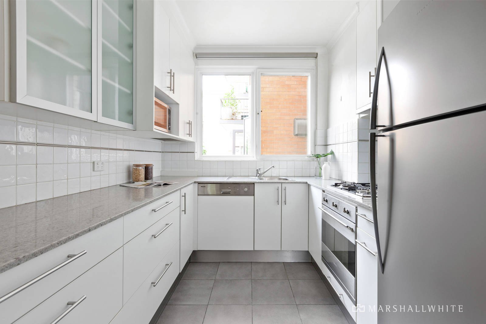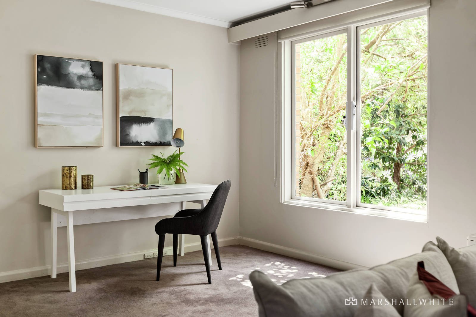 The quintessential Toorak classic that blends a light-letting, mid-twentieth Century sense of proportion with a timeless refurbishment, this enormous two bedroom garden apartment exudes the feel and flexibility of a small house. As it spills lavishly outdoors to the lushly garden-surrounded privacy of its north-facing outdoor living, the apartment is a genuine celebration of one of Toorak's most rewarding, tree-lined streetscapes. A stone-topped kitchen with a selection of Miele and SMEG appliances sits semi-attached to both a dining area and a large lounge that accommodates work-from requirements with an open study area, all while huge north-facing windows provide a delightful outdoor connection. Additional highlights include substantial built-in robes in each bedroom, a modern bathroom with a frameless-screened shower, a concealed laundry, split system heating and air conditioning, as well as carport parking with a storage unit. Few can match the privilege and prestige of this iconic Toorak position near wonderful cafes and trams along both Toorak Rd and Glenferrie Rd, as well as trains from Kooyong Railway Station and beautiful trails along the Yarra River.