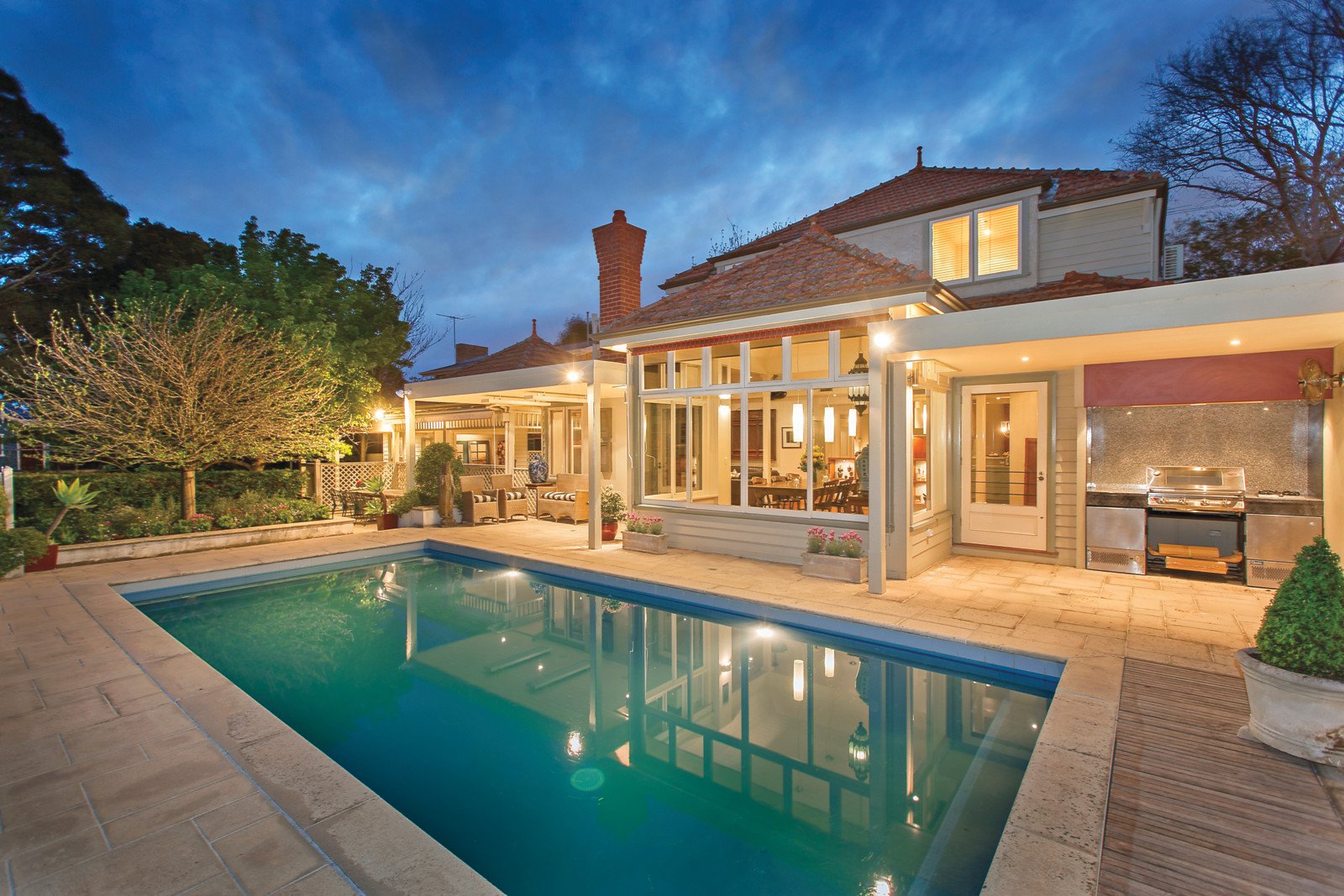 This generously proportioned Federation family residence enjoys a wide frontage and large garden allotment behind a Cyprus hedge with wonderful family recreation facilities. The home is beautifully presented with the interior featuring many original attributes including box bay windows reflecting its era but blending harmoniously with contemporary living and entertaining areas.The zoned accommodation includes glossy Baltic Pine floors, formal sitting and dining, study (sep.entrance), main bedroom with WIR & ensuite, powder room; plus a generous family living area with a stylishly appointed granite kitchen with Ilve stainless steel gourmet stove, Miele dishwasher, WIP, cellar, bathroom and separate laundry. Whilst upstairs has four bedrooms, children's retreat, balcony and a family bathroom. Outdoor entertaining is perfectly catered for with an outdoor kitchen, sandstone alfresco area surrounding a pool and a separate child's play area. Other features include alarm, hydronic heating, marble FPs, R/C air conditioners, remote gates, double carport and extensive storage.