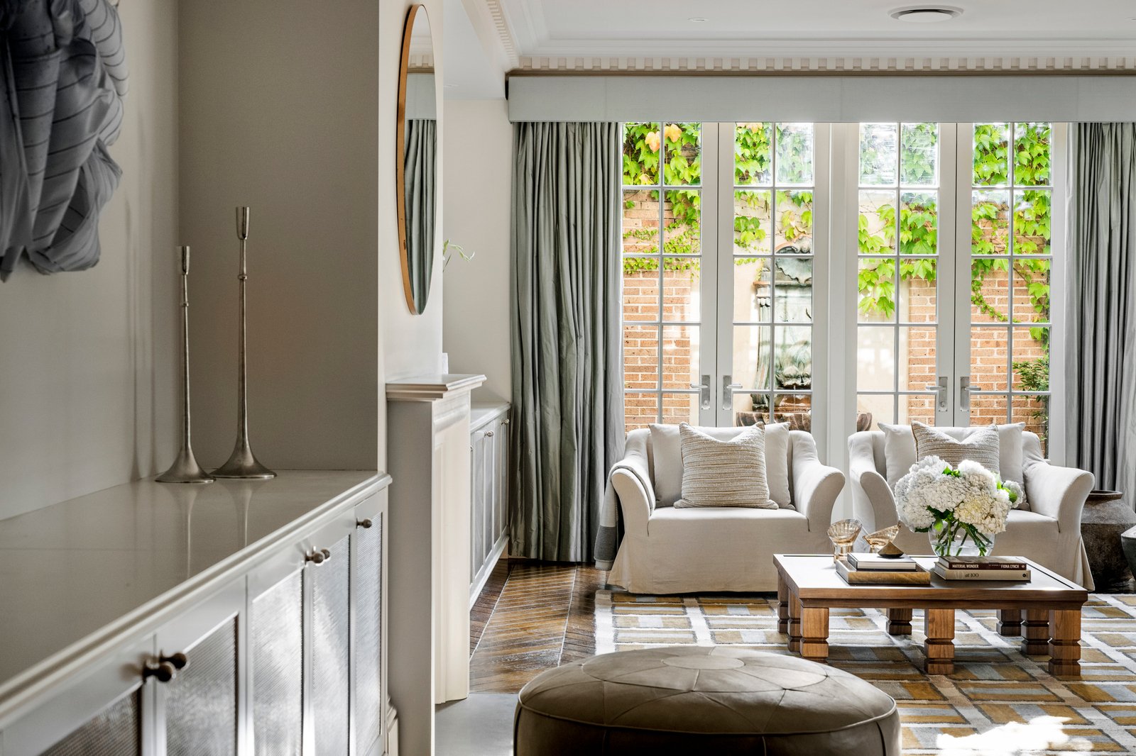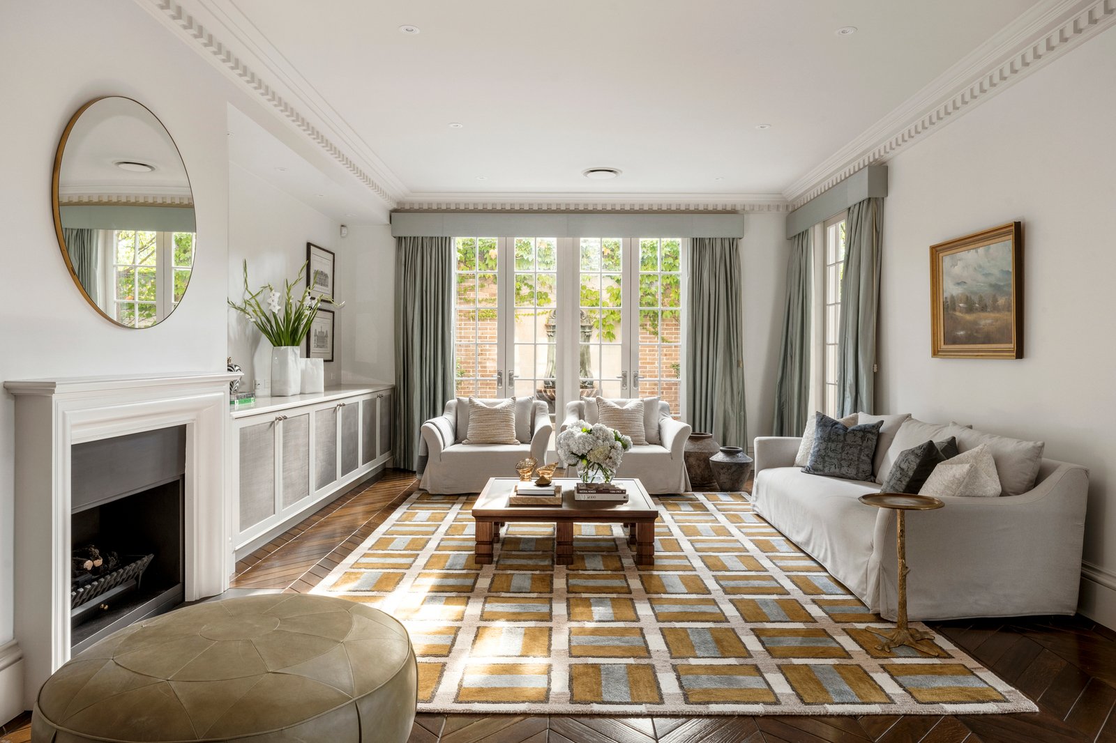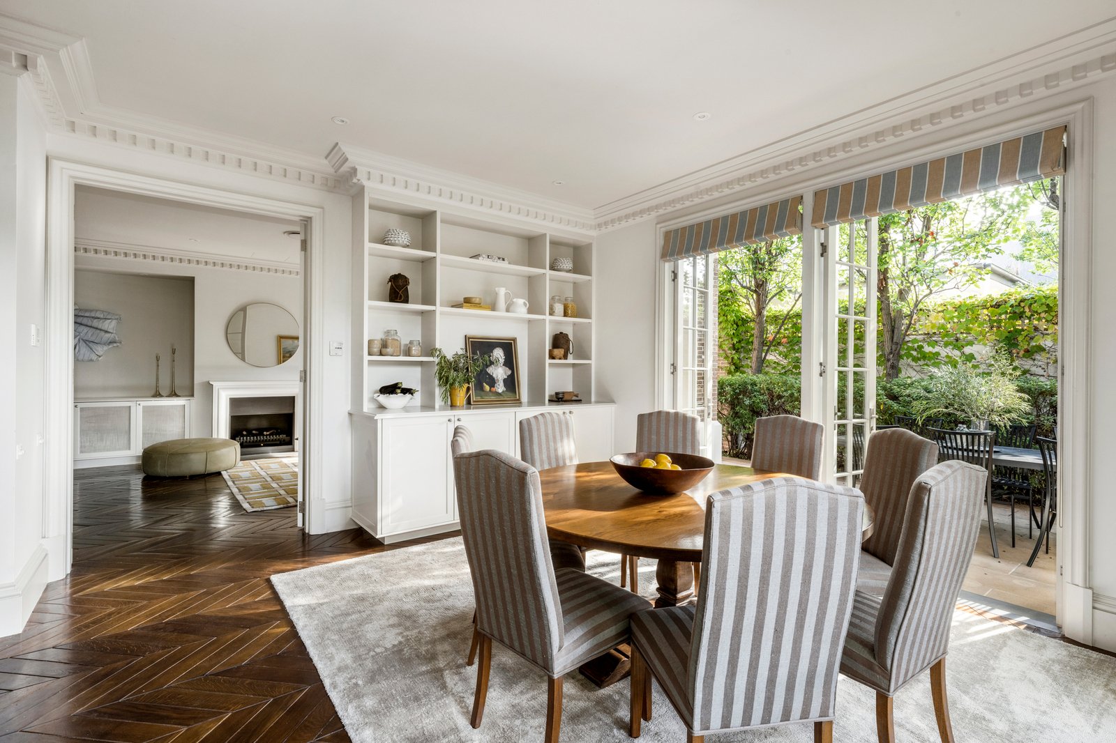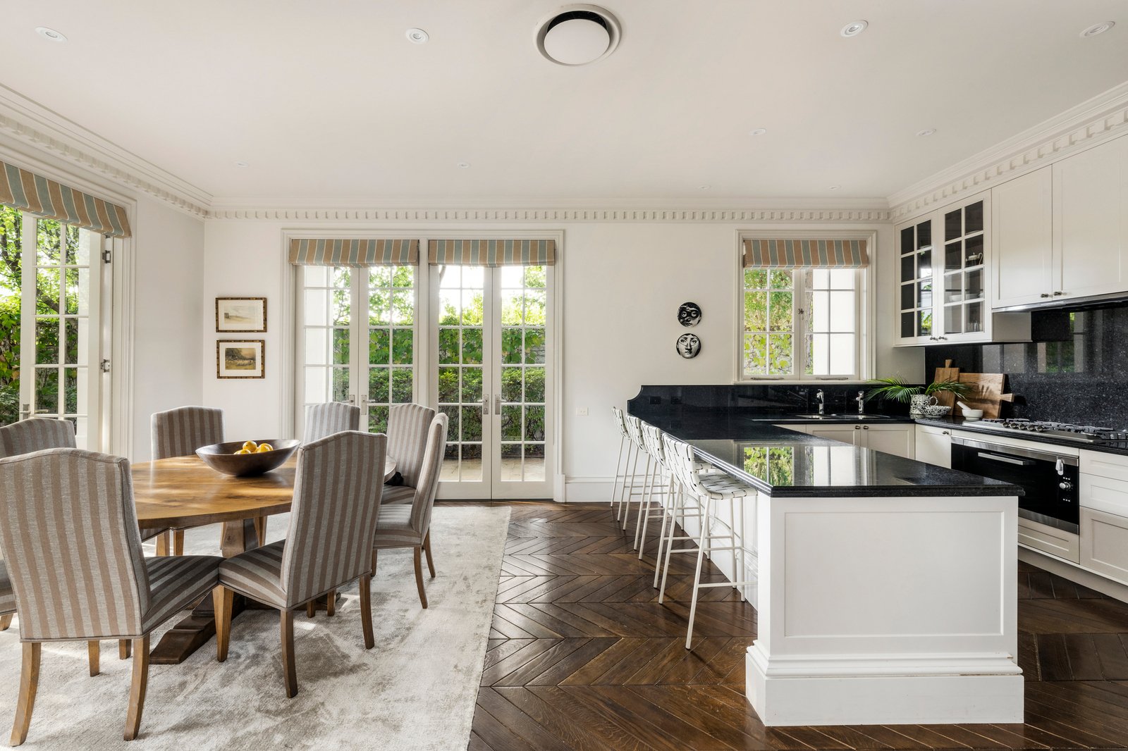 A wide gallery hall and foyer introduce richly toned chevron oak floors, ornate cornicing, and impressive ceiling heights, creating an immediate impact that continues through the expansive living domains. A gas fire adds warmth alongside custom storage and a sitting area, adjoining a separate dining room and a granite-appointed kitchen with a full suite of Miele appliances, including an integrated espresso machine. French doors from each space draw the living zones outward to the striking entertainer’s terrace, encouraging a natural indoor-outdoor flow for entertaining set beside a tranquil water feature and elevated, irrigated gardens.