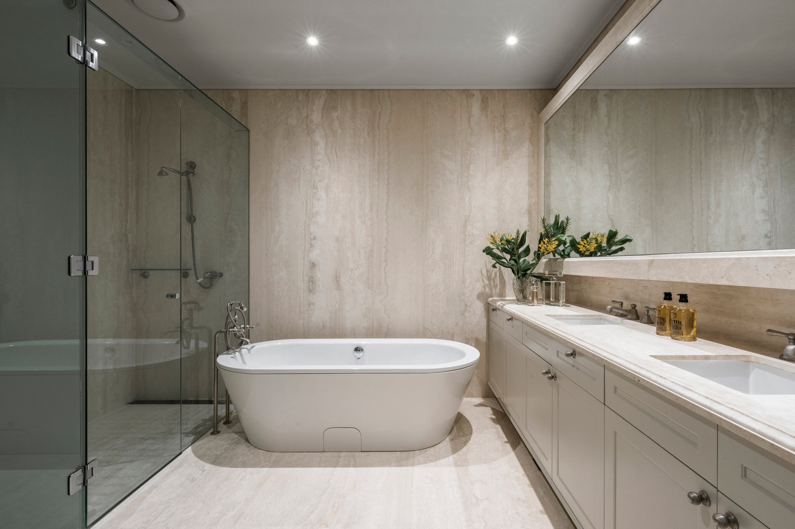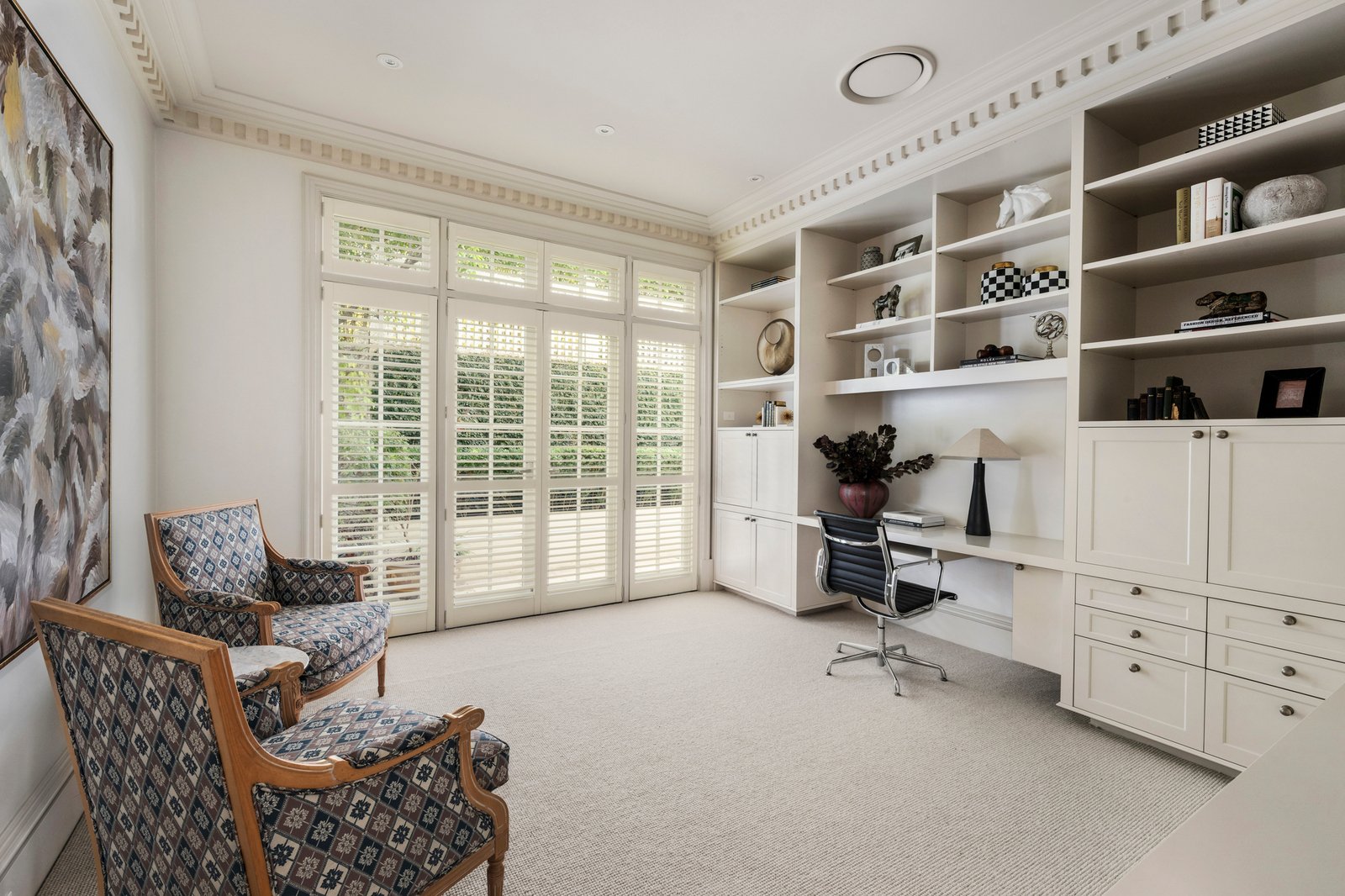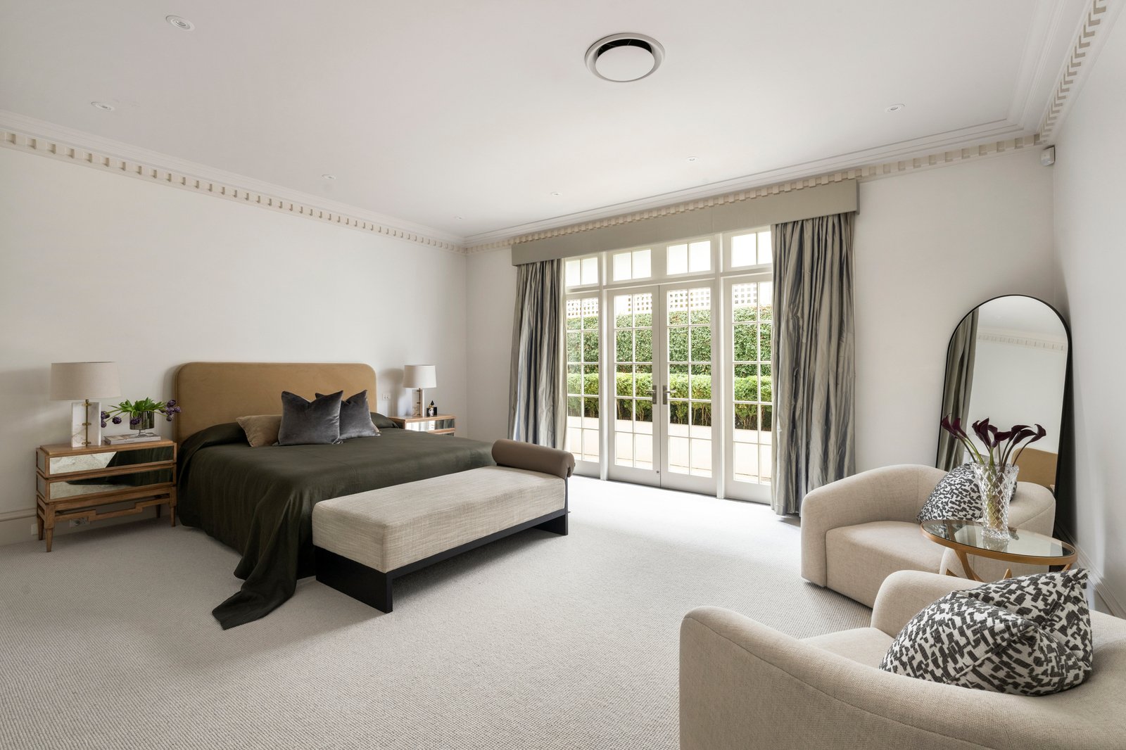Generous accommodation includes a lavishly sized main bedroom with terrace access, a dressing room lined with mirrored robes, and a deluxe ensuite with a freestanding bath. Two additional bedrooms also open to private courtyards and feature built-in robes and equally stunning en-suites, whilst an executive study with custom joinery adds further flexibility. With all principal rooms opening to the outdoors.