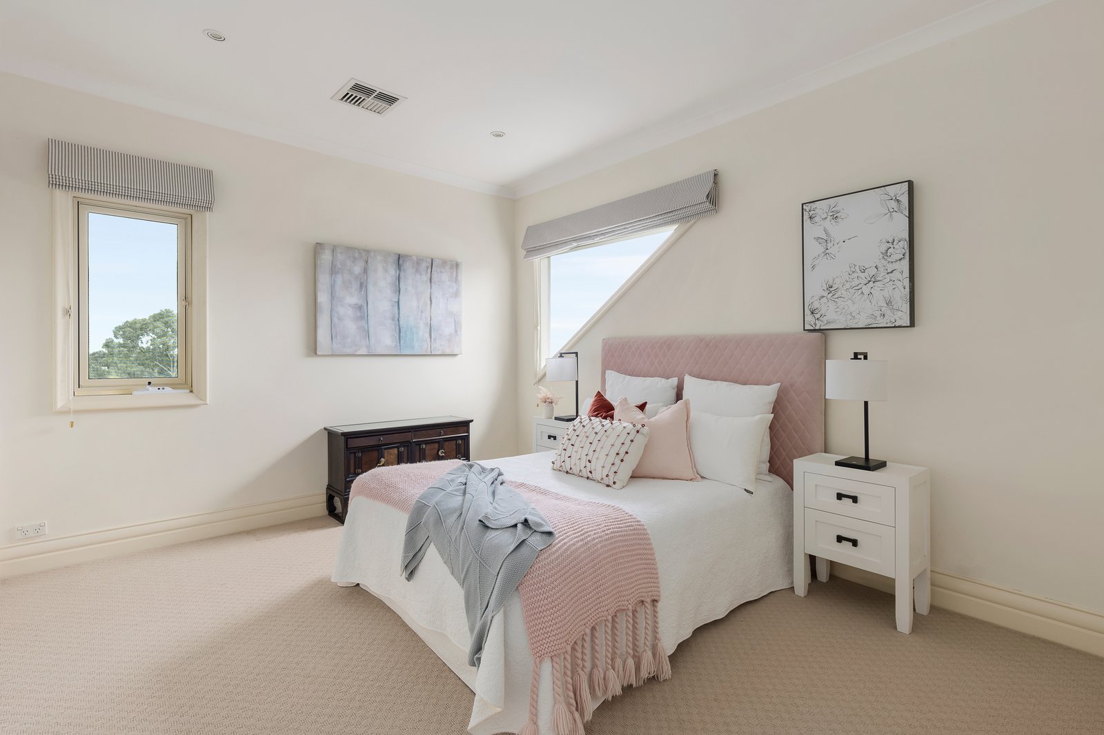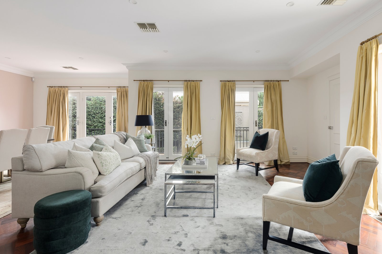 Step through the grand entryway into light-filled formal living and dining spaces, where gleaming parquetry floors and a tranquil courtyard garden with a water feature set the tone for refined entertaining. The heart of the home is the gourmet kitchen, featuring Smeg appliances, and a sun-drenched open-plan family area that spills out to your landscaped rear garden – the ideal space for relaxation.