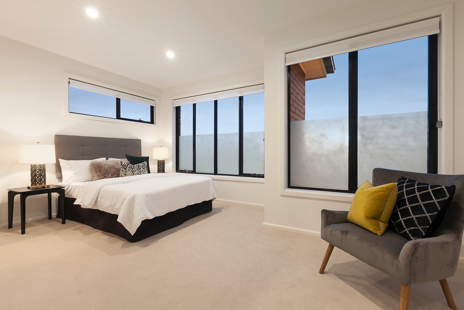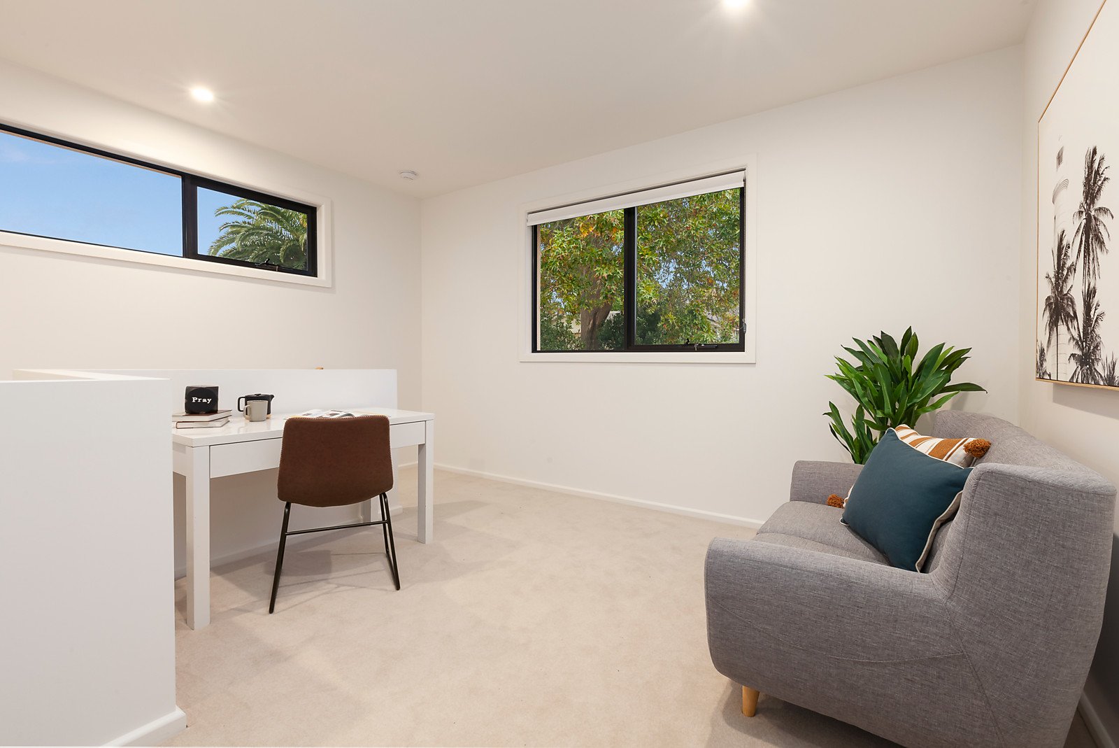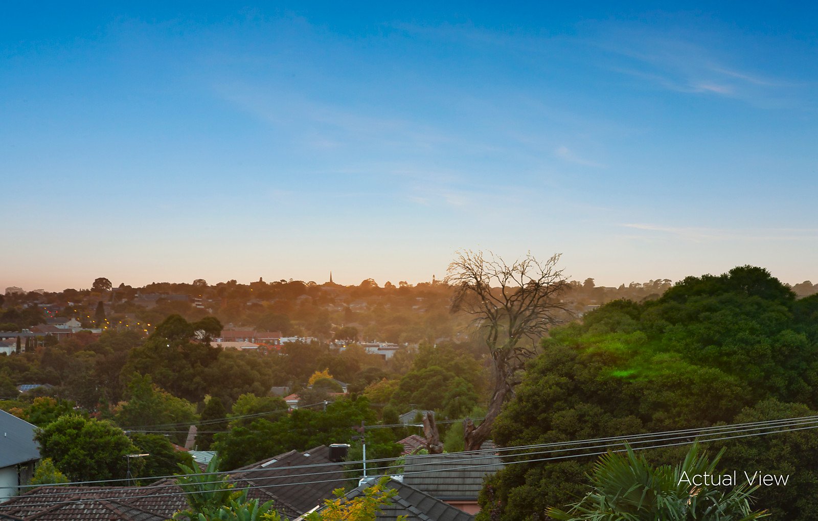 Set peacefully at the rear of just two, the wide entrance hall introduces an exceptionally spacious and light-filled living and dining room with a sleek gourmet kitchen appointed with stone benches and Bosch appliances. The living area opens to a private northeast facing deck, ideal for al fresco dining. A beautiful downstairs bedroom with walk in/built in robes and a stylish bathroom opens to a deck and the private leafy northwest garden. Upstairs there is a retreat, expansive main bedroom with large walk in robe and views to the Dandenongs, a third double bedroom with robe and a lavish shared en suite.