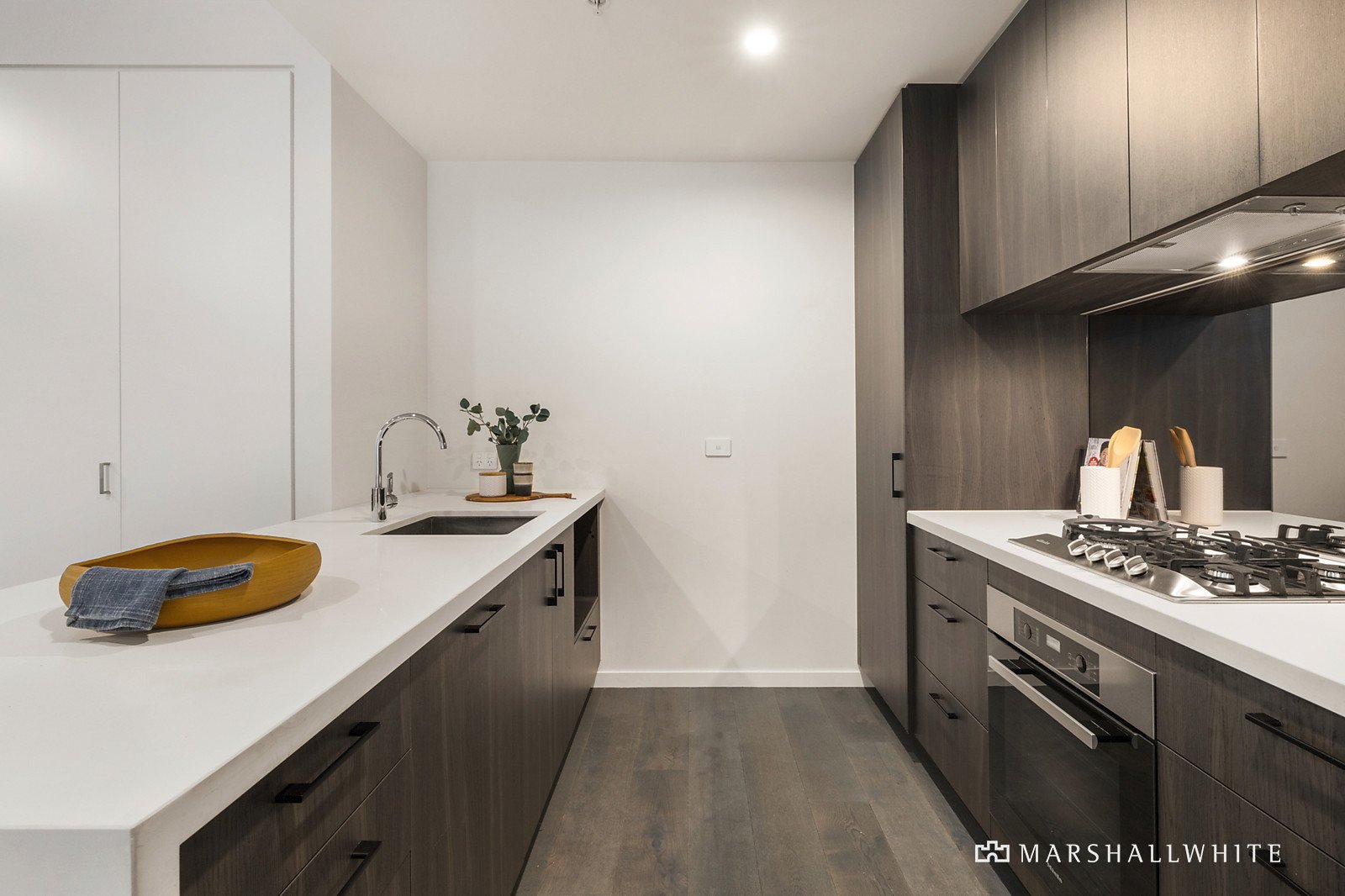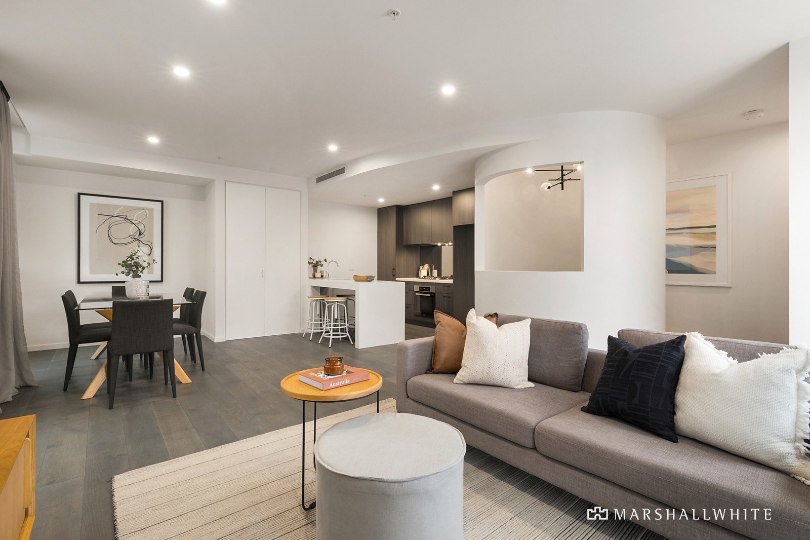 Secure gated intercom entry leads to a stylish interior, complete with sleek timber floors, plush carpet and a host of high-end finishes. A natural interior palette and white walls create a chic ambience and the open plan living zone features a formal dining area and casual breakfast bar, with Miele appointments in the kitchen, and vast doors that open to a sun terrace that floods the space with morning light.