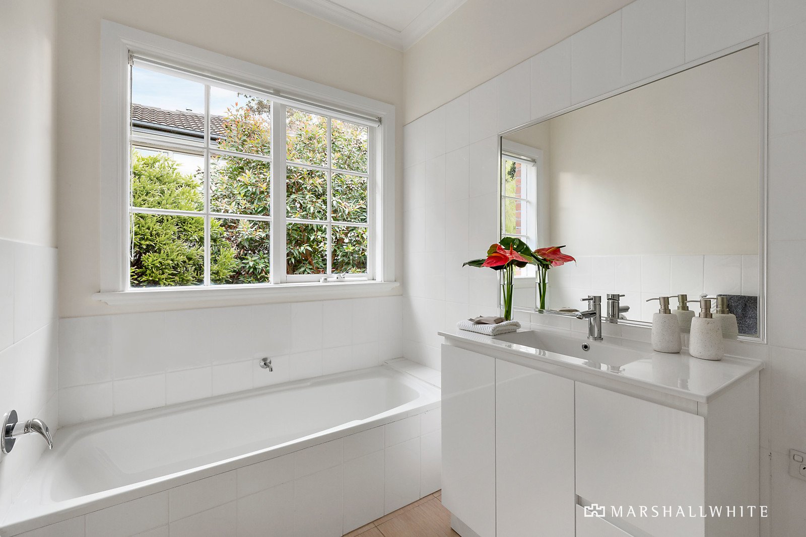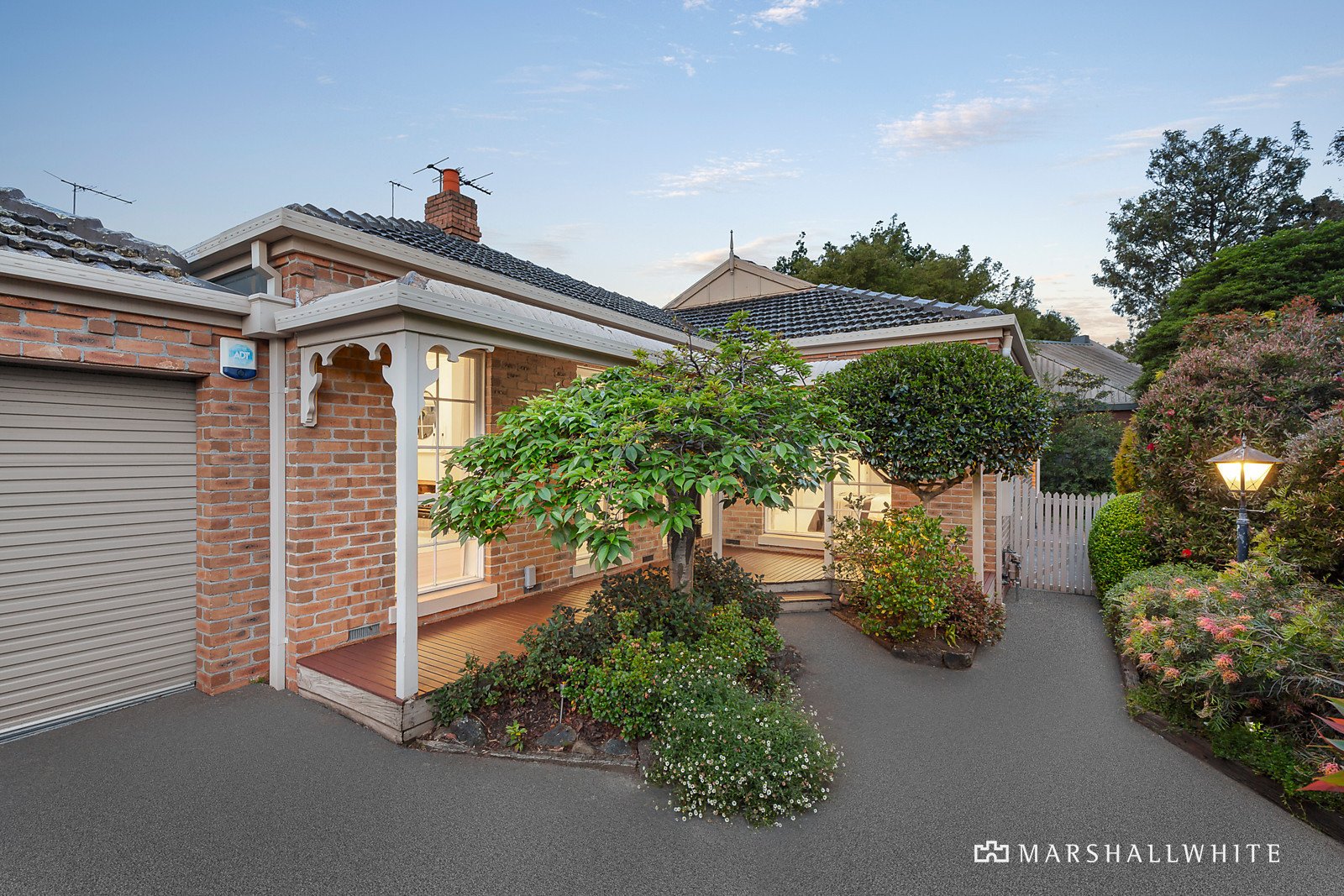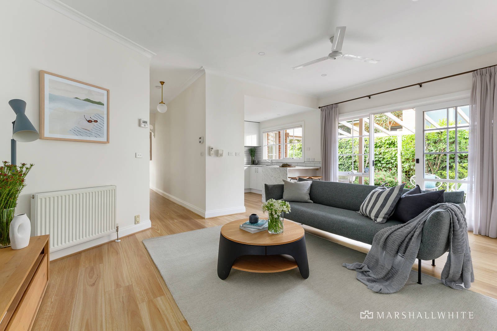 Sleek engineered timber floors add a contemporary refinement to the entrance hall, gracious sitting room with a gas log fire and the elegant formal dining room, all radiating with northern light. The modern kitchen, superbly appointed with European appliances, breakfast bar and the casual living/dining area open to a large north-facing entertaining deck with private picturesque gardens on three sides including lawn and paved zones. The generous main bedroom with en suite and walk in robe is accompanied by two additional double bedrooms with robes and a bright bathroom with bath and separate toilet.