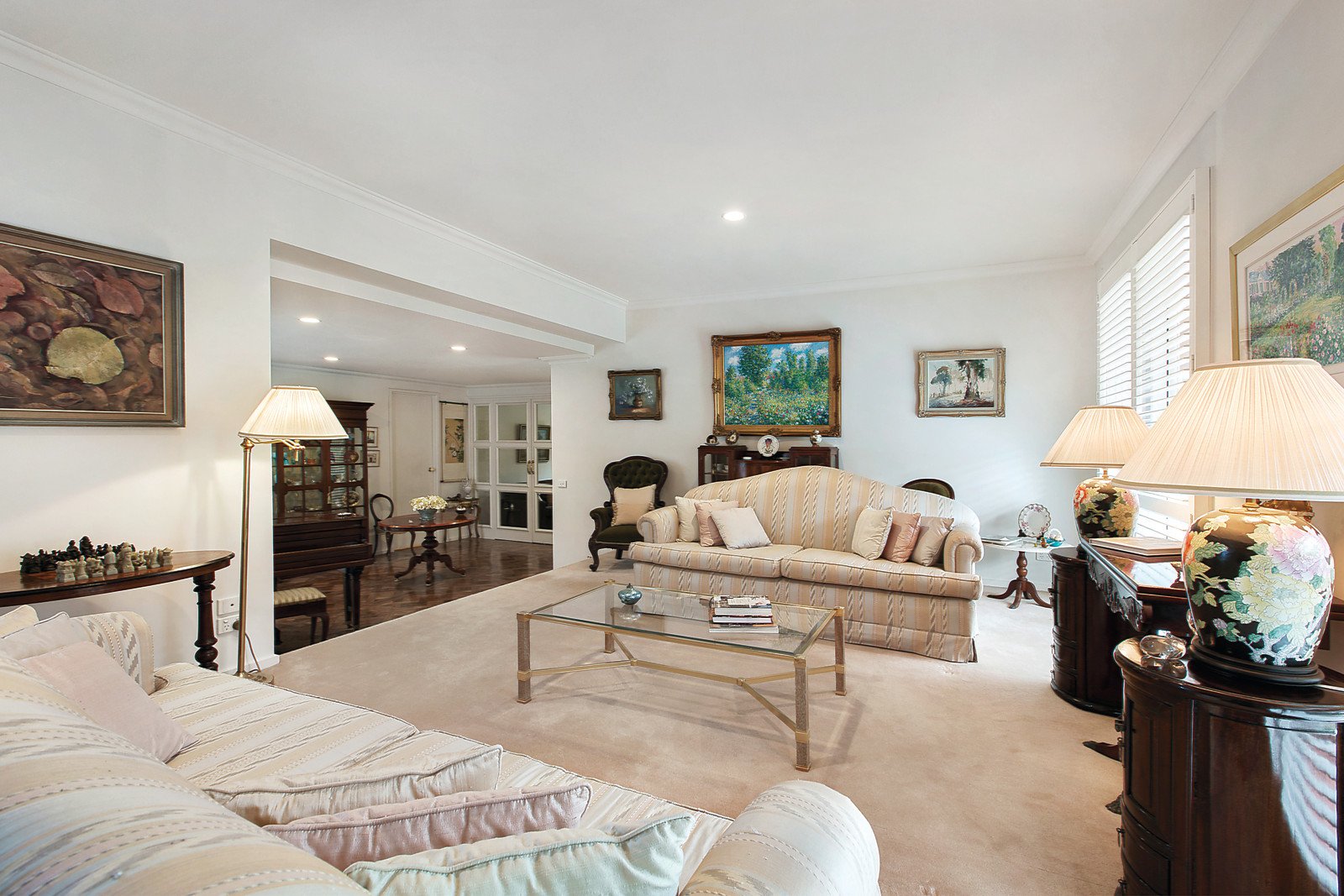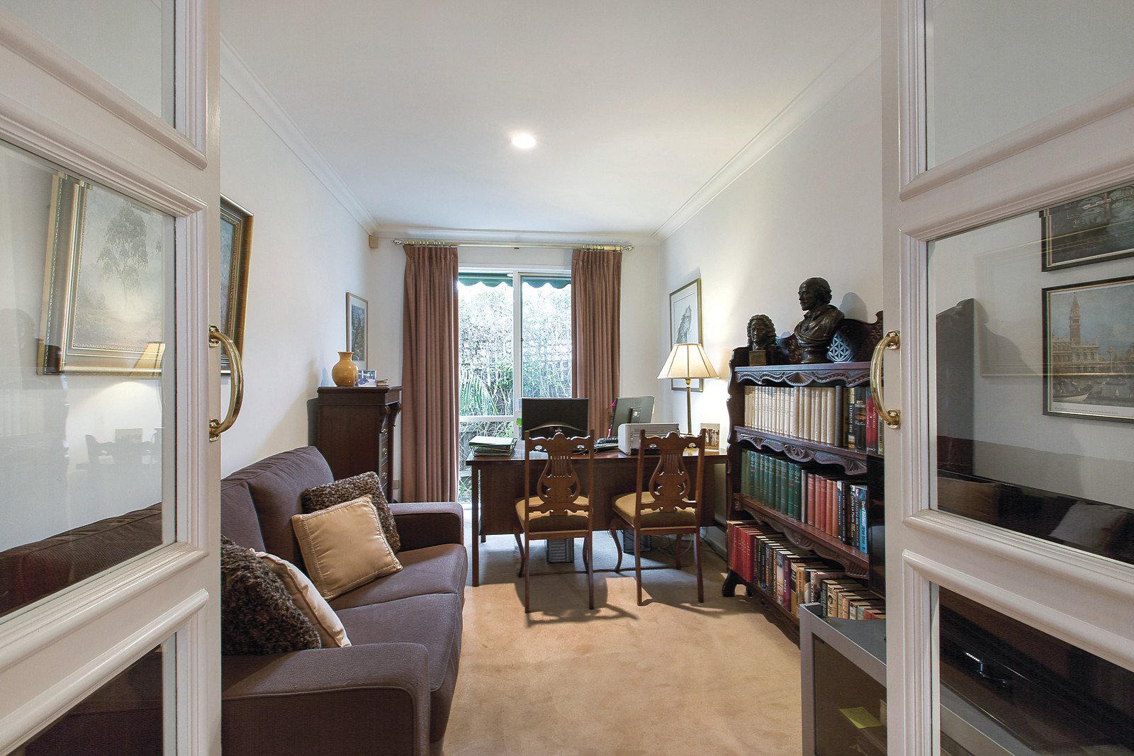 The elegant interior is highlighted by a wide entrance foyer with beautiful soft European parquetry floors opening to a study or possible third bedroom, generous formal sitting room overlooking a northern garden and flowing to well-appointed central CaesarStone and Euro kitchen plus dining. Enhanced by a covered deck to the side and a rear terrace providing ideal indoor/outdoor entertaining areas for year round enjoyment - the rear protected by leafy ornamental trees and a courtyard garden. In addition there are two separately zoned bedrooms, main with WIR and ensuite, a family bathroom and a separate laundry. Other features include alarm, voice intercom, ducted vacuum, ducted heating, split-system R/C air conditioners (3), external awnings over the deck and terrace, remote double garage with secure internal access and rear lane access to the garden if desired. Land size: 452sqm approx.