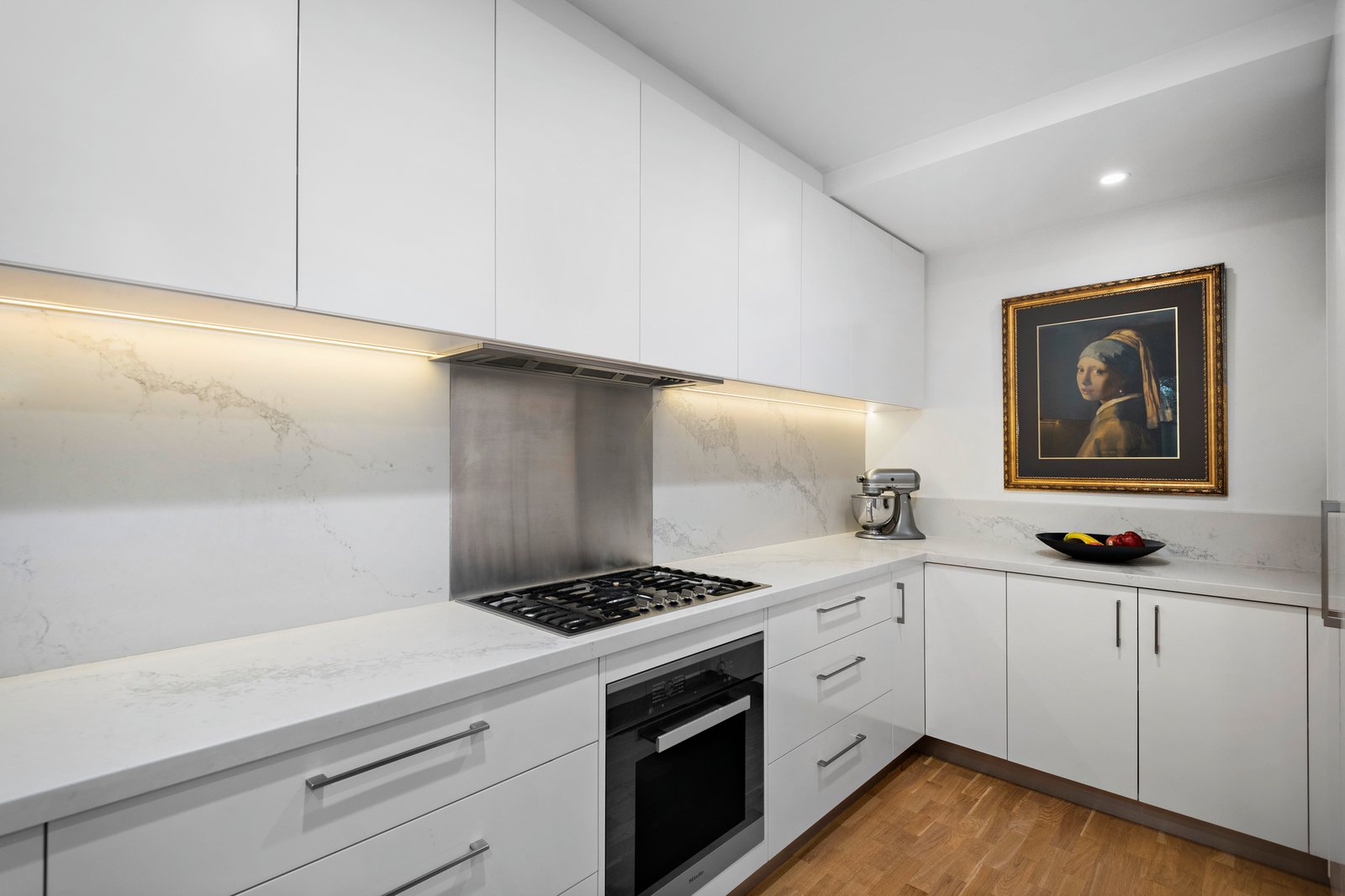 The two bedrooms are generously proportioned with substantial built-in robes where the main bedroom has a marble topped ensuite that is themed to the central bathroom - plus there are two secure basement parking spaces with elevator elevator access, as well as new Oak parquetry flooring, retractable fly screens, heated towel rail, garden lights, automatic watering system, secure video entry, alarm system and new reverse cycle heating/air conditioning.
