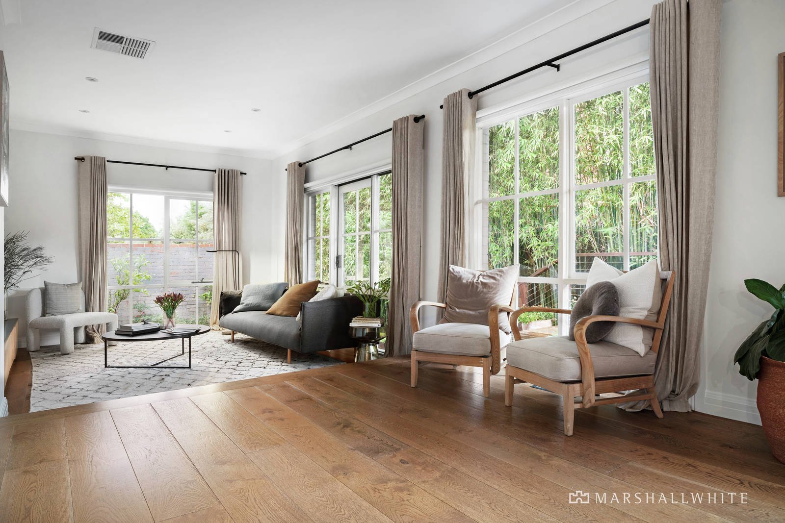 Framed by tranquil native gardens, the entrance hall features richly hued French oak floors which extend throughout and introduce expansive free-flowing living, sitting and dining areas served by a full-sized stylish modern kitchen equipped with De Longhi and Asko appliances encouraging intimate meals, or large extended family occasions inside or out. Featuring designer window furnishings, the living spaces open to private gardens on three sides including an extensive L-shaped deck perfect for entertaining, or just soaking up the sunshine. The generous main bedroom with ensuite and two built in robes is accompanied by two additional bedrooms, each with built in robes and a sizable family bathroom with all important bath.