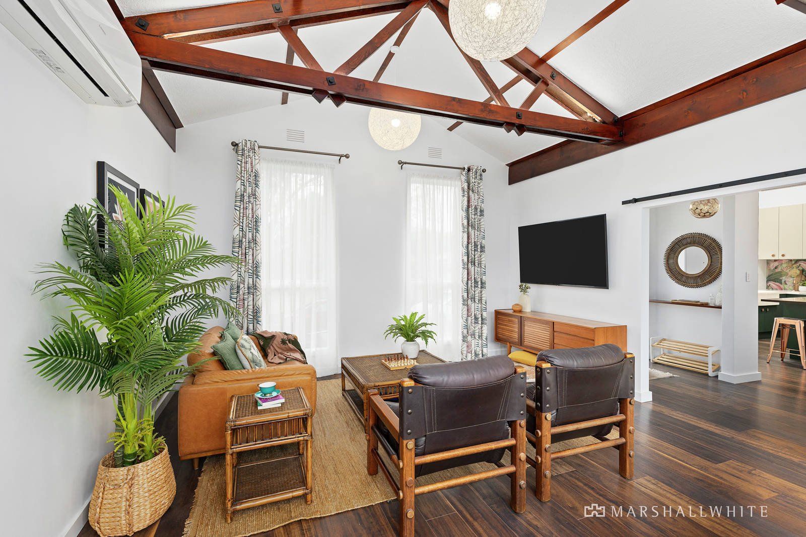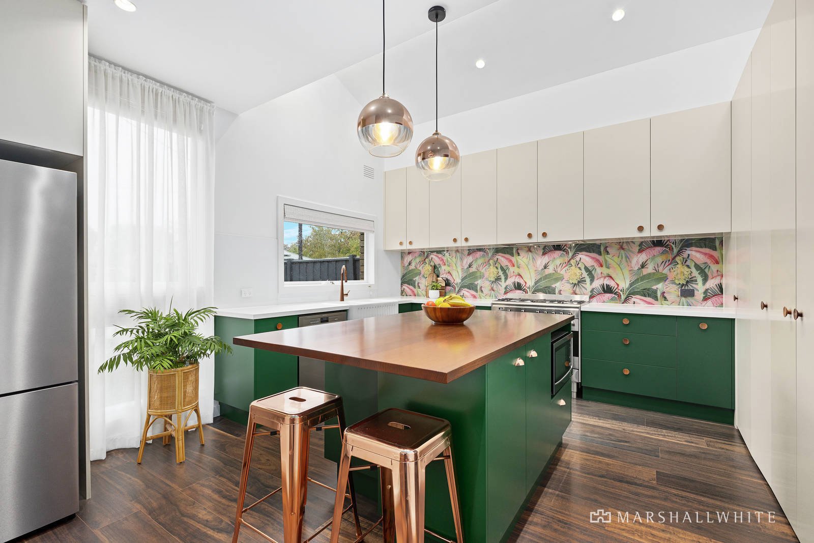 Under lofty, vaulted ceilings, the kitchen is organised around a welcoming, timber-topped island bench, while extensive stone working surfaces combine with SMEG appliances and a striking glass splash back to draw the eye, plus you have a lounge / dining that flows effortlessly through brilliant concertina doors to north-facing outdoor living. Meanwhile, a pair of vogue designer bathrooms are fully-tiled and certain to impress, plus there are generous built-in robes, an oversize lock-up garage, plantation shutters, split system heating and air conditioning.