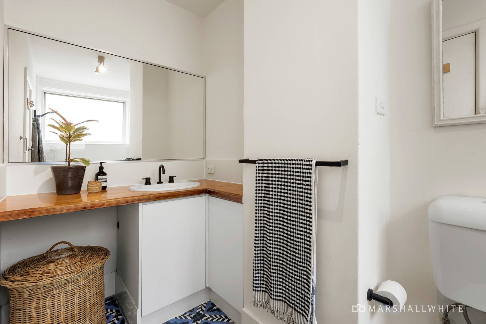 A large double bedroom with BIRs enjoys a quiet rear position with a smartly presented bathroom, conveniently featuring under bench laundry facilities.
